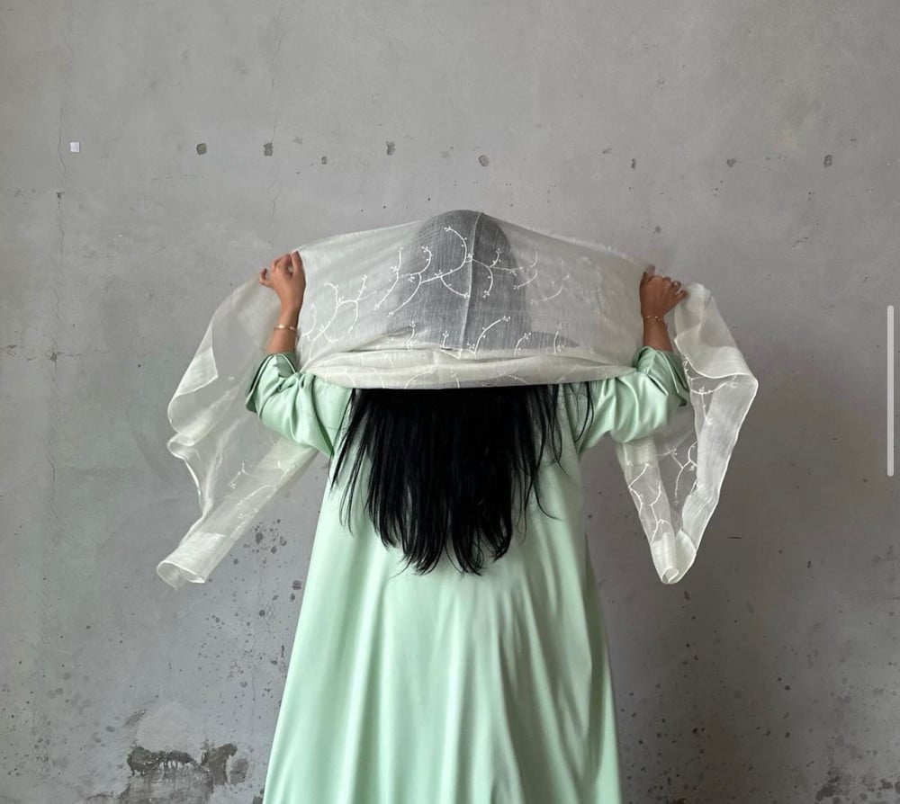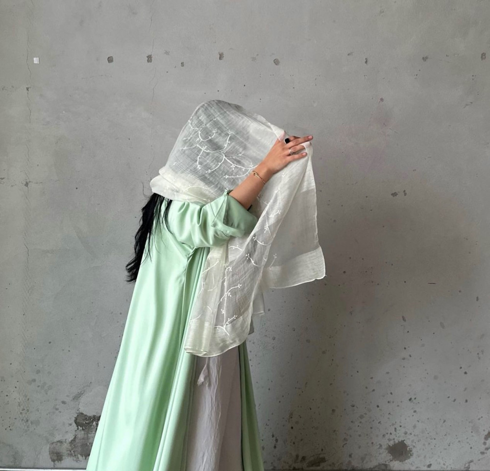 كريب اخضر فاتح / طرحه لينن مطرز ( لون الطرحه اخضر فاتح قريب من العبايه )