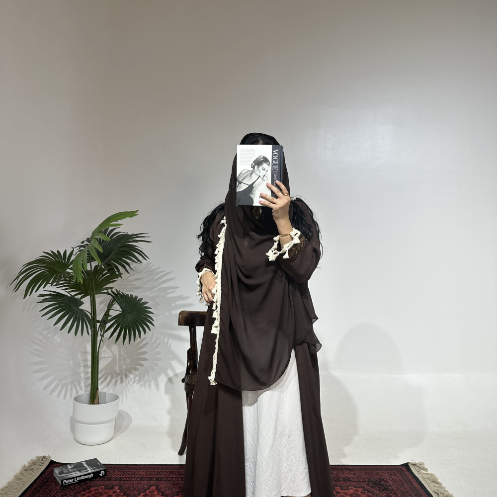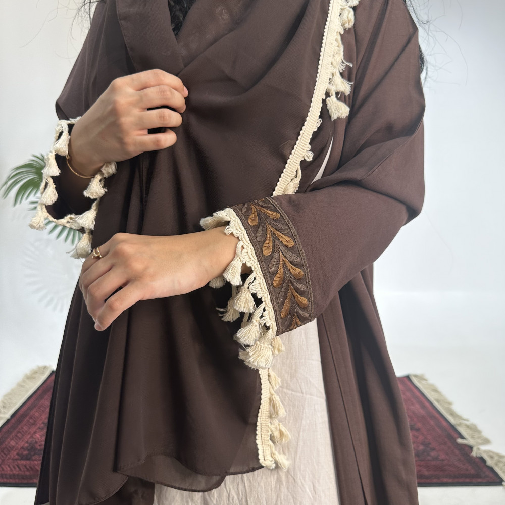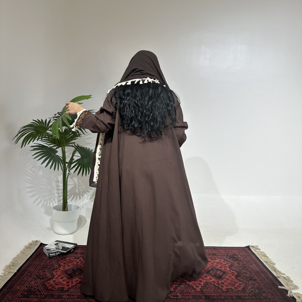 لينن مغسول بني / كلفه بتطريز بني وهدب / طرحه شيفون بني بهدب
