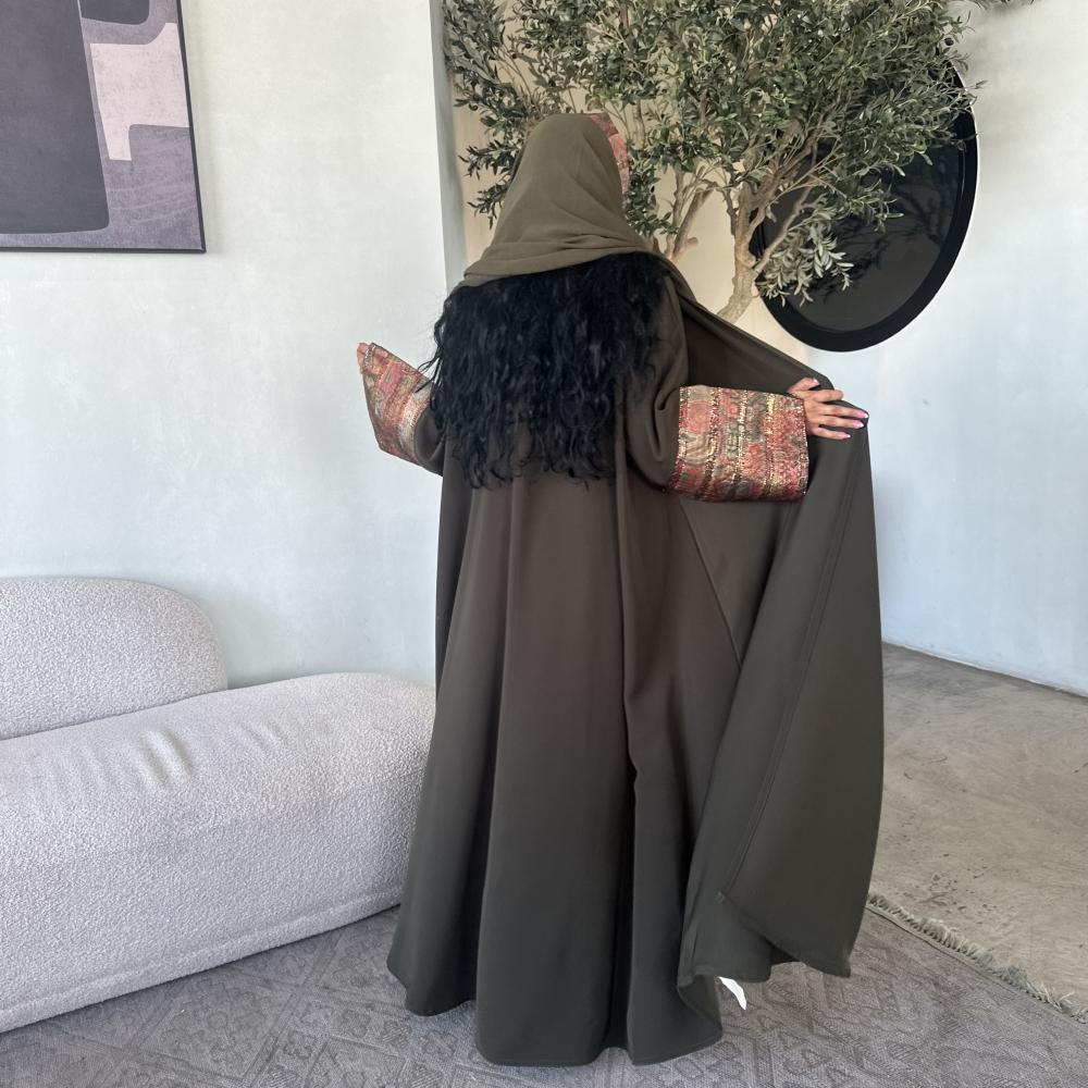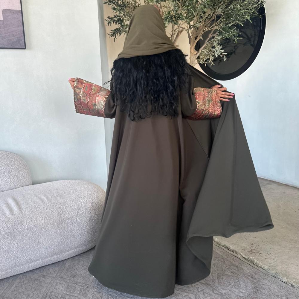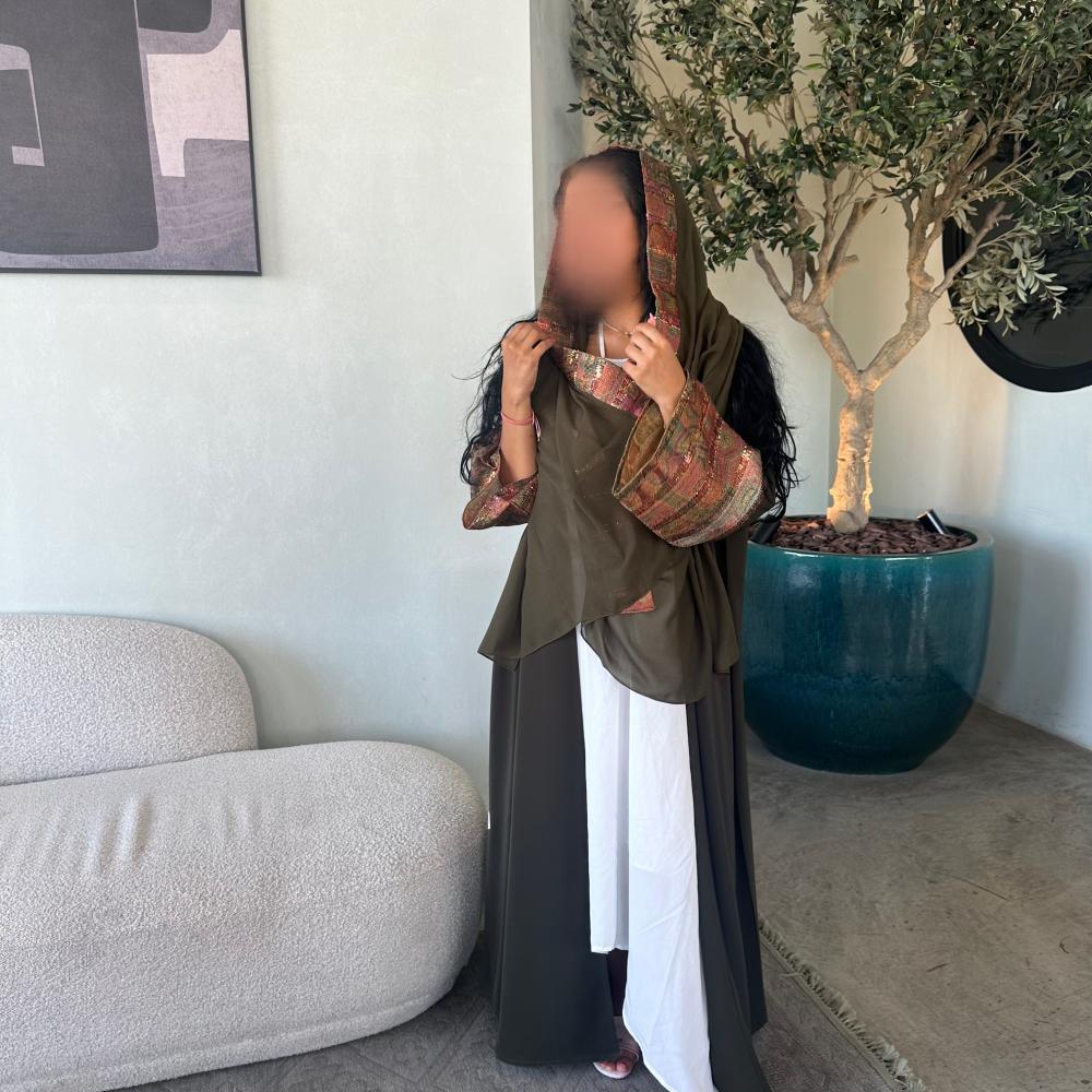 كريب ( زيتي ) / الكم تطريز هندي واقف مستورد / الطرحه شيفون بطرف نفس قماش الكم