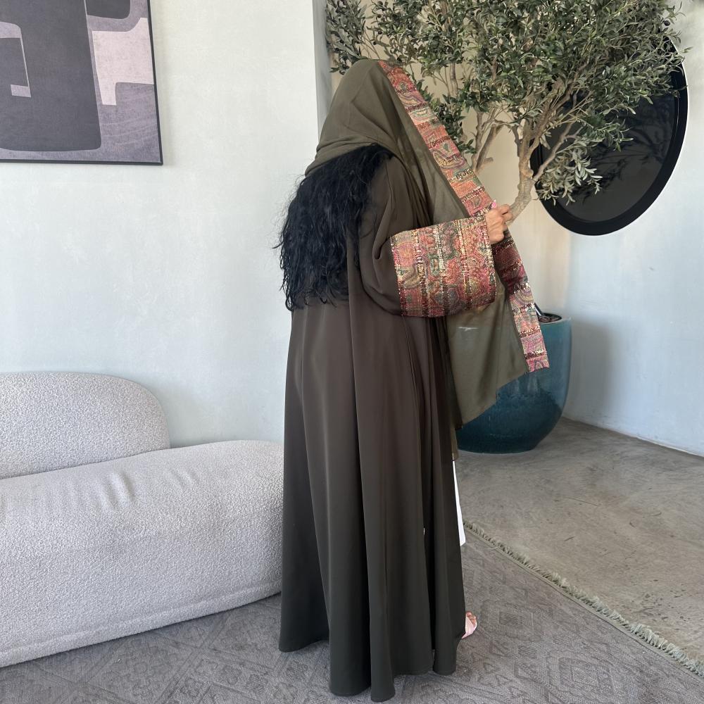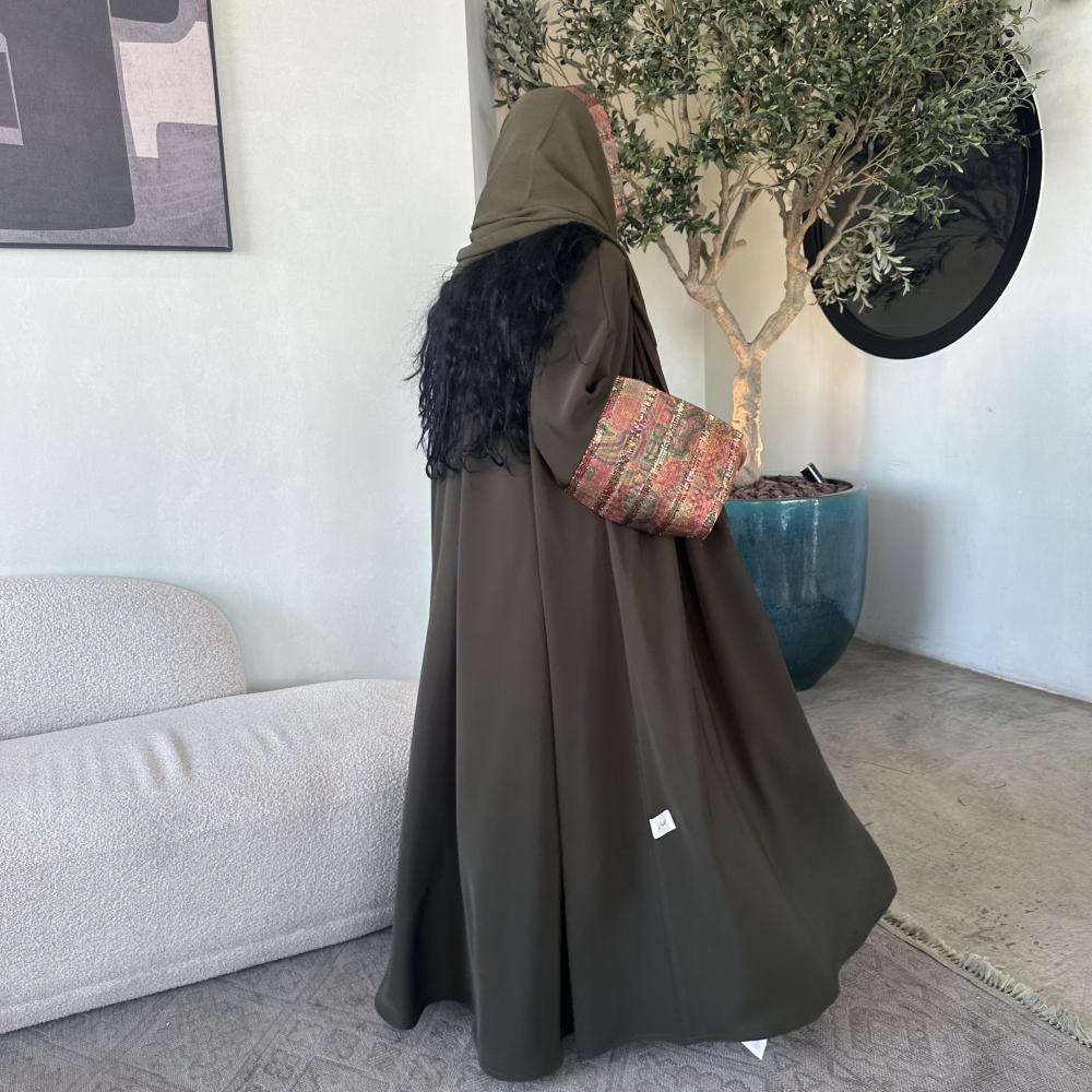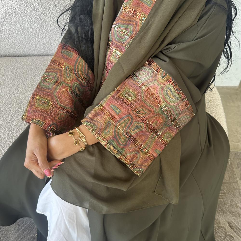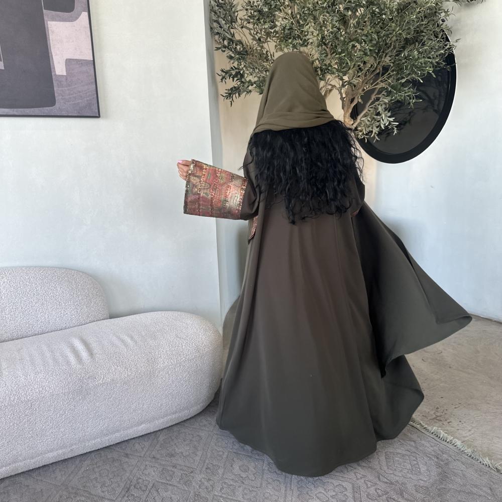 كريب ( زيتي ) / الكم تطريز هندي واقف مستورد / الطرحه شيفون بطرف نفس قماش الكم