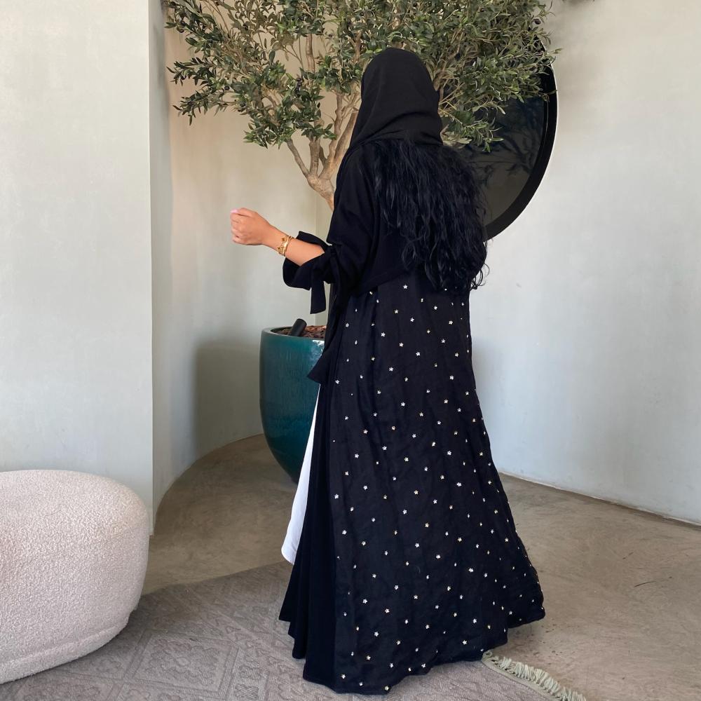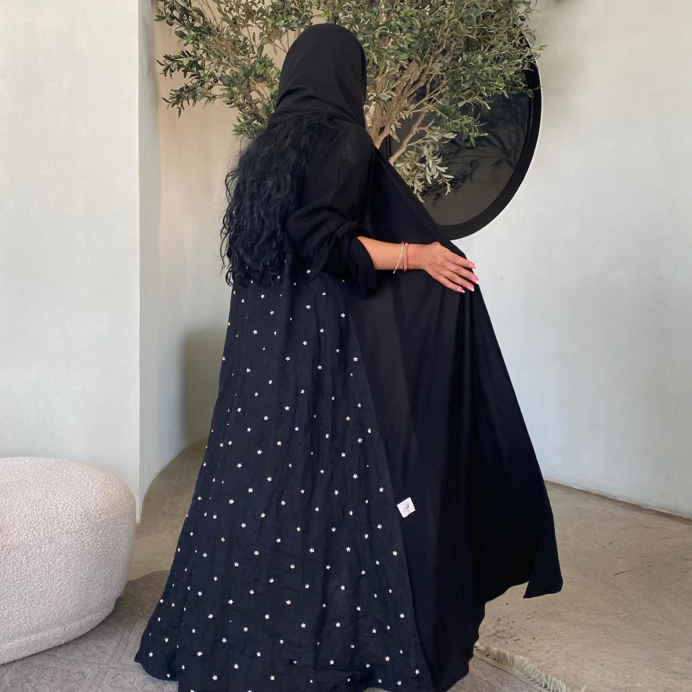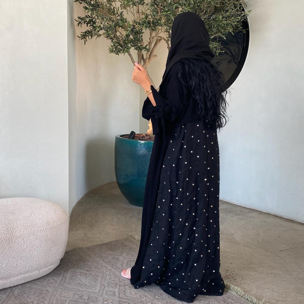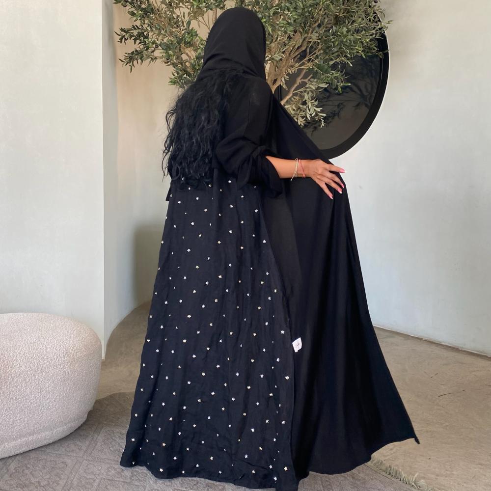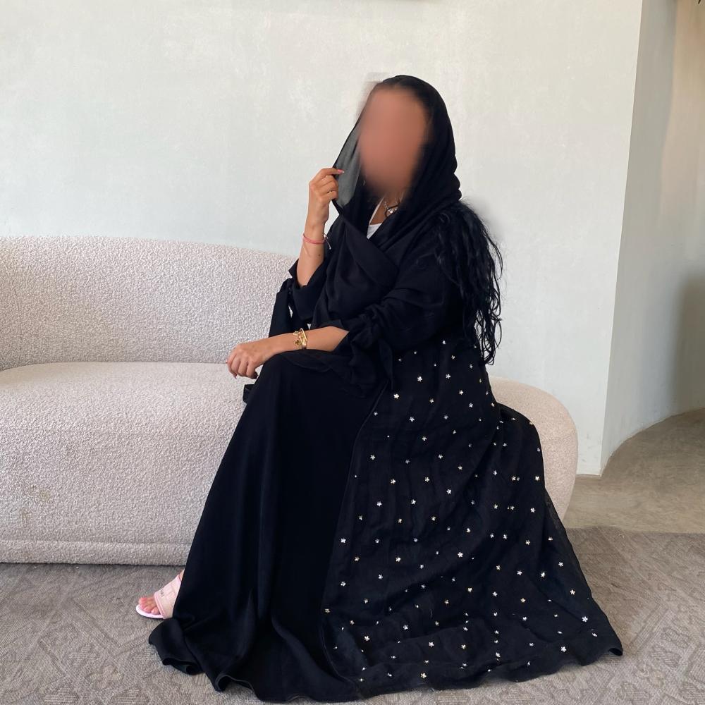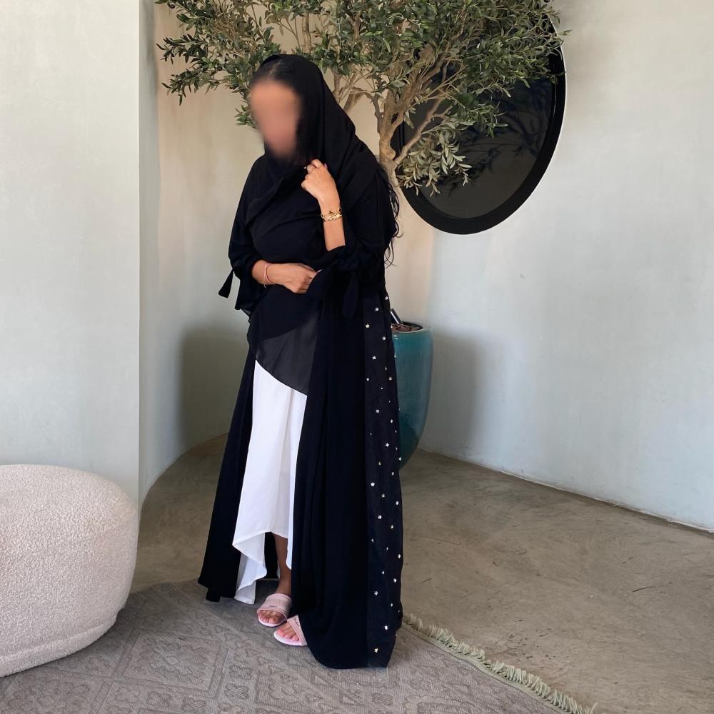 كريب اسود ملكي/ الكم ربطات ( مثبته) / من الخلف بوكس بقماش لينن مستورد ( بورود شك بارزه) مبطن / الطرحه شيفون ساده