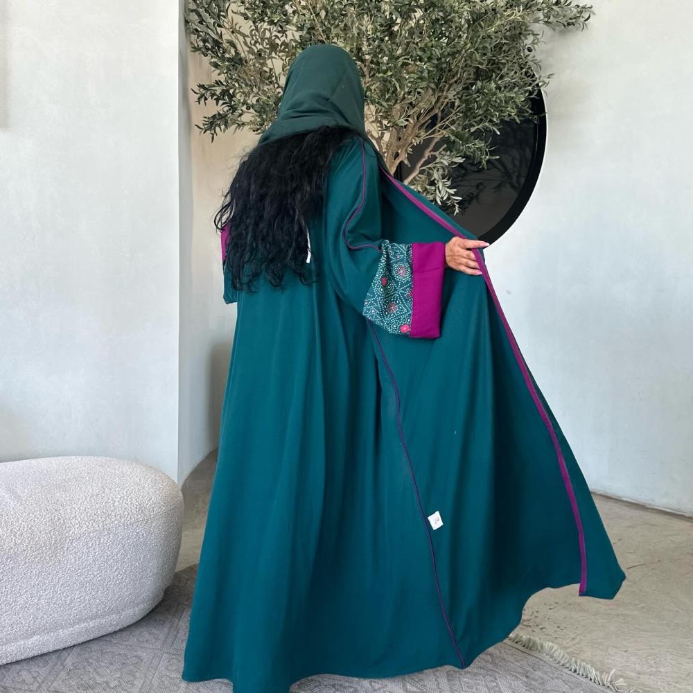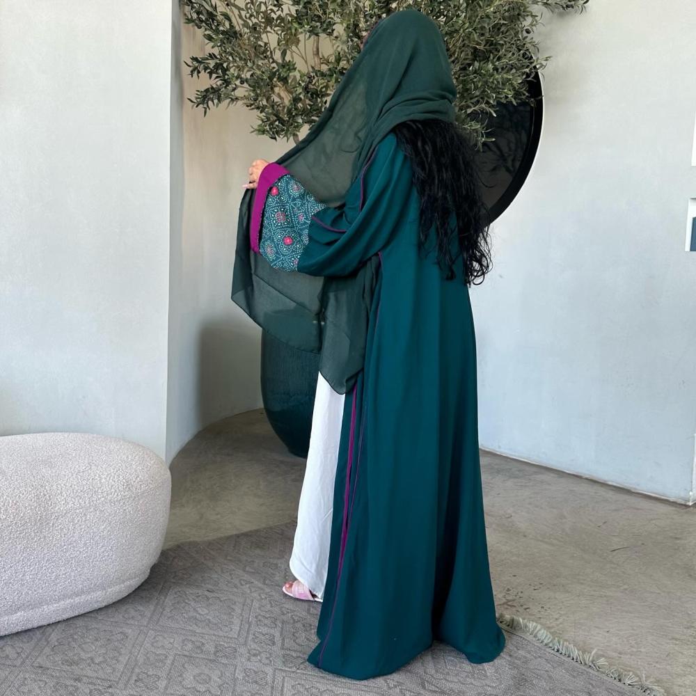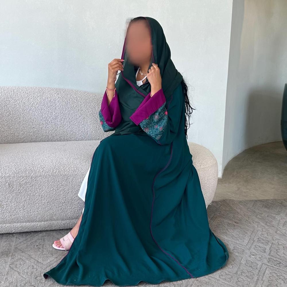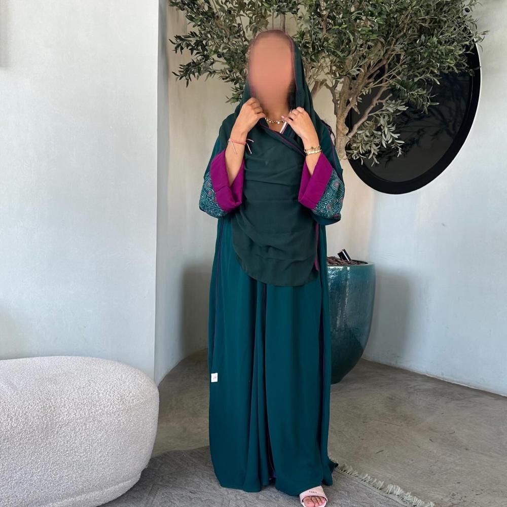 كريب اندويسي ( اخضر ) / الكم كريب طباعه مستورد مبطن بكريب اندويسي ( فوشي على موف ) / قيطان كامل العبايه / طرحه شيفون بقيطان