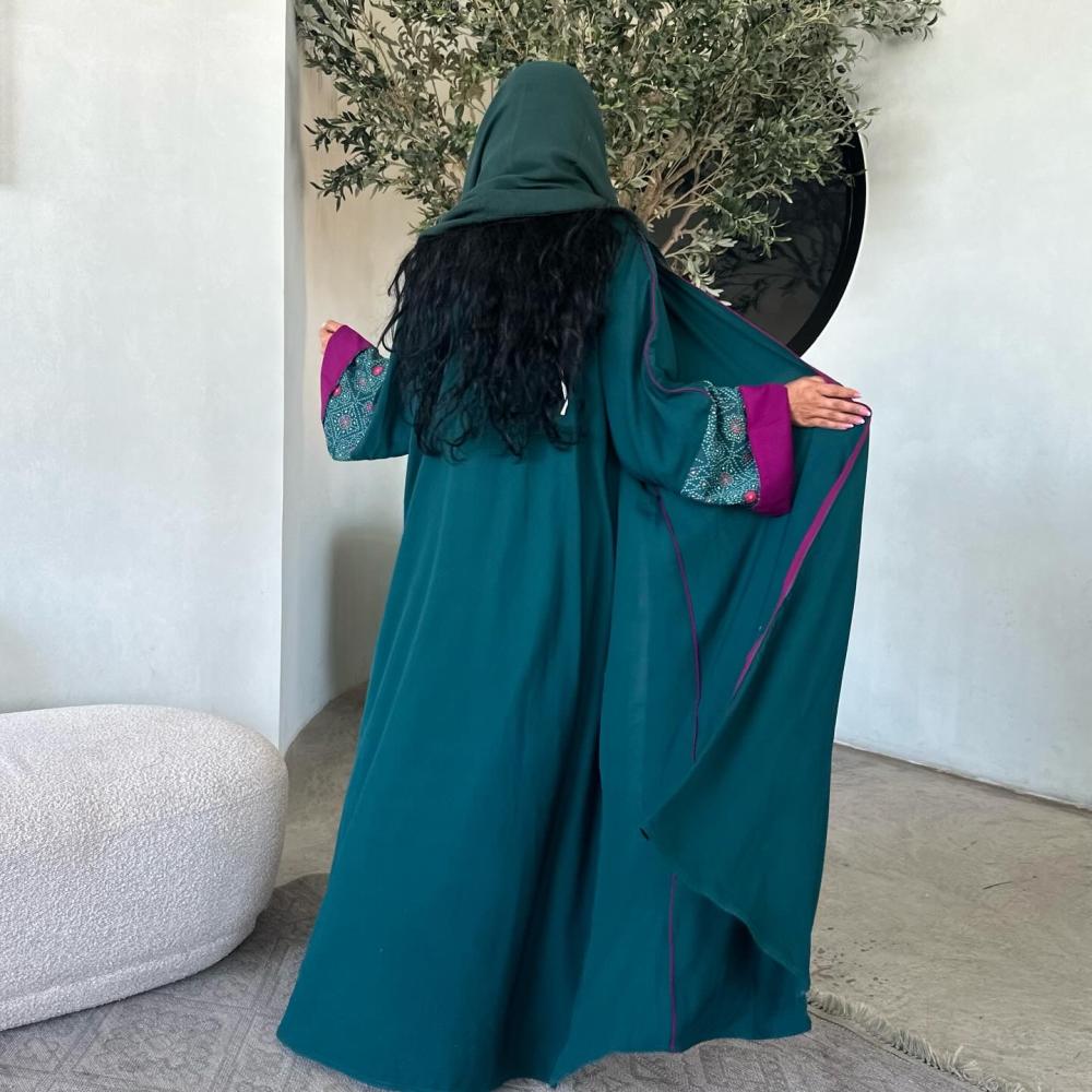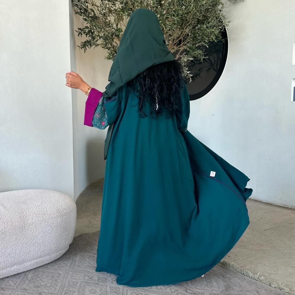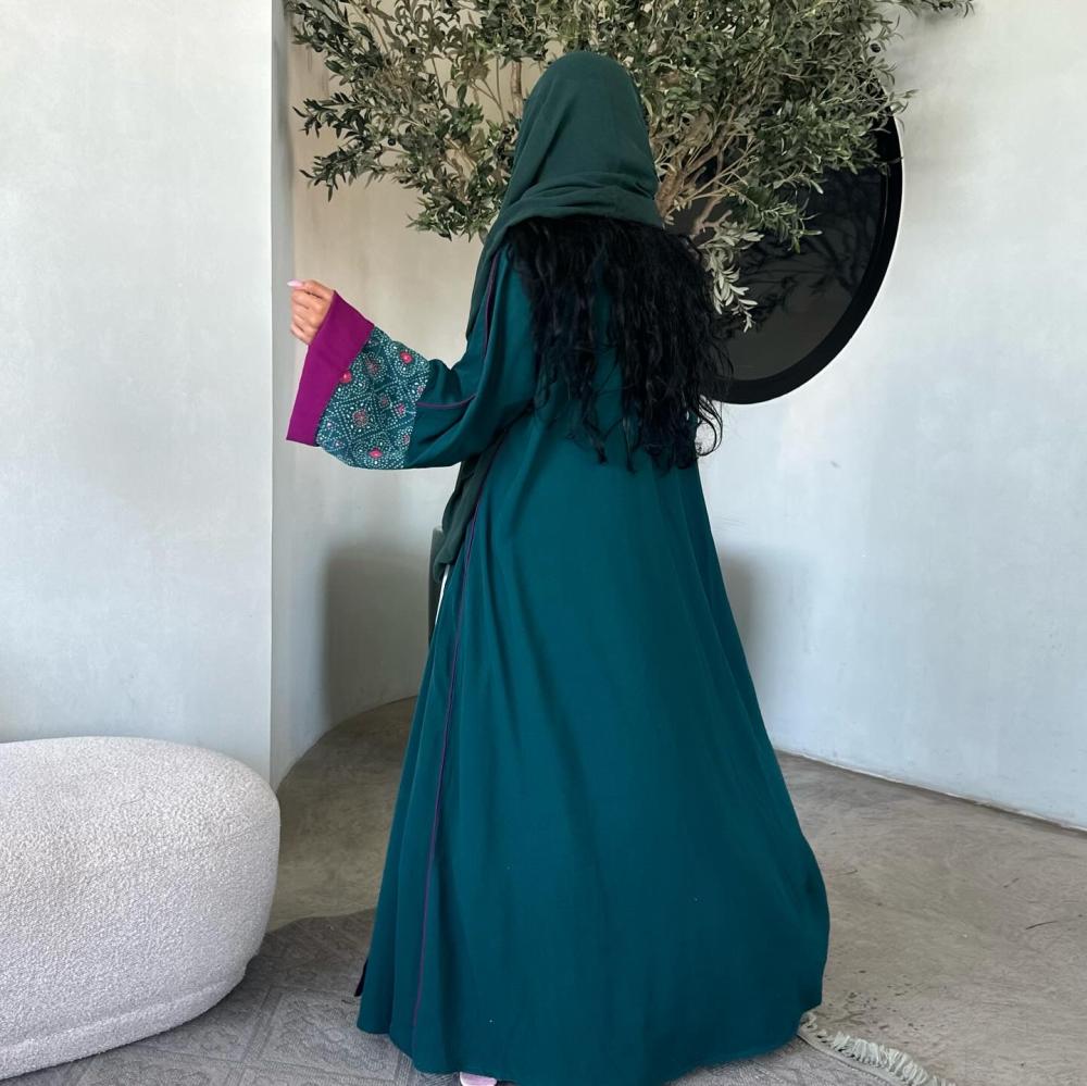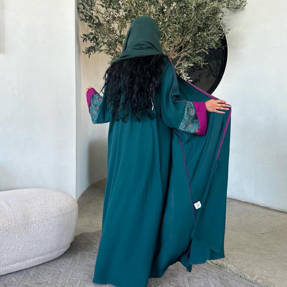 كريب اندويسي ( اخضر ) / الكم كريب طباعه مستورد مبطن بكريب اندويسي ( فوشي على موف ) / قيطان كامل العبايه / طرحه شيفون بقيطان