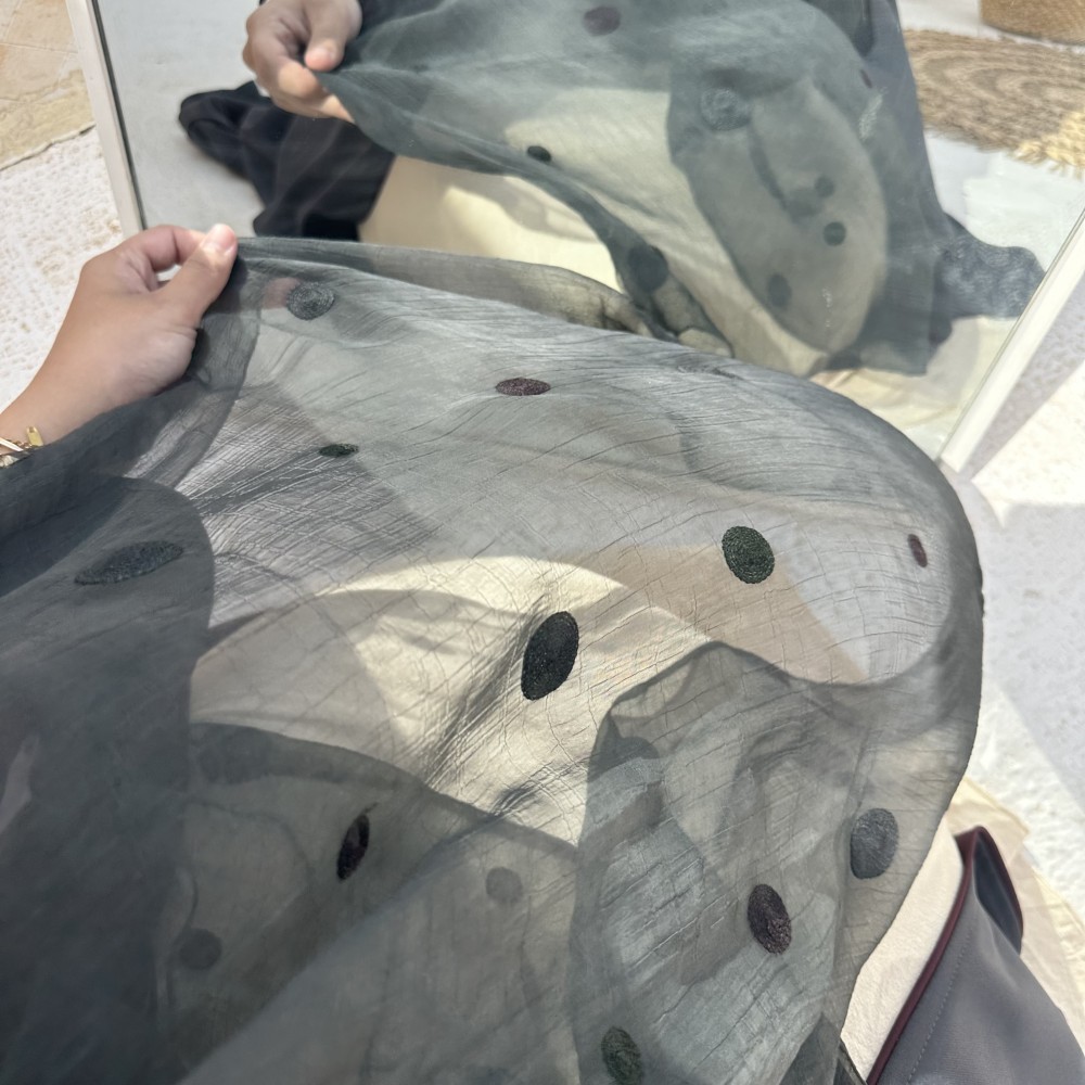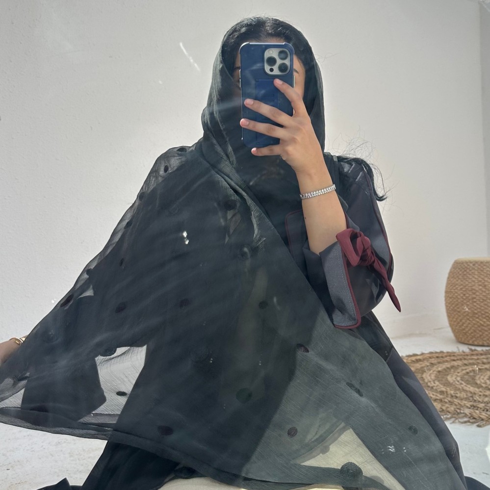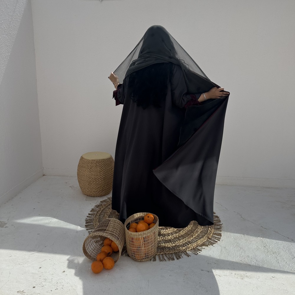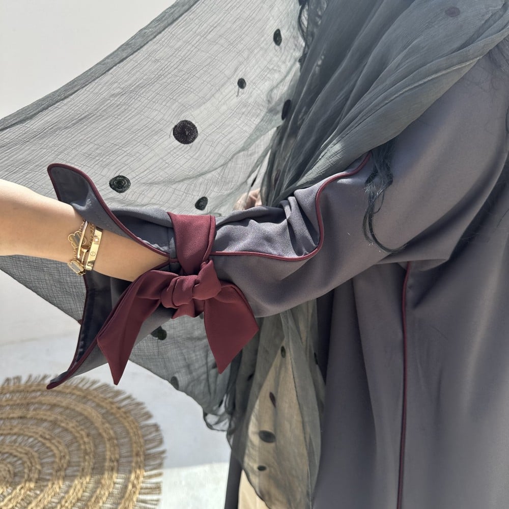 - كتان رمادي / قيطان عنابي / ربطه عنابيه ثابته/ طرحه شيفون مطرزه
