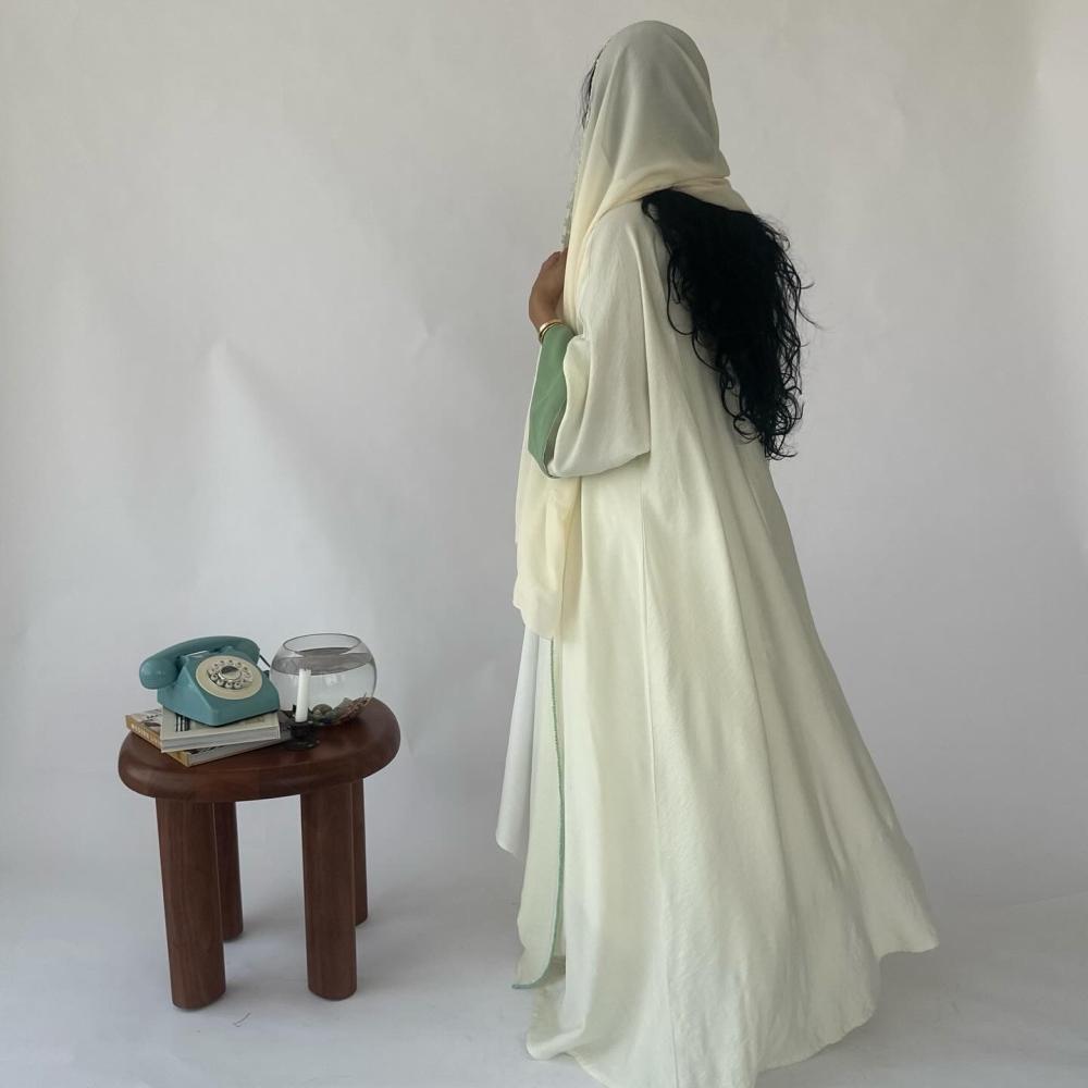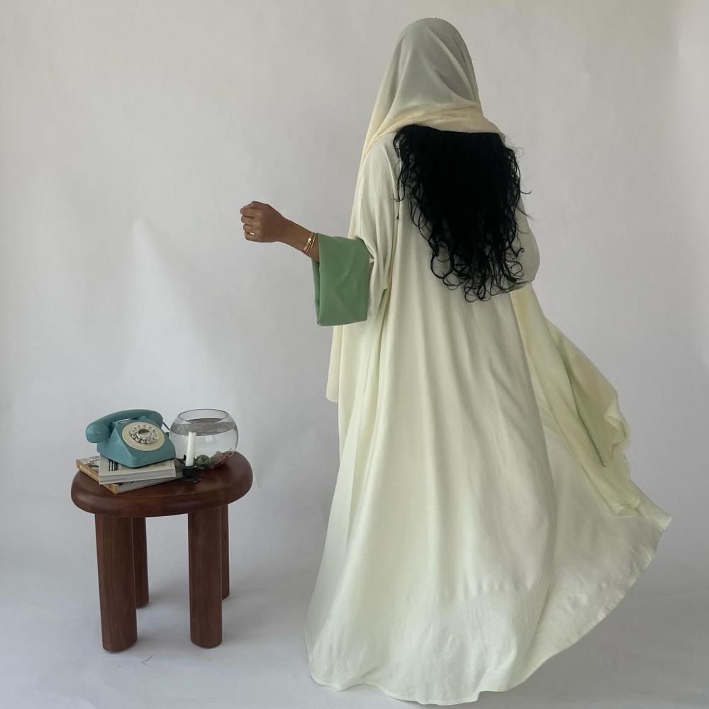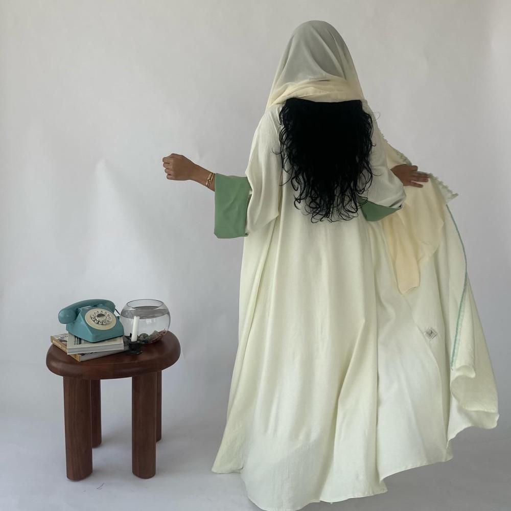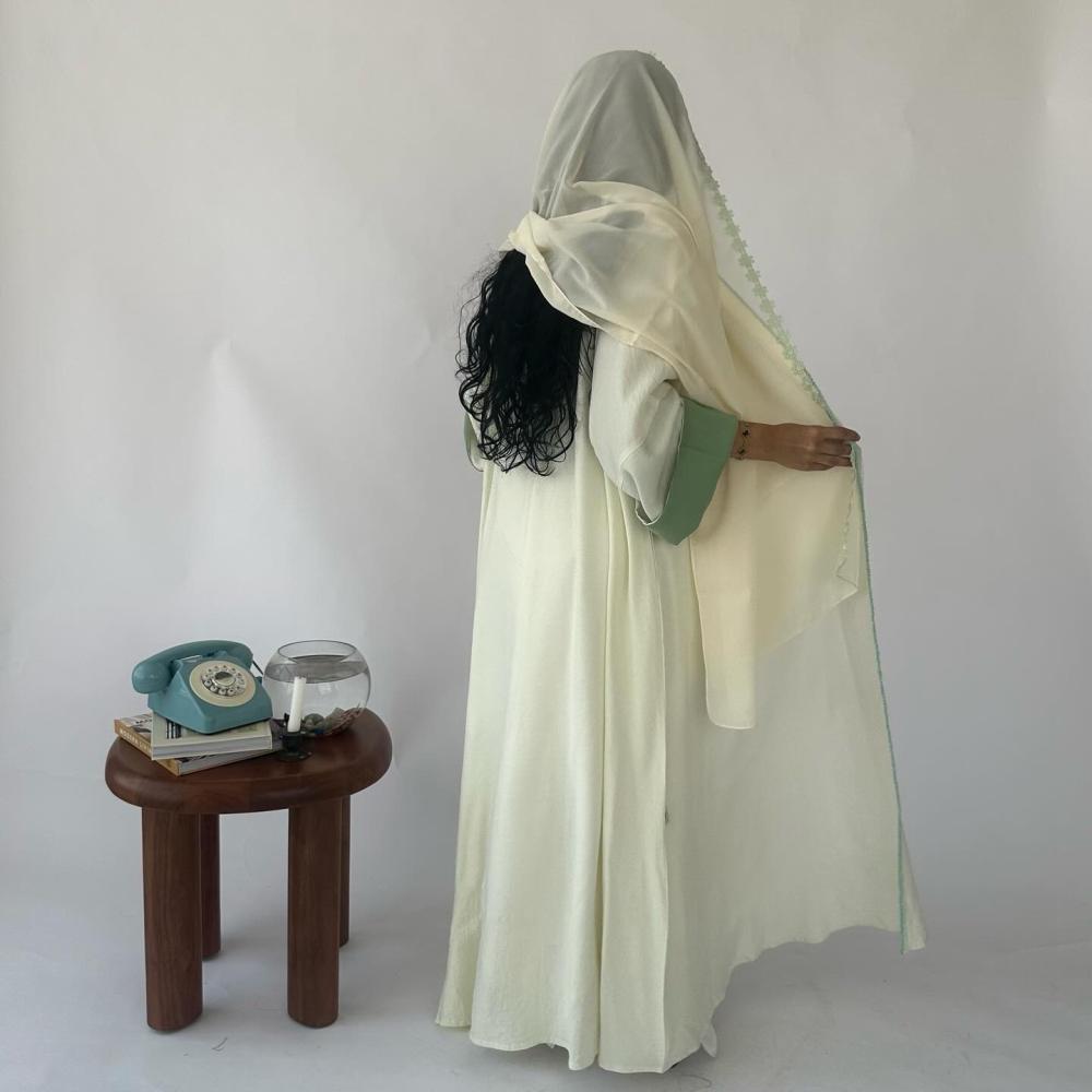 لينن مغسول ليموني فاتح | الكم كريب من الداخل | قيطان كامل العبايه | كلفه من الجهتين الاماميه | طرحه شيفون بكلفه ورود