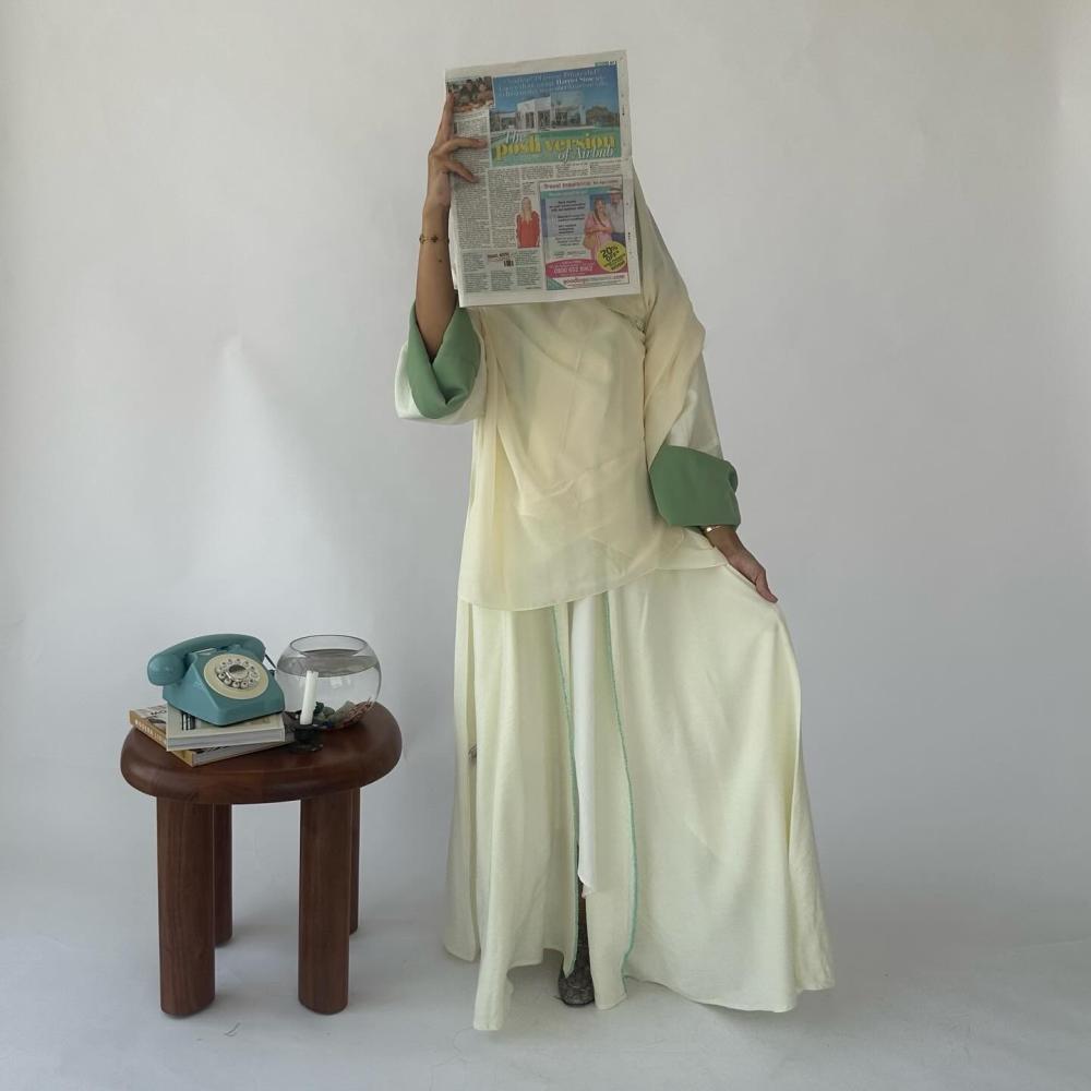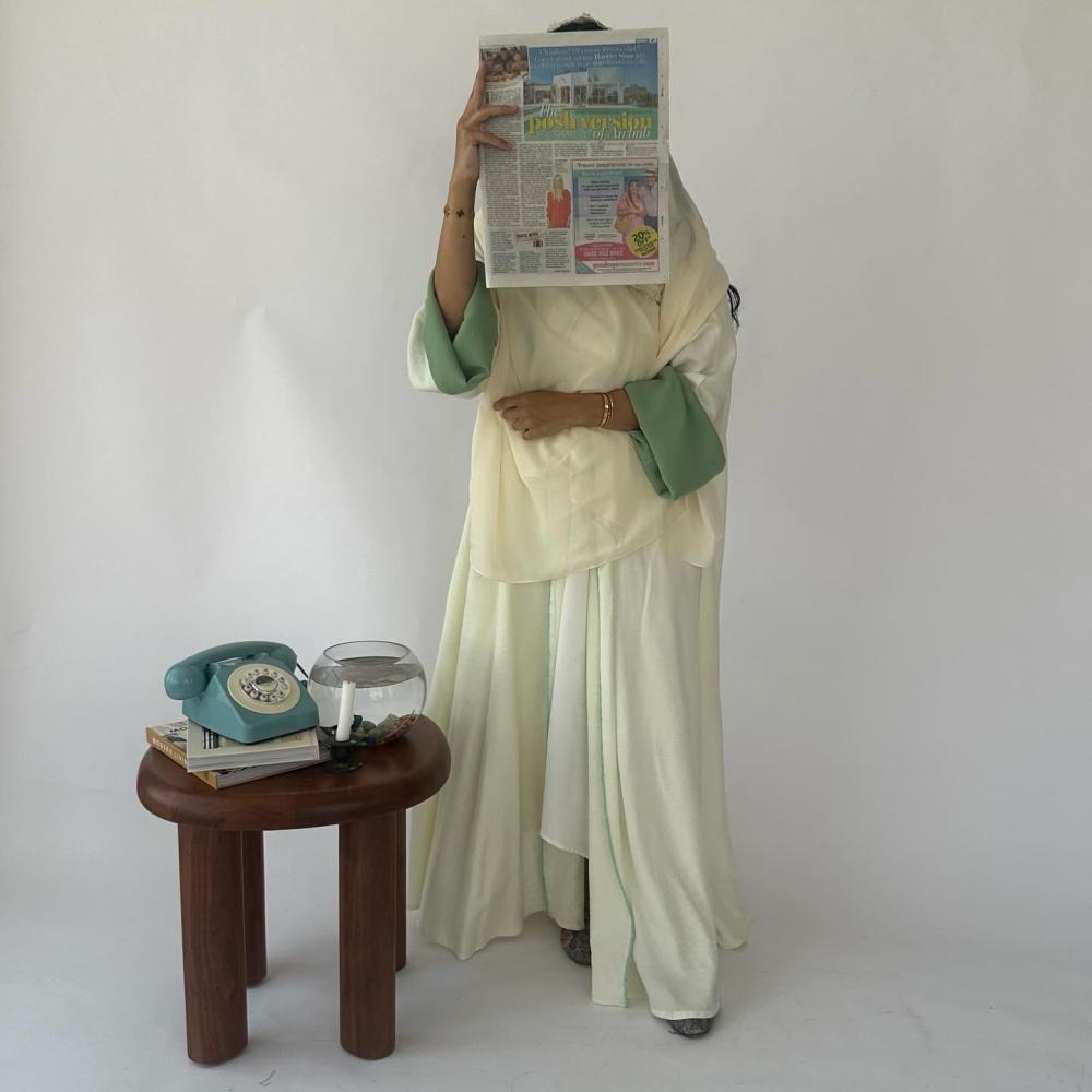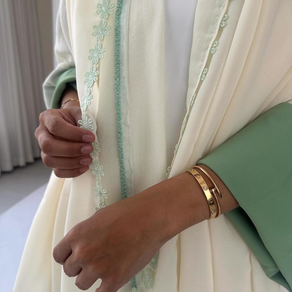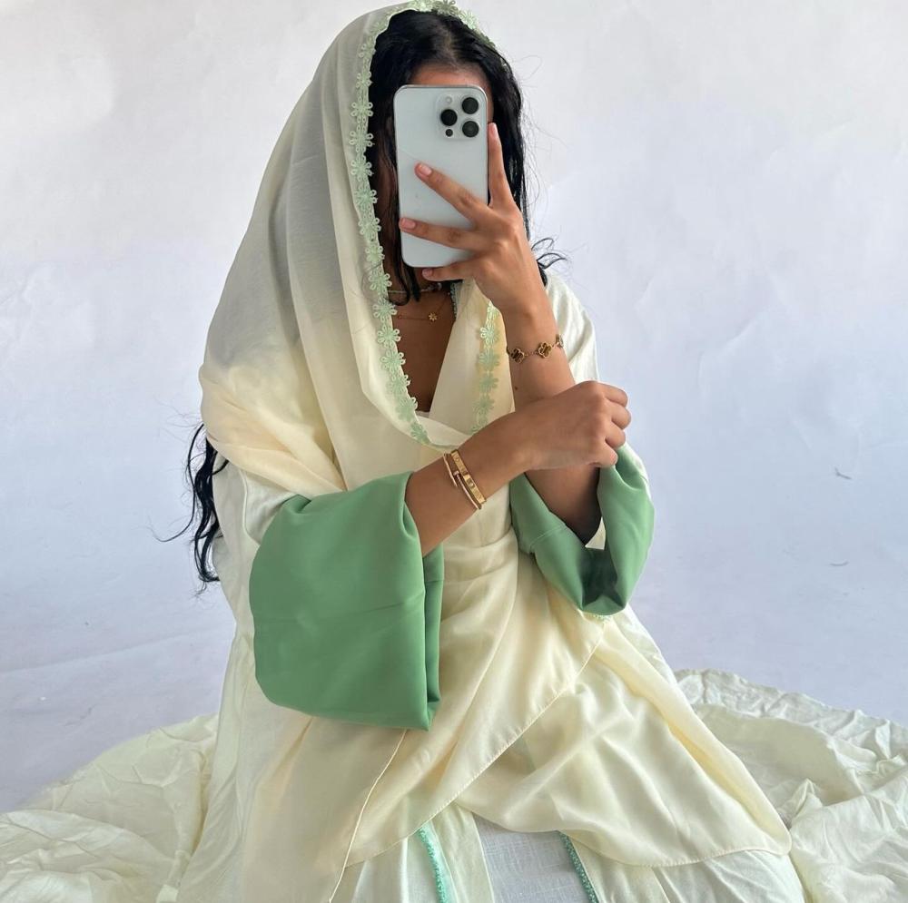 لينن مغسول ليموني فاتح | الكم كريب من الداخل | قيطان كامل العبايه | كلفه من الجهتين الاماميه | طرحه شيفون بكلفه ورود