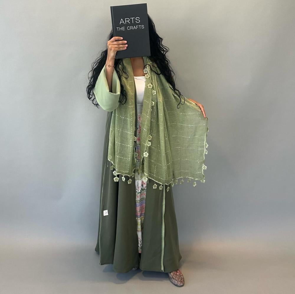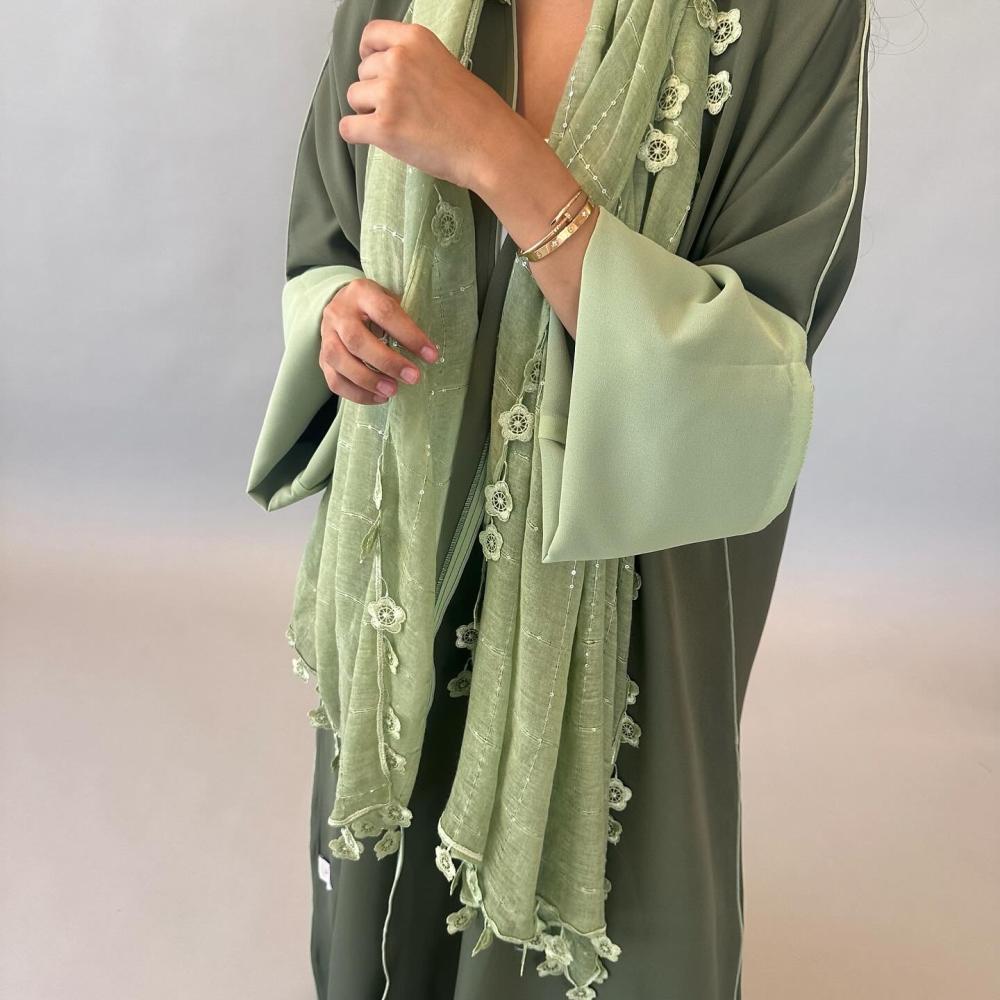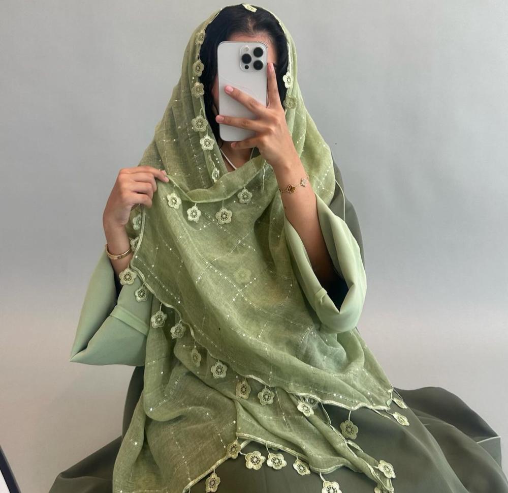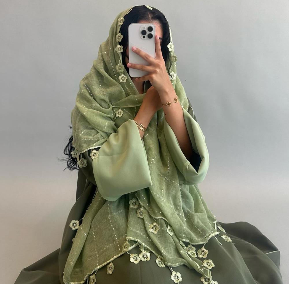 كريب باربي | الكم سفطه غير مثبته كريب باربي فاتح | قيطان كامل العبايه | طرحه لينن مطرز بلمعه وورود من كامل الجهات