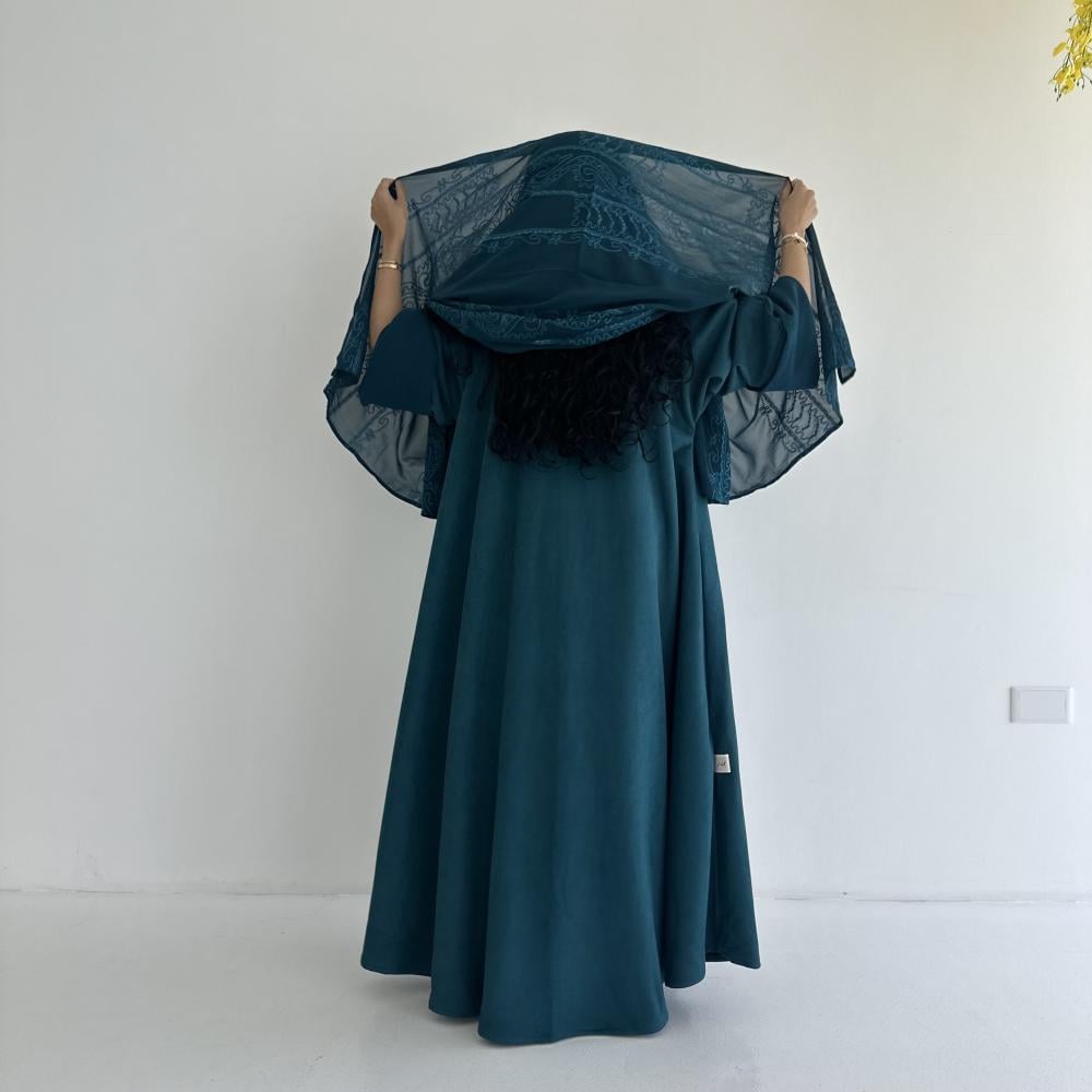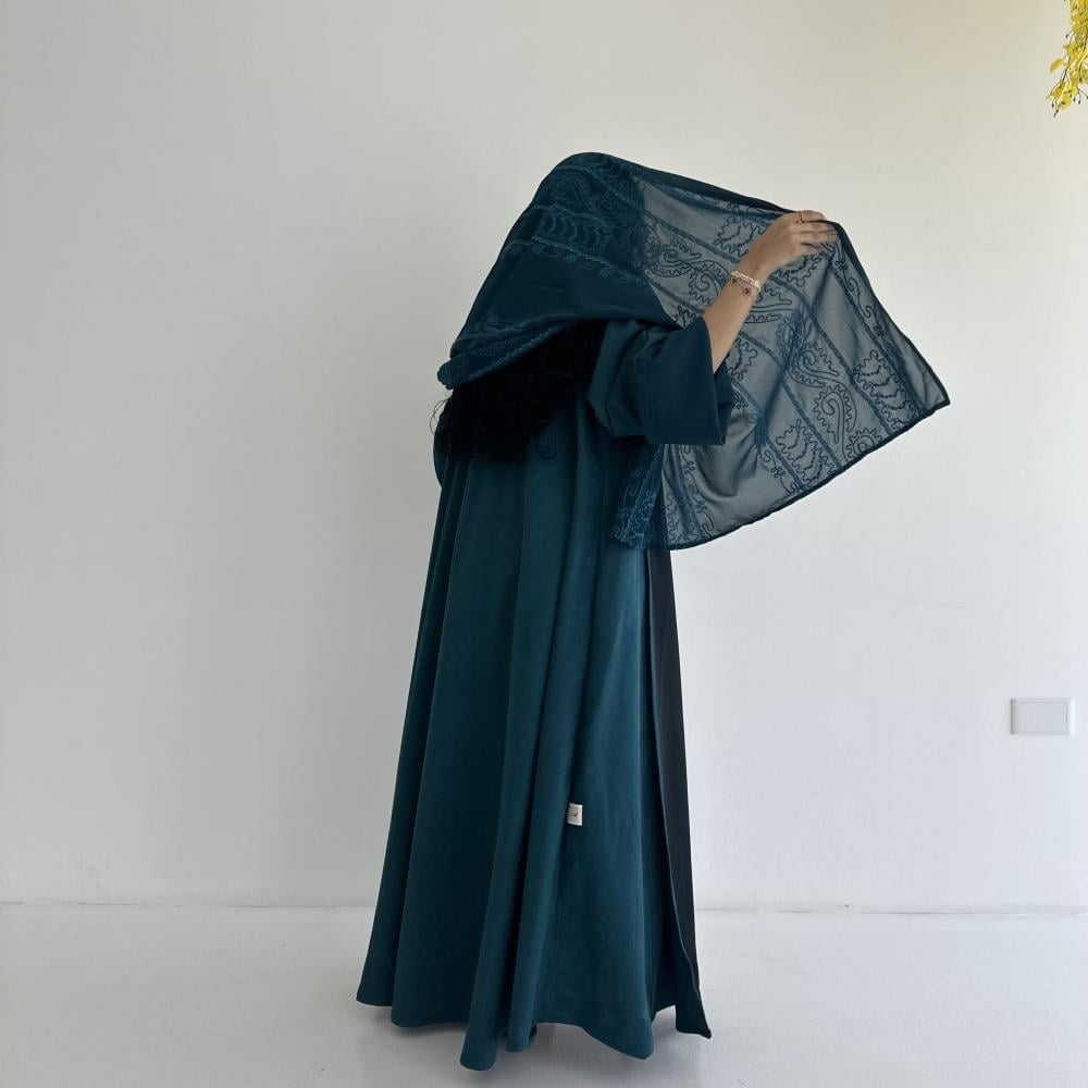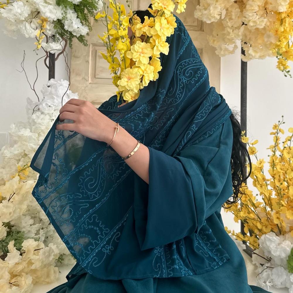 شامواه تركواز غامق | الكم سفطه جورجيت ( غير مثبته ) | الطرحه جورجيت مطرز بالكامل | طول وعرض الطرحه اقصر من الطرح العاديه
