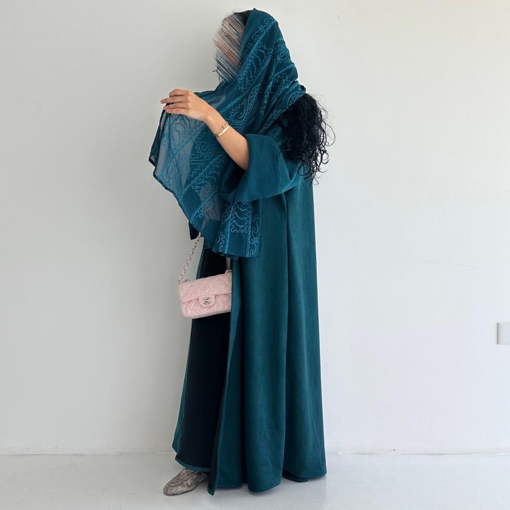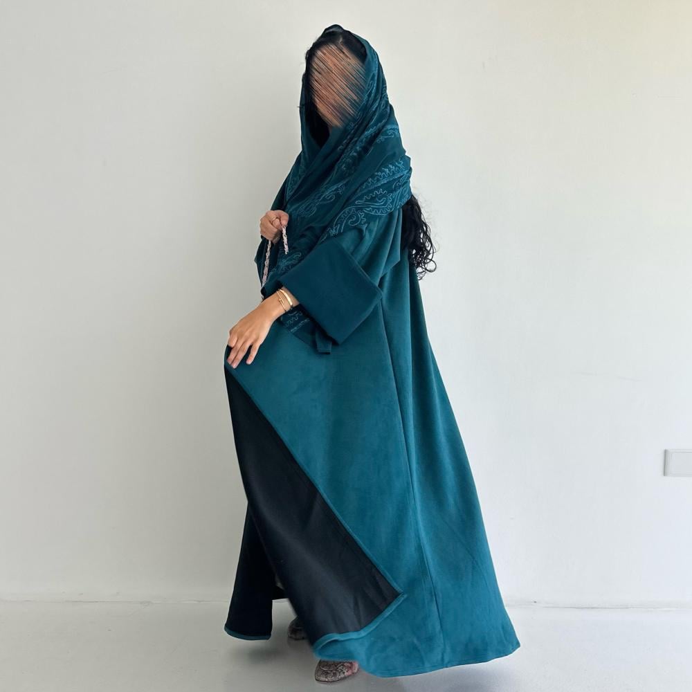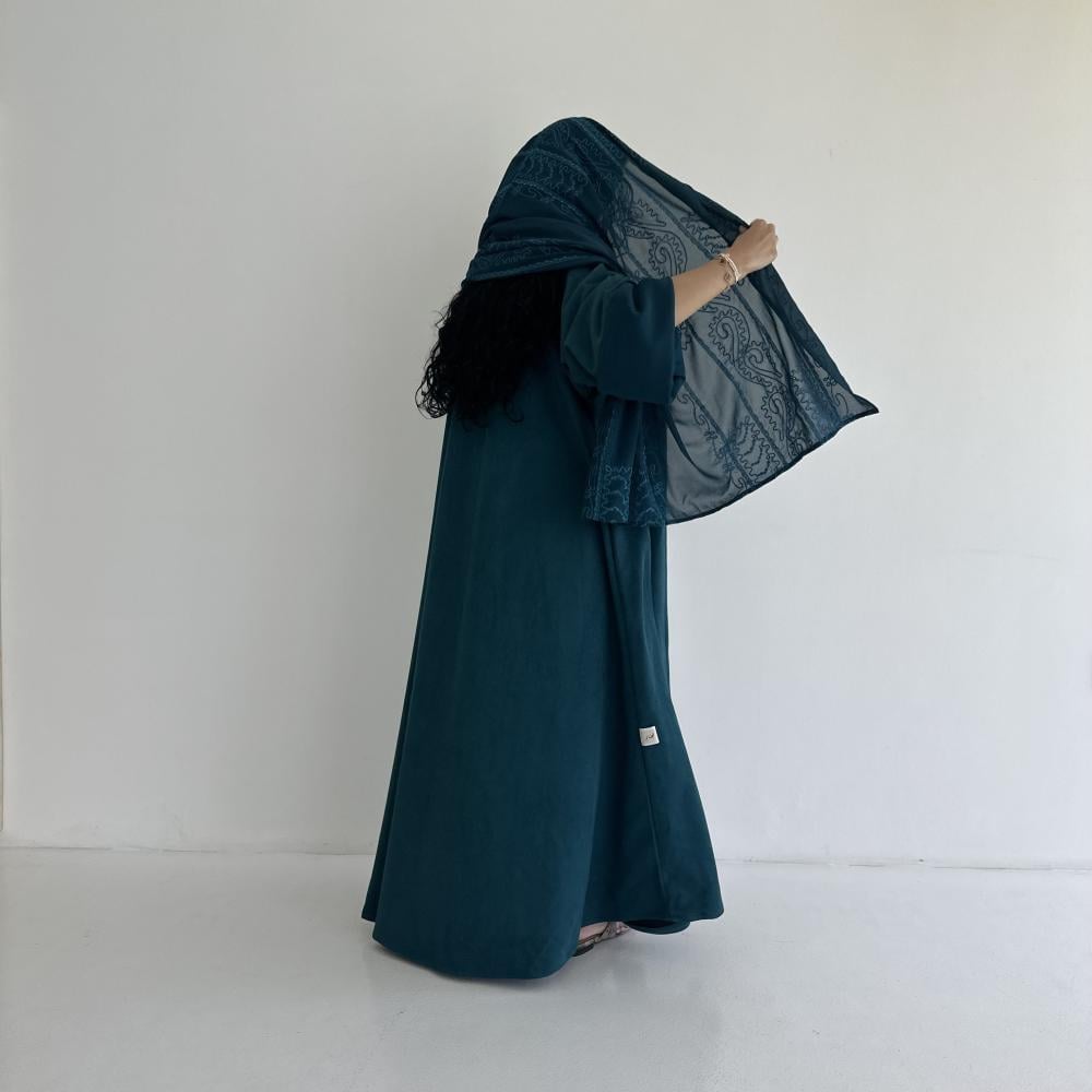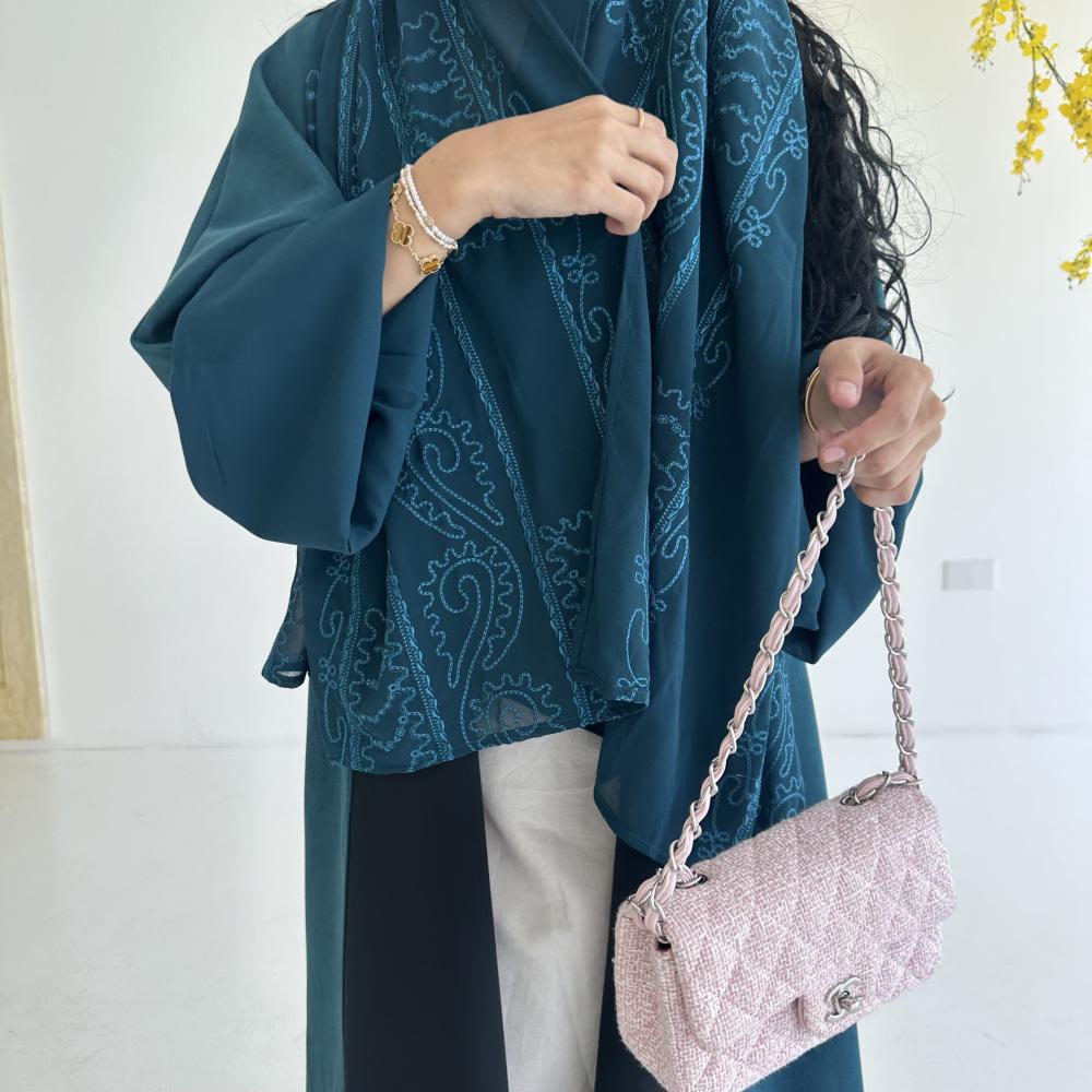 شامواه تركواز غامق | الكم سفطه جورجيت ( غير مثبته ) | الطرحه جورجيت مطرز بالكامل | طول وعرض الطرحه اقصر من الطرح العاديه