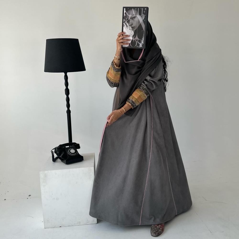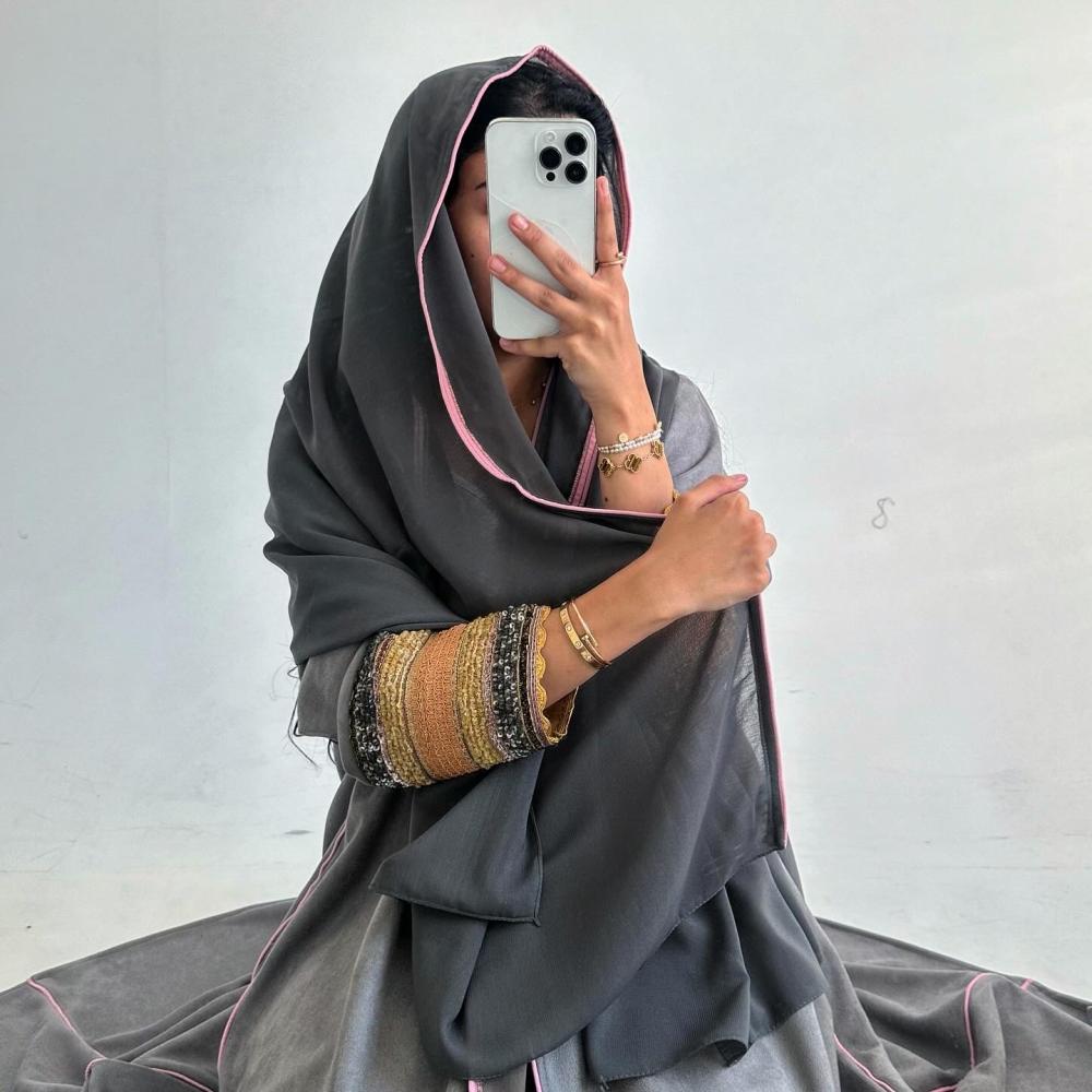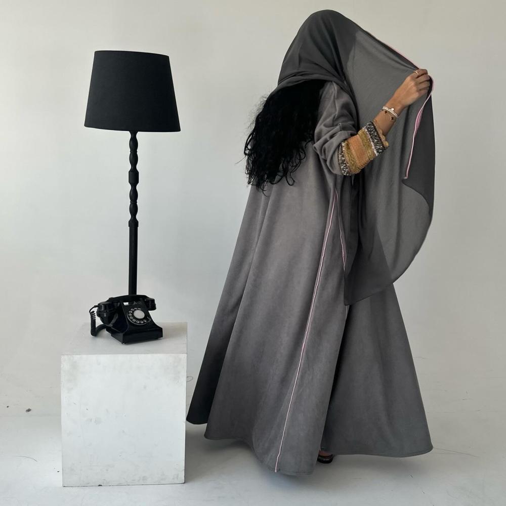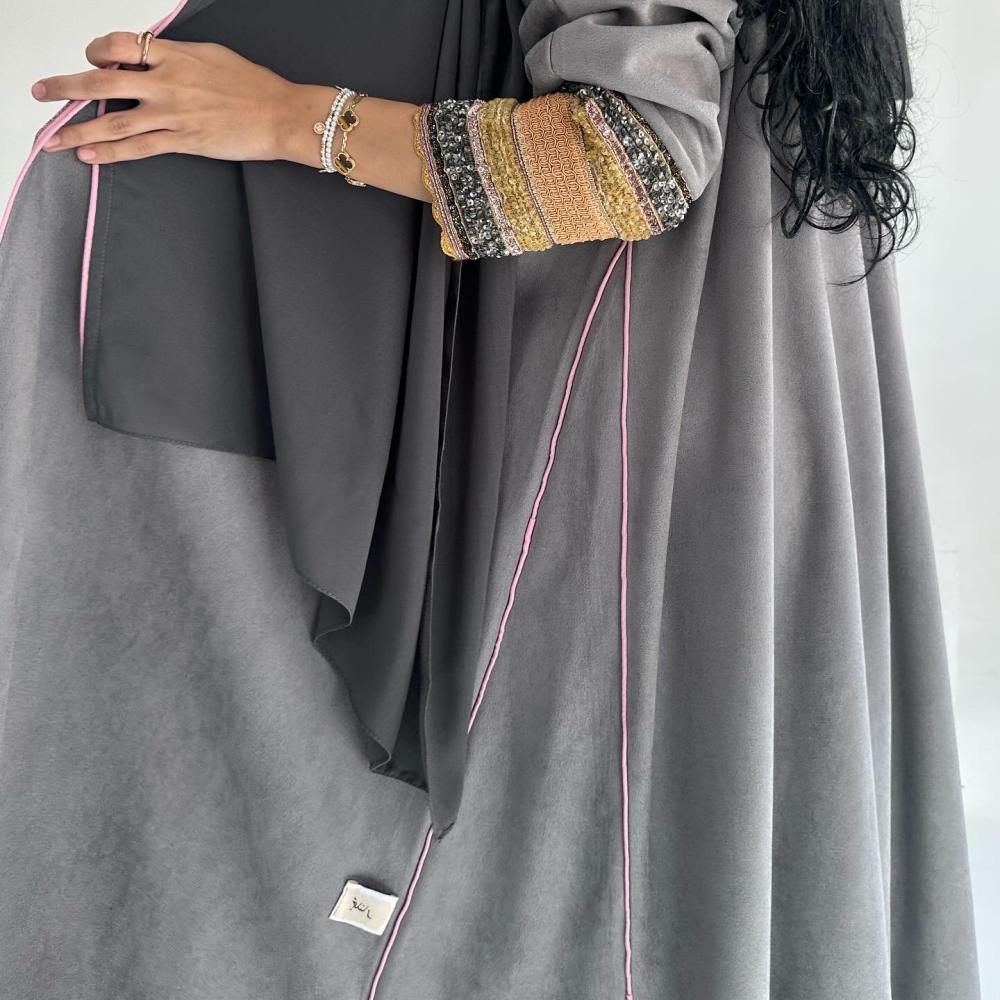 شامواه رمادي | قيطان كامل العبايه وردي | كسرات قيطان | الكم شك وتطريز هندي | الطرحه شيفون بقيطان وردي