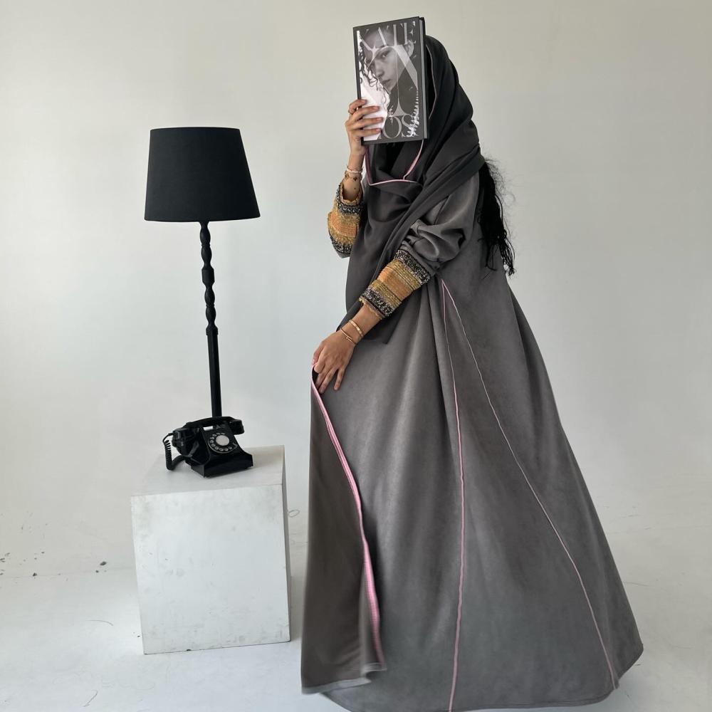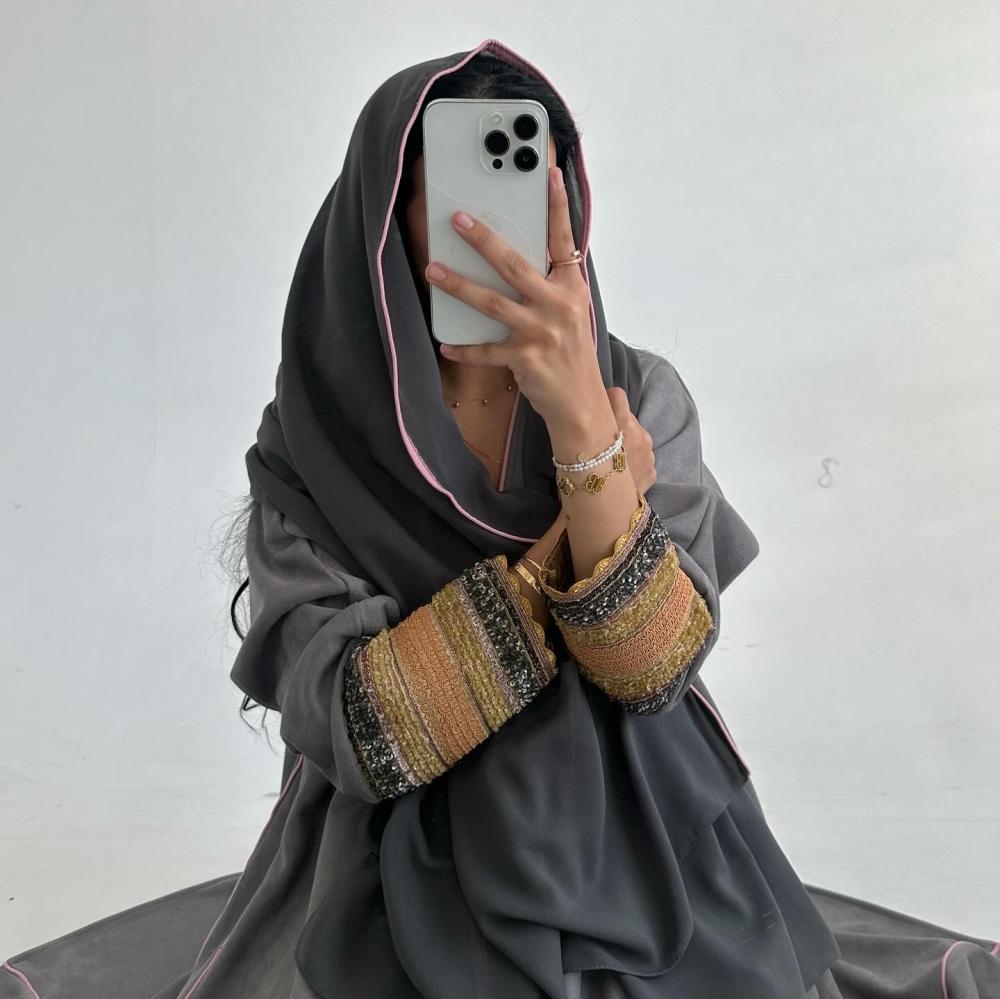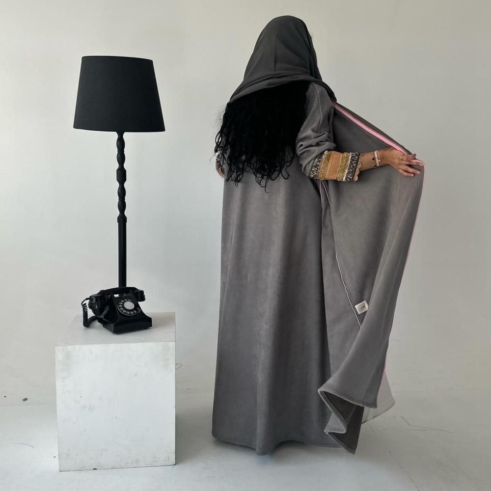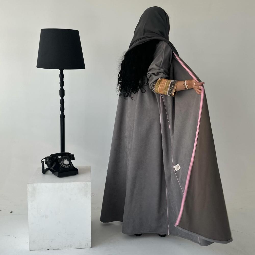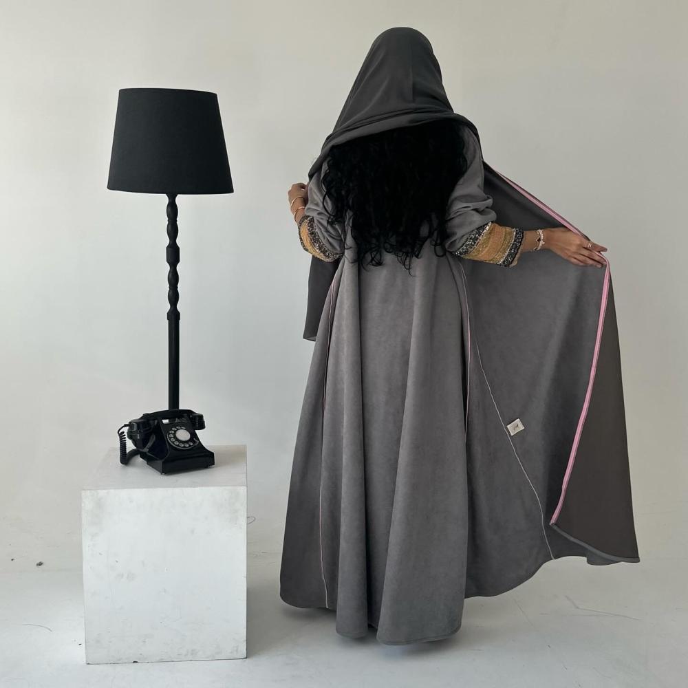 شامواه رمادي | قيطان كامل العبايه وردي | كسرات قيطان | الكم شك وتطريز هندي | الطرحه شيفون بقيطان وردي