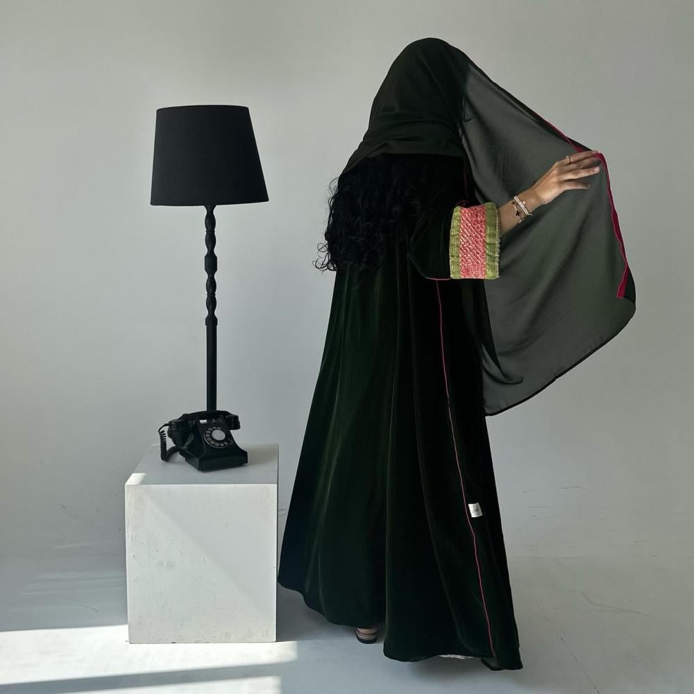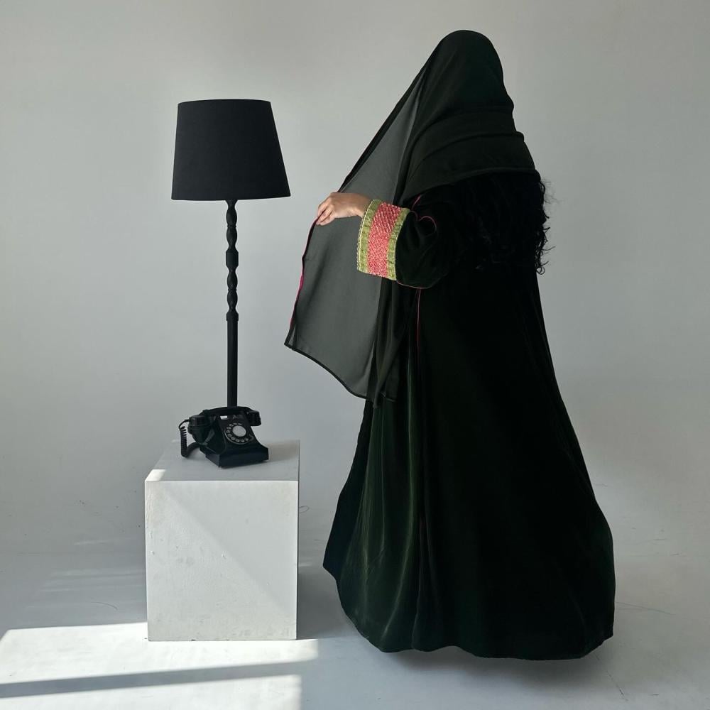 مخمل زيتي | الكم شك وتطريز هندي | قيطان فوشي كامل العبايه | الطرحه شيفون بقيطان فوشي