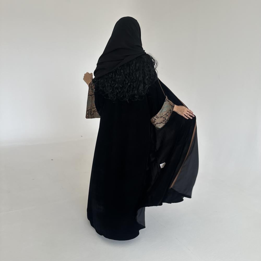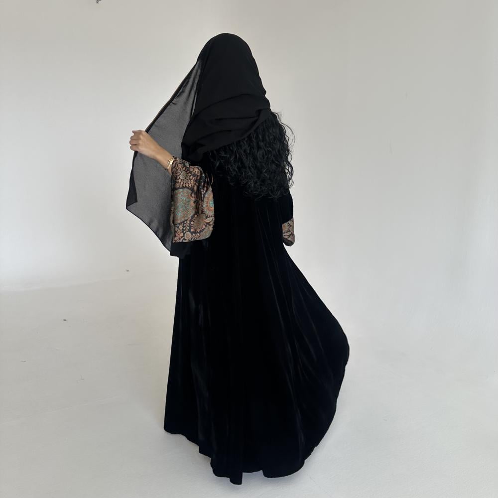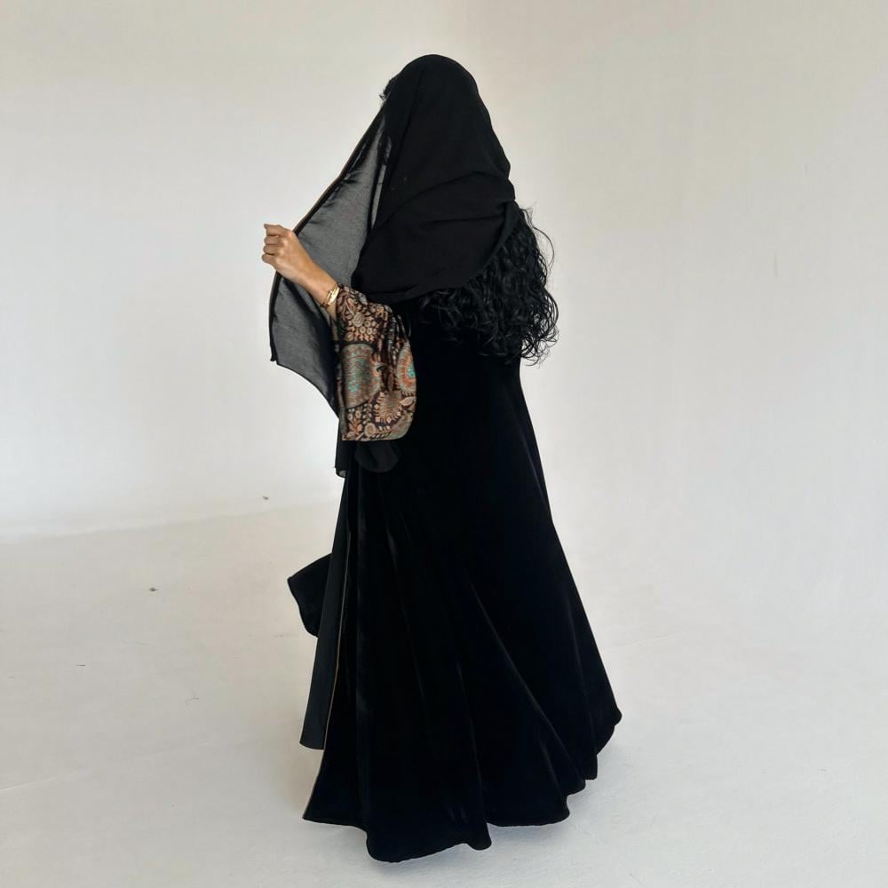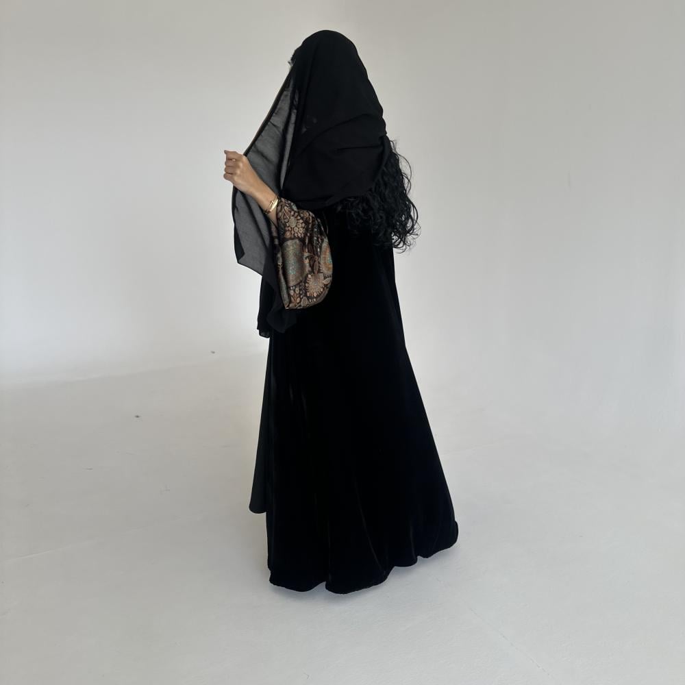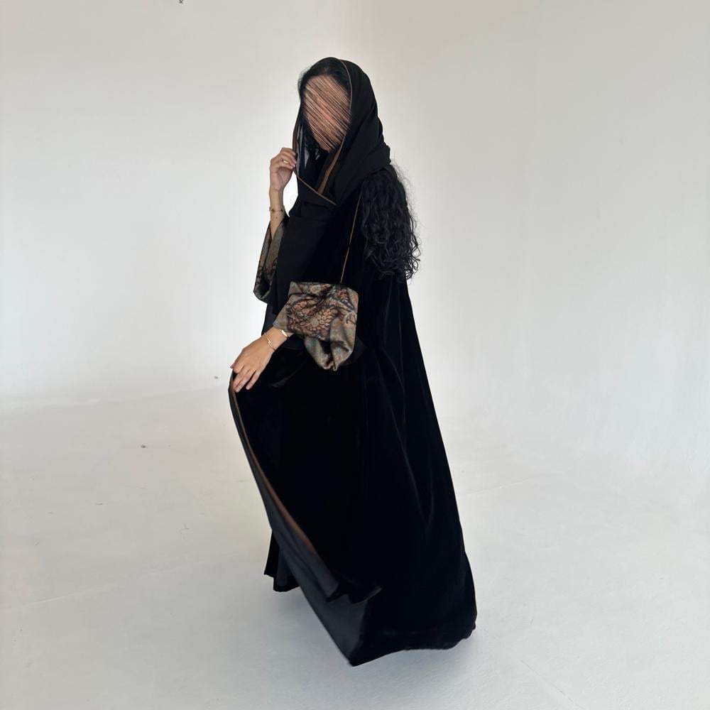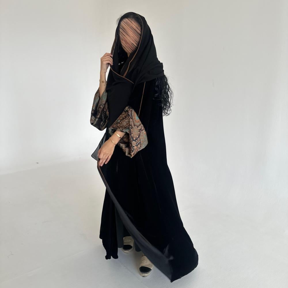 - مخمل اسود | الكم حرير مشجر "سفطه غير مثبته" | قيطان كموني كامل العبايه | الطرحه شيفون بقيطان كموني