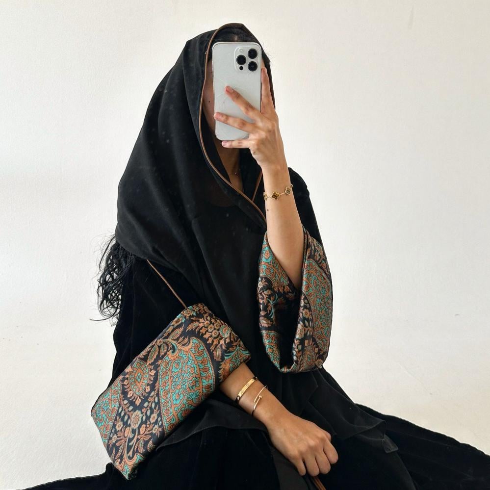 الكم حرير مشجر " تركواز اخضر | كموني " , تختلف التشجيره من عبايه لاخرى