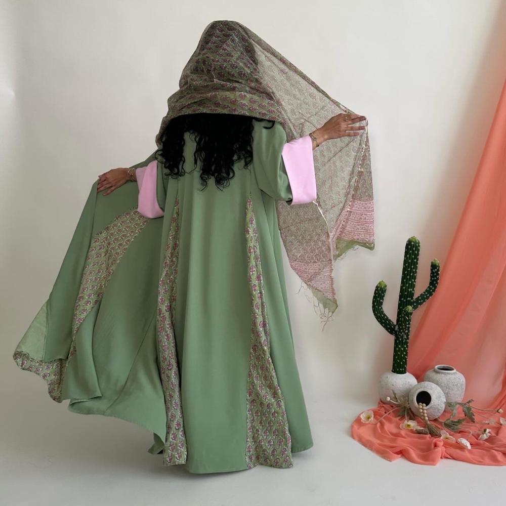 كريب تفاحي | ٤ كسرات قطن مشجر | الكم كتان وردي سفطه | قيطان وردي كامل العبايه | الطرحه لين خفيف واقف مشجر بهدب