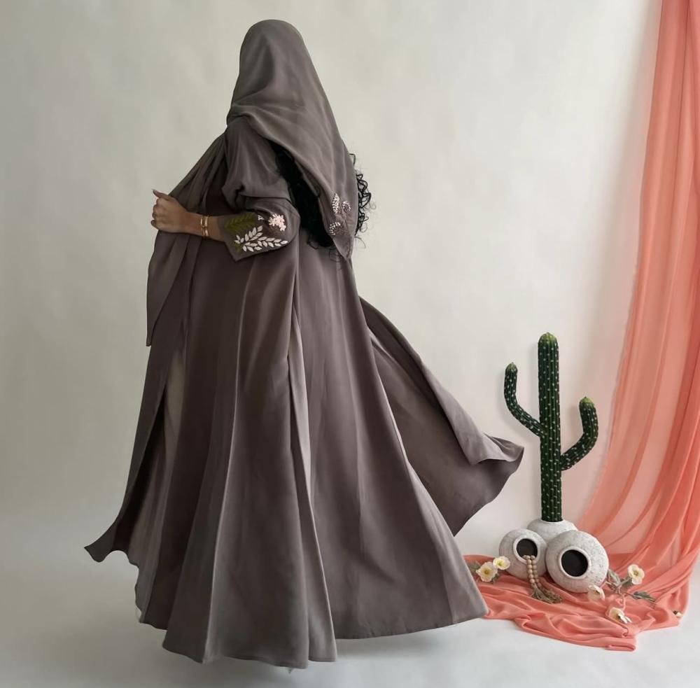حرير مغسول كوري " بني فاتح على بيج " | ٤ كسرات بيج فاتح كامل العبايه | الكم شك يدوي وتطريز ورود | الطرحه شيفون بشك يدوي