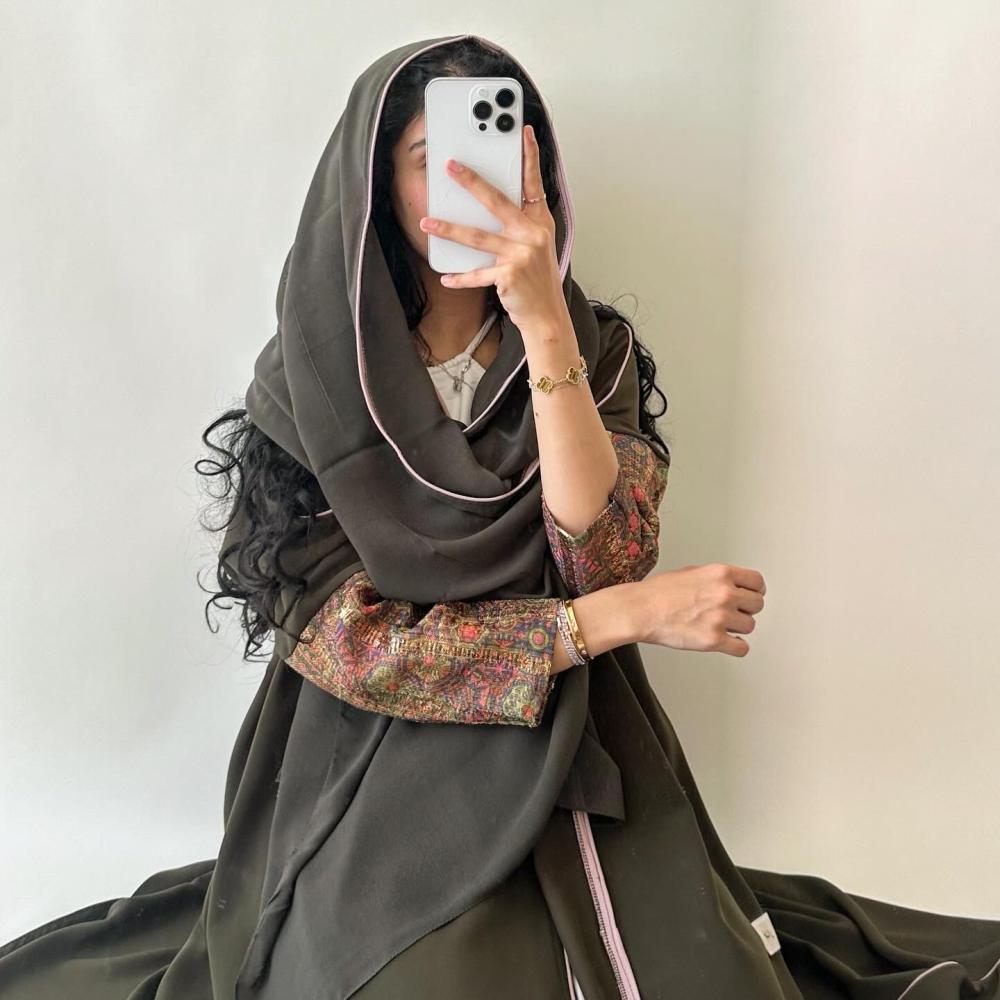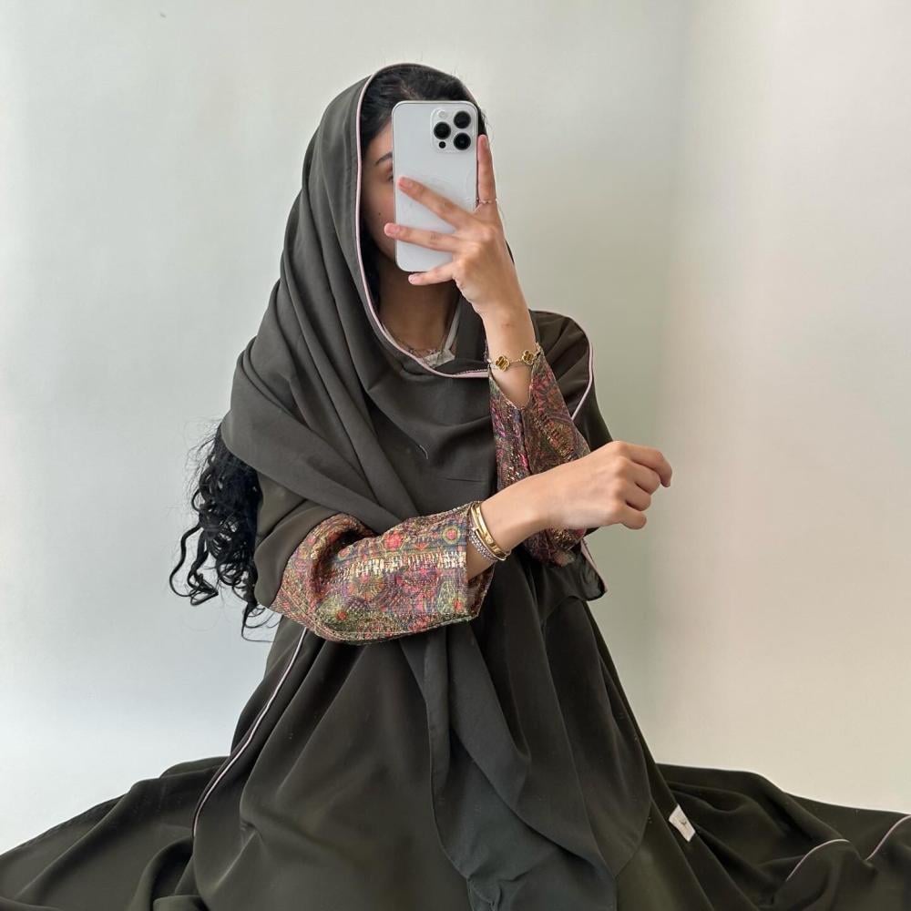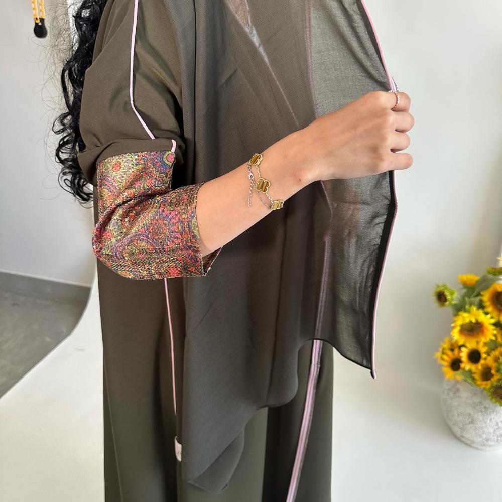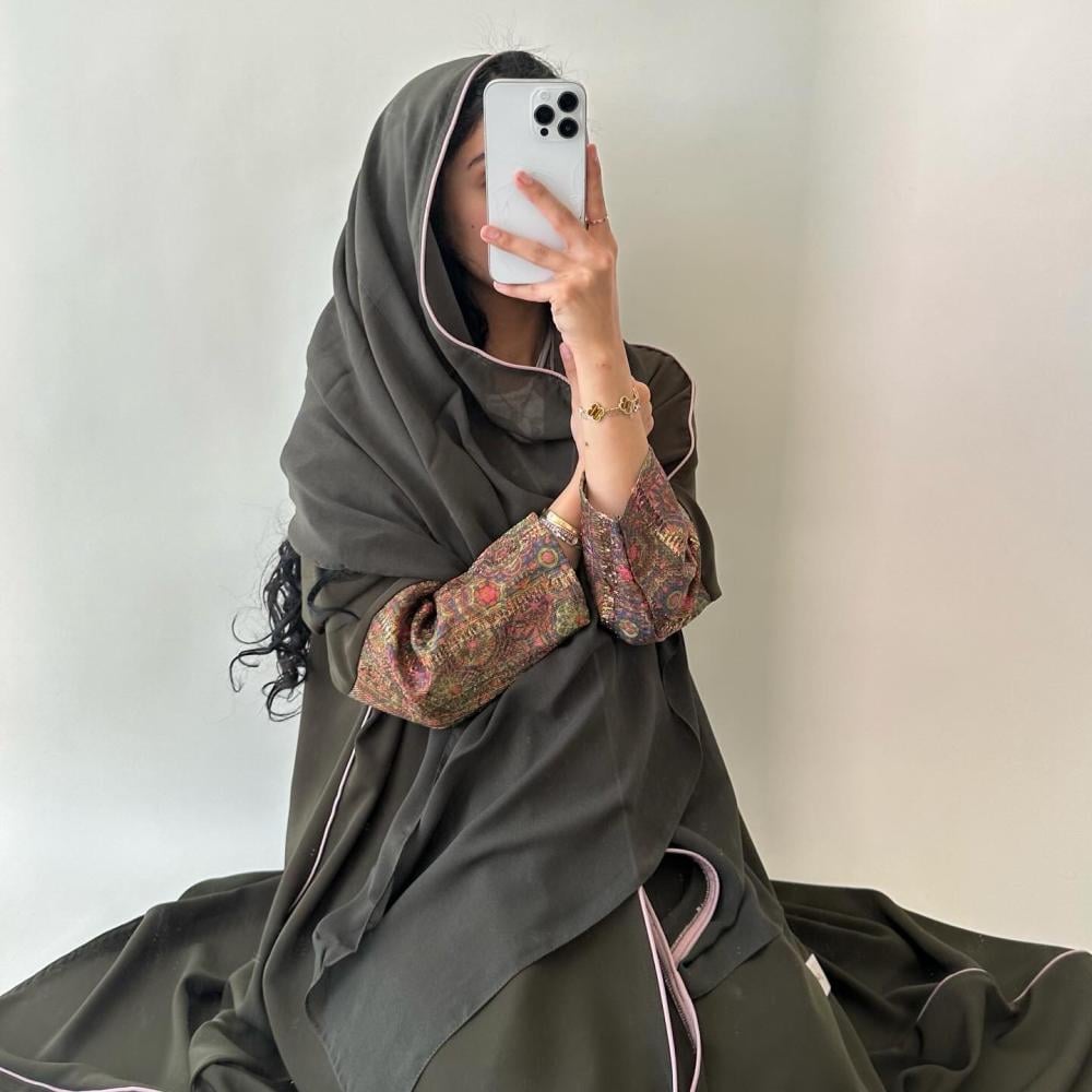 كريب زيتي | الكم تطريز هندي يدوي واقف | قيطان وردي كامل العبايه | الطرحه شيفون بقيطان وردي