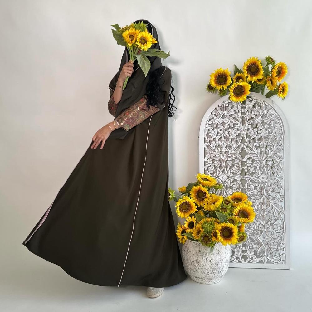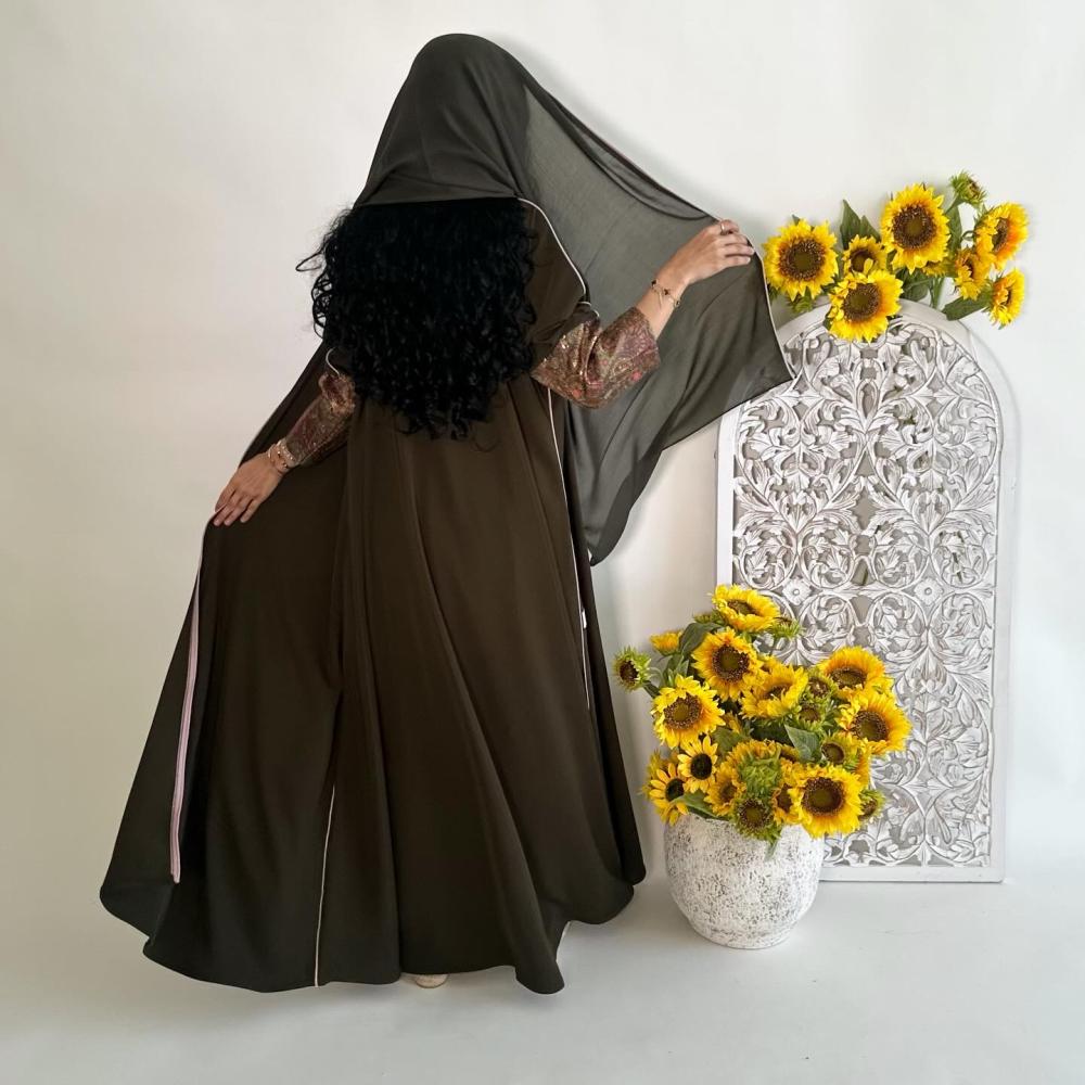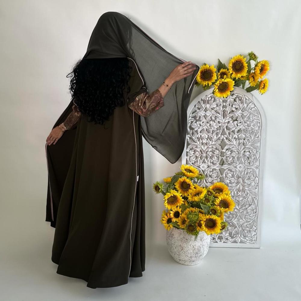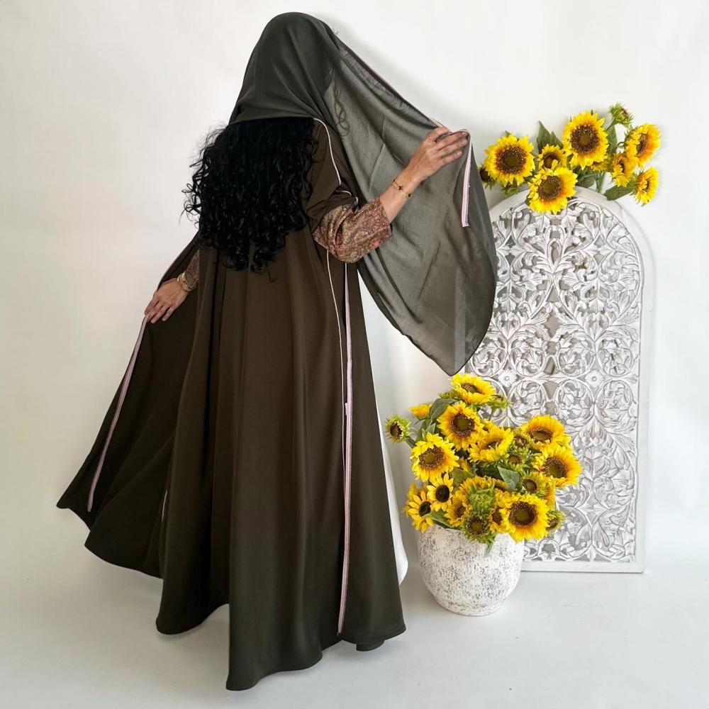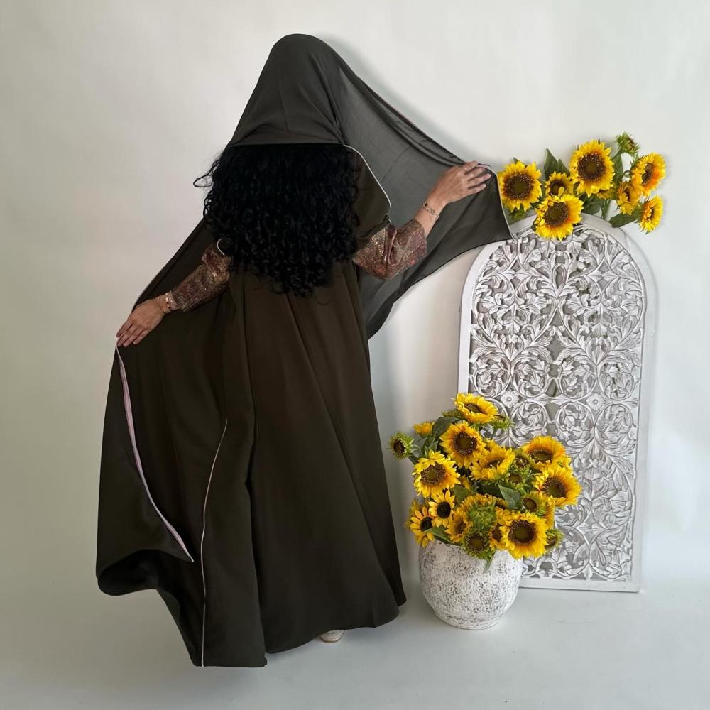 كريب زيتي | الكم تطريز هندي يدوي واقف | قيطان وردي كامل العبايه | الطرحه شيفون بقيطان وردي