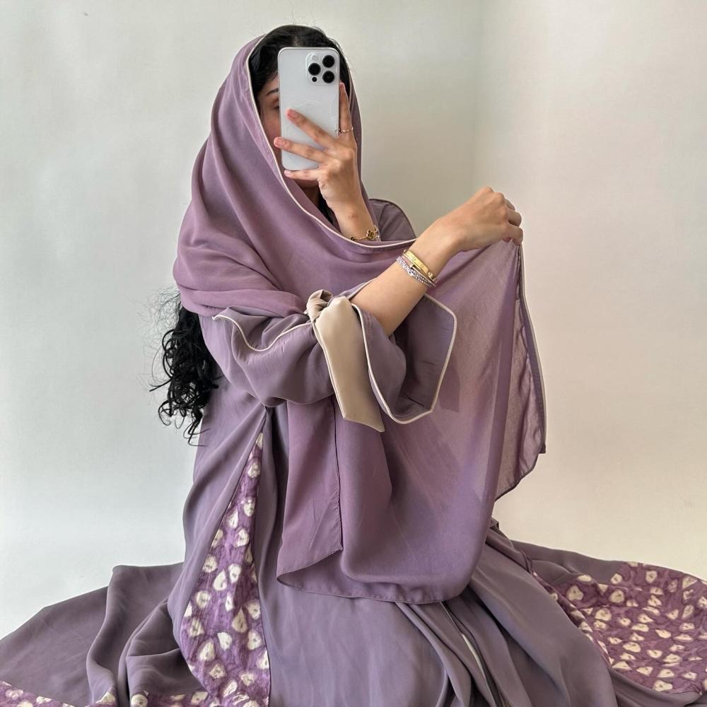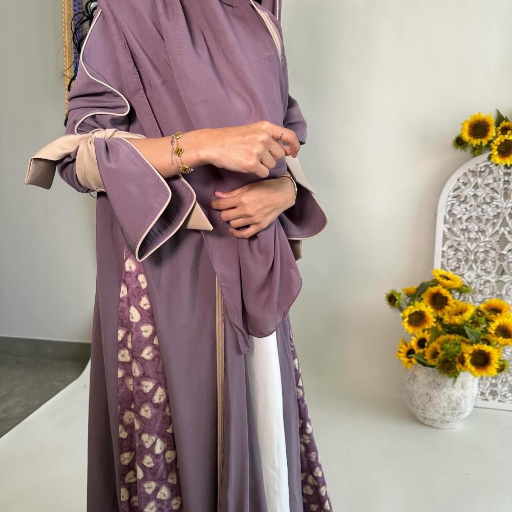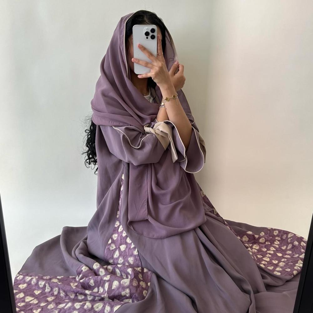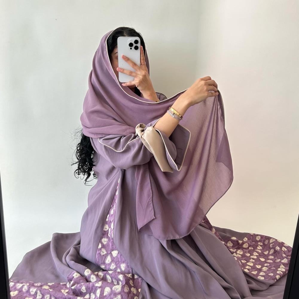 حرير مغسول كوري موف فاتح | الكم ربطات مثبته بيج | قيطان بيج كامل العبايه | كسرات قطن مموج من الجوانب | الطرحه شيفون ساده بقيطان