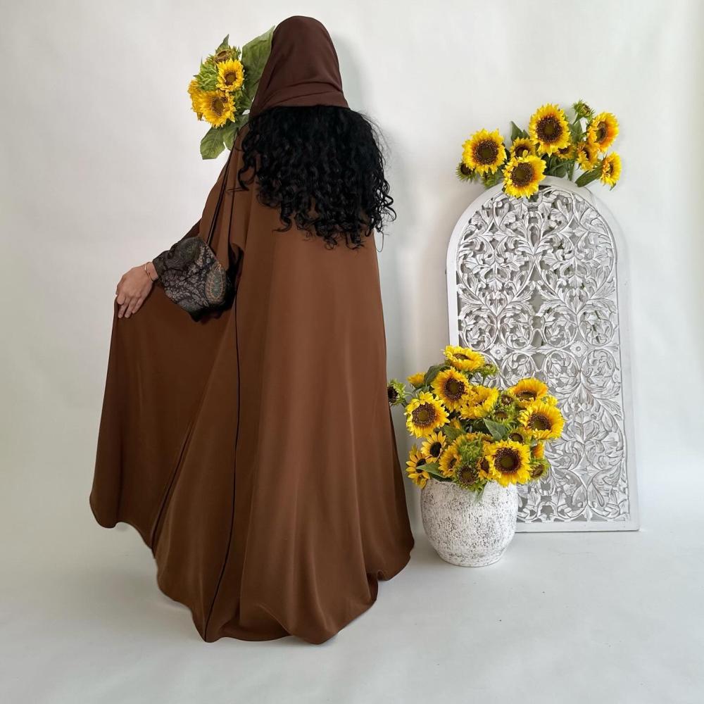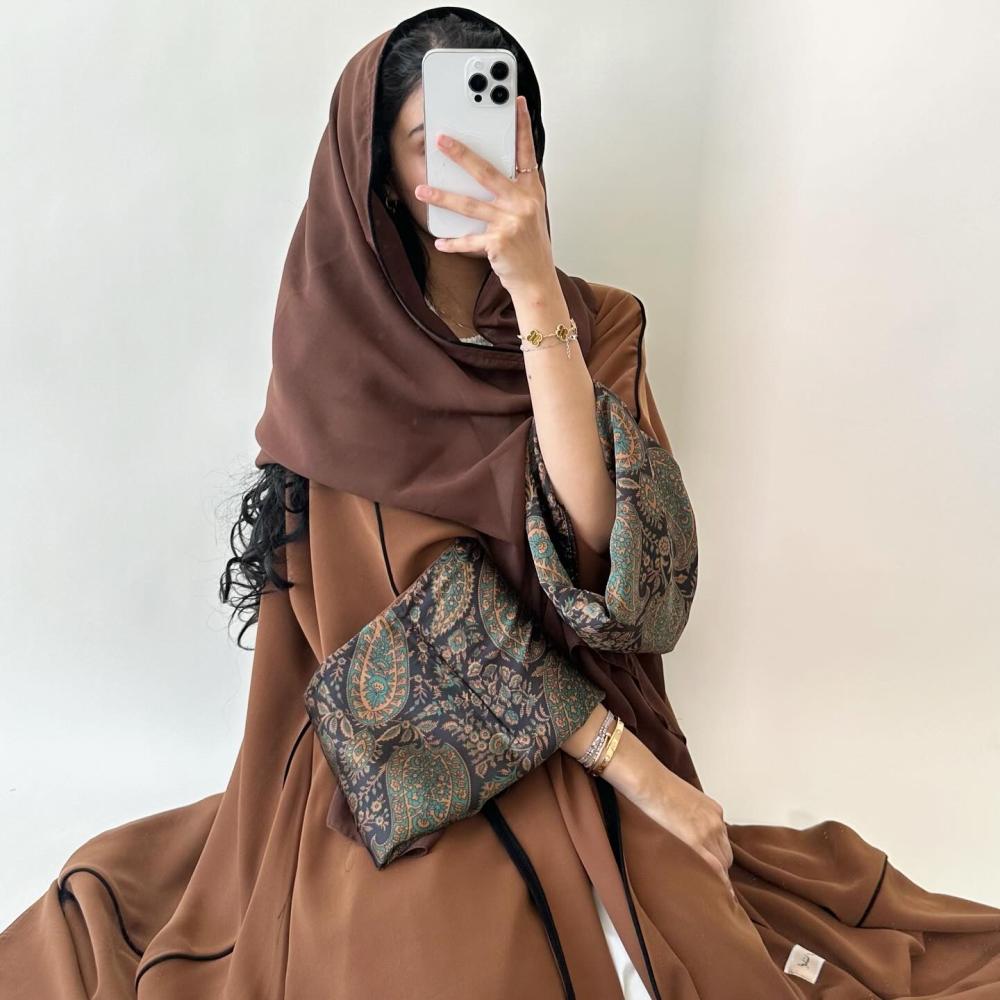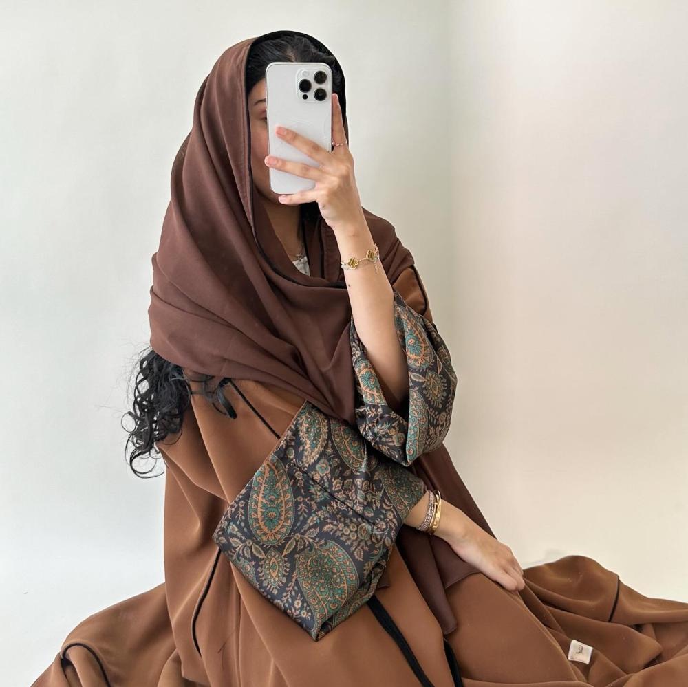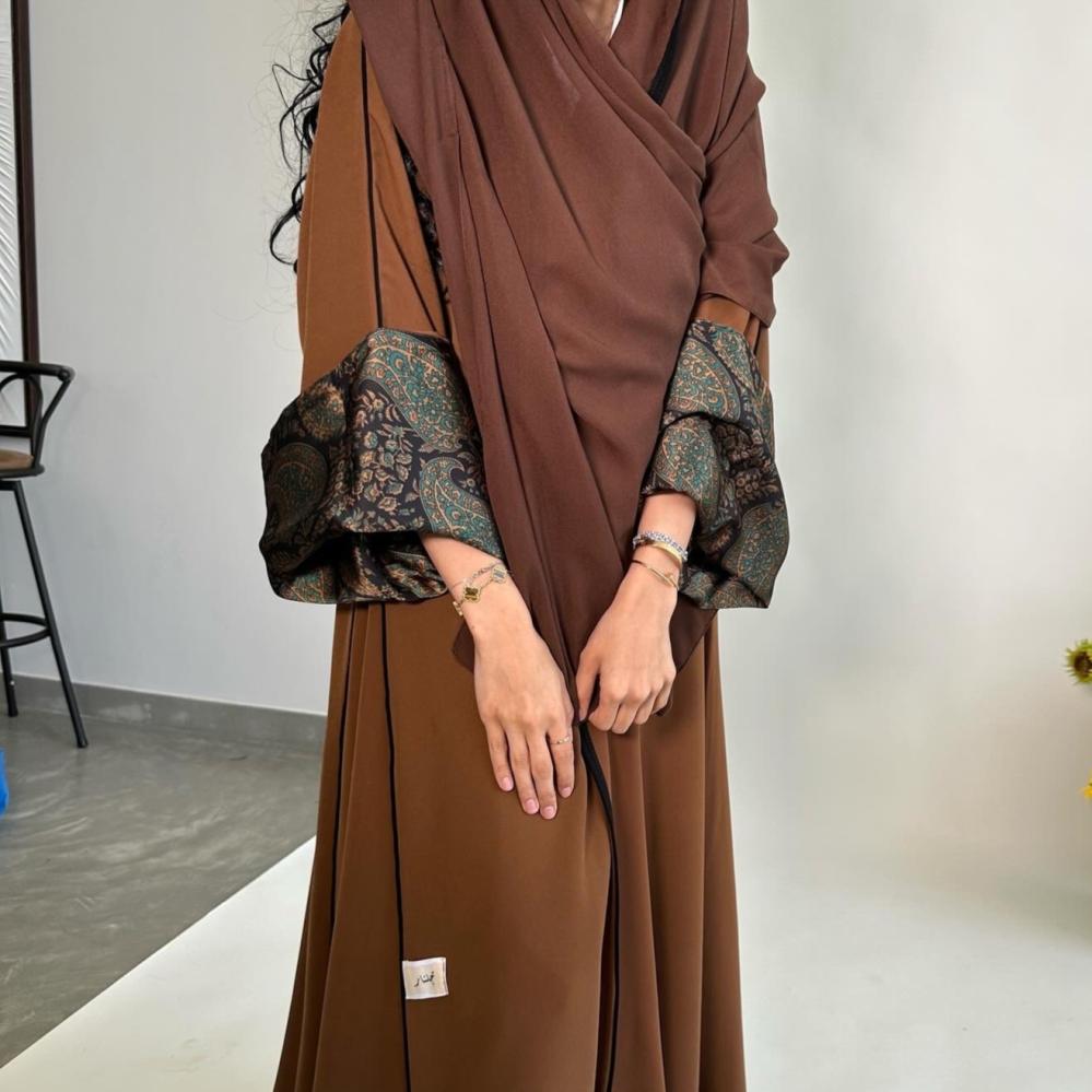 كريب سراميك | الكم سفطه حرير مشجر | كسرات من الجوانب اسود | قيطان كامل العبايه اسود | الطرحه شيفون بقيطان اسود
