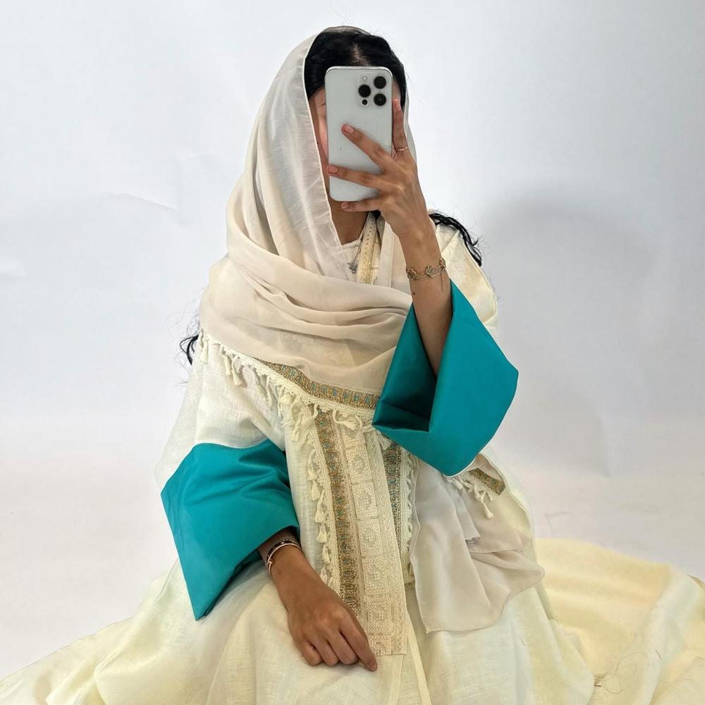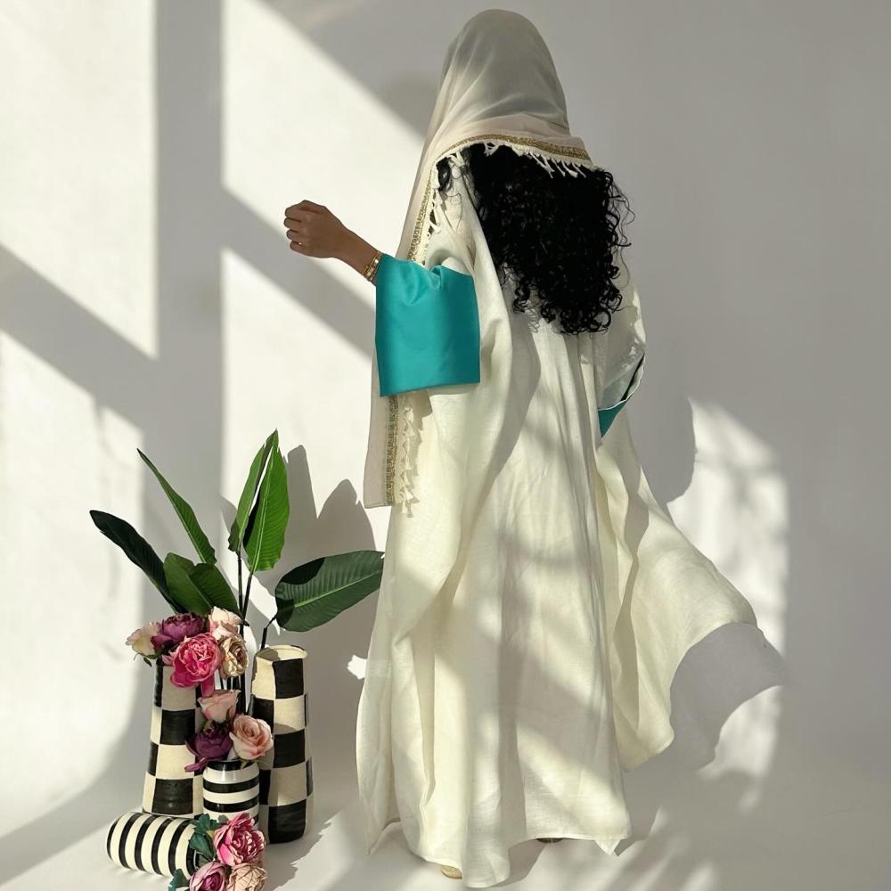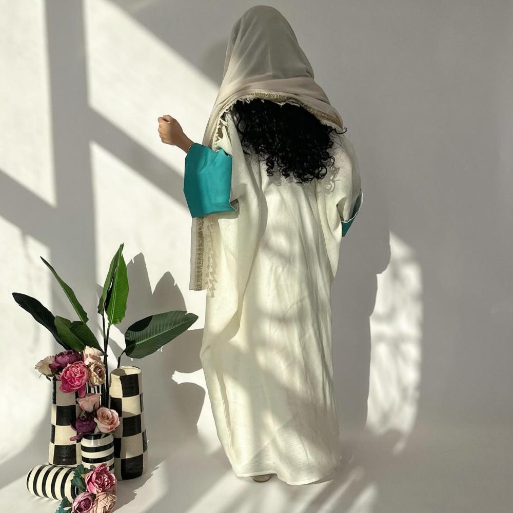 لينن اوف وايت غامق | الكم سفطه كتان تركواز | كلفه تطريز من الامام بهدب | الطرحه شيفون بطرف كلفه مطرزه وهدب