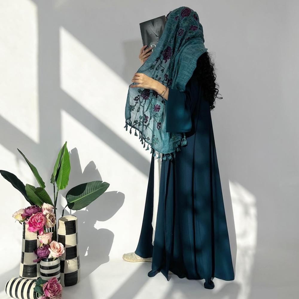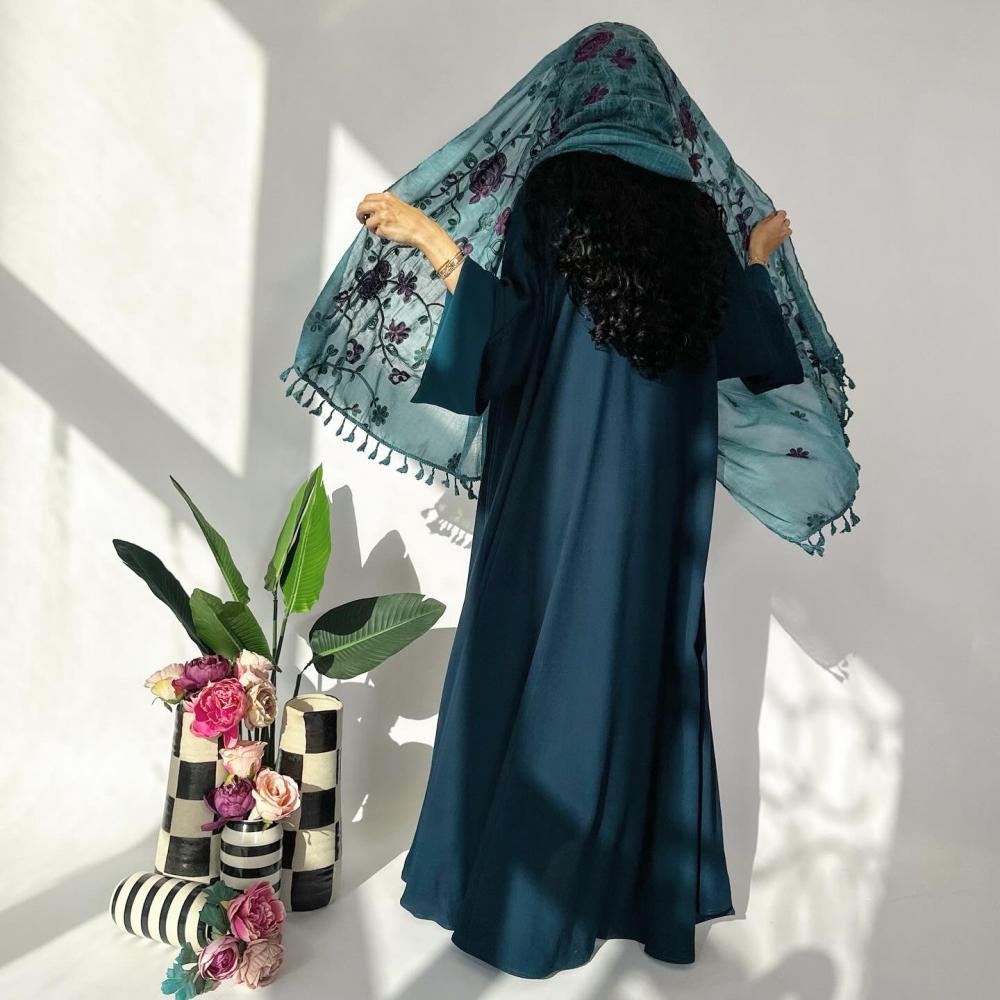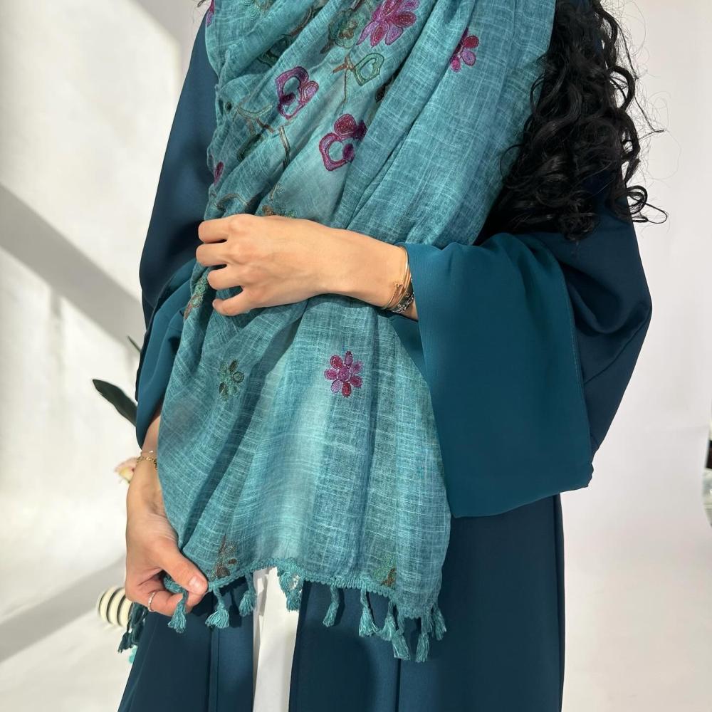 كريب اندويسي تركواز غامق | الكم سفطه غير مثبته شيفون جورجيت | الطرحه لينن مطرز بهدب | طول وعرض الطرحه اكبر من الطرح العاديه