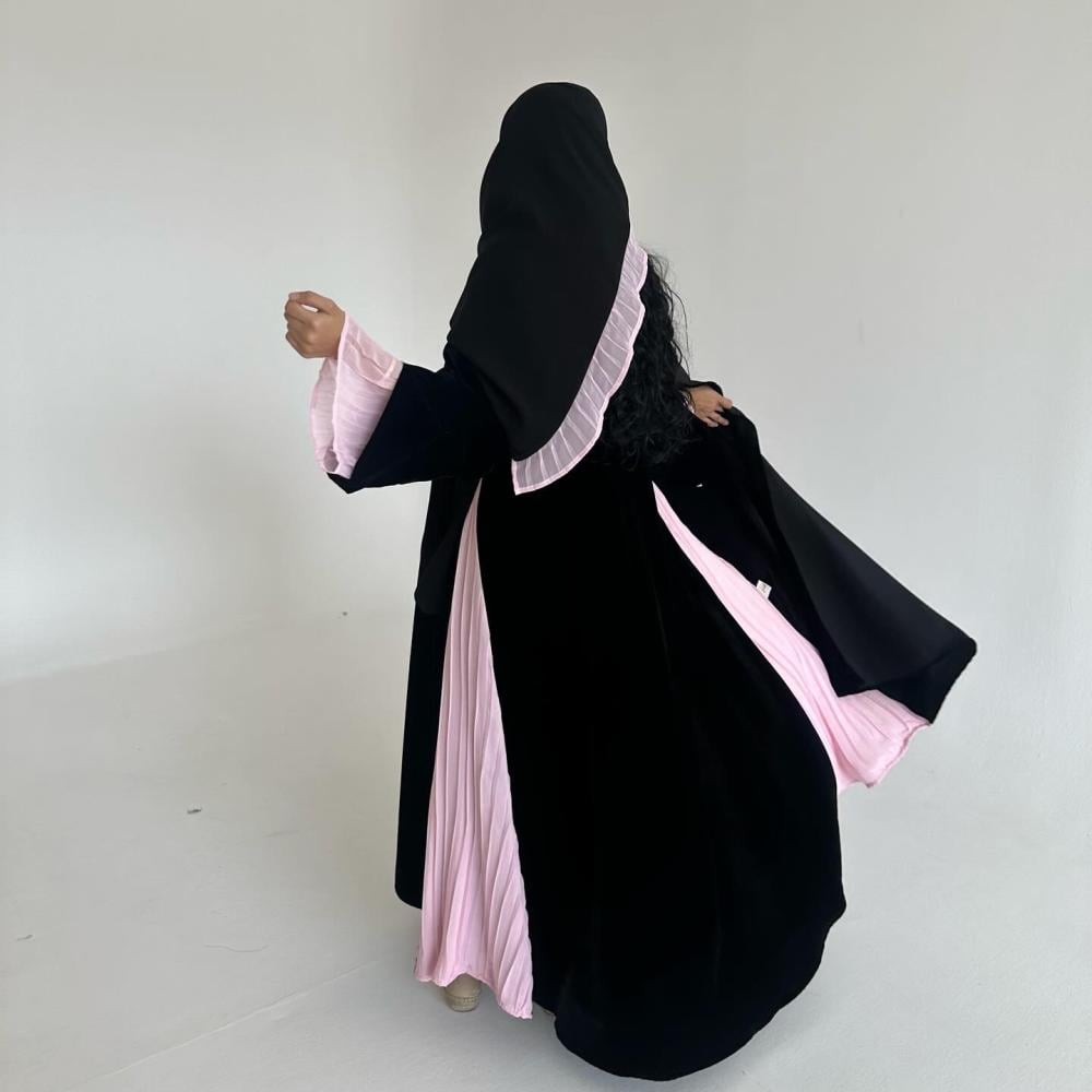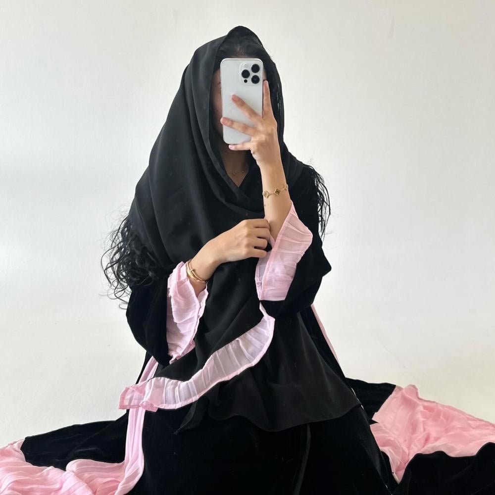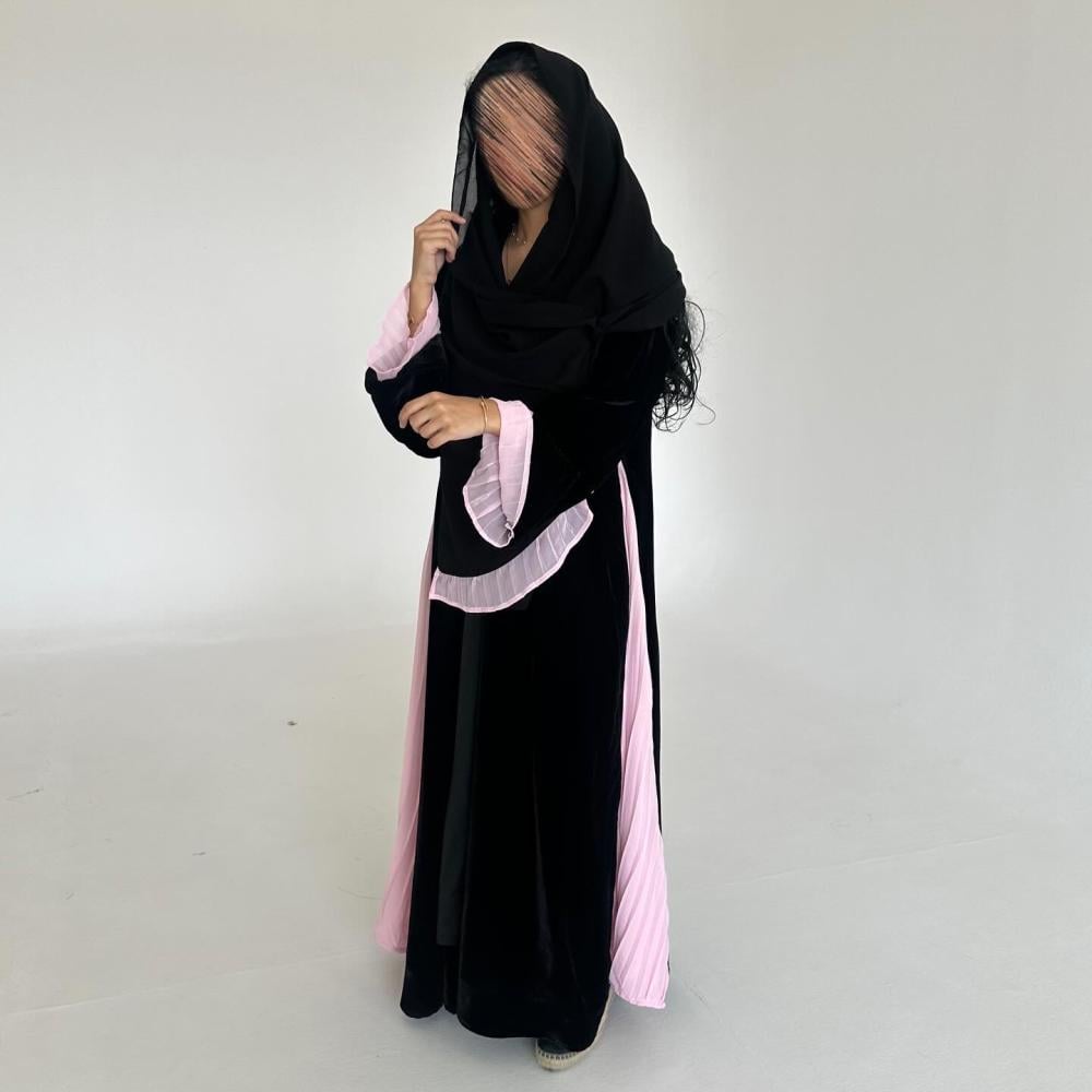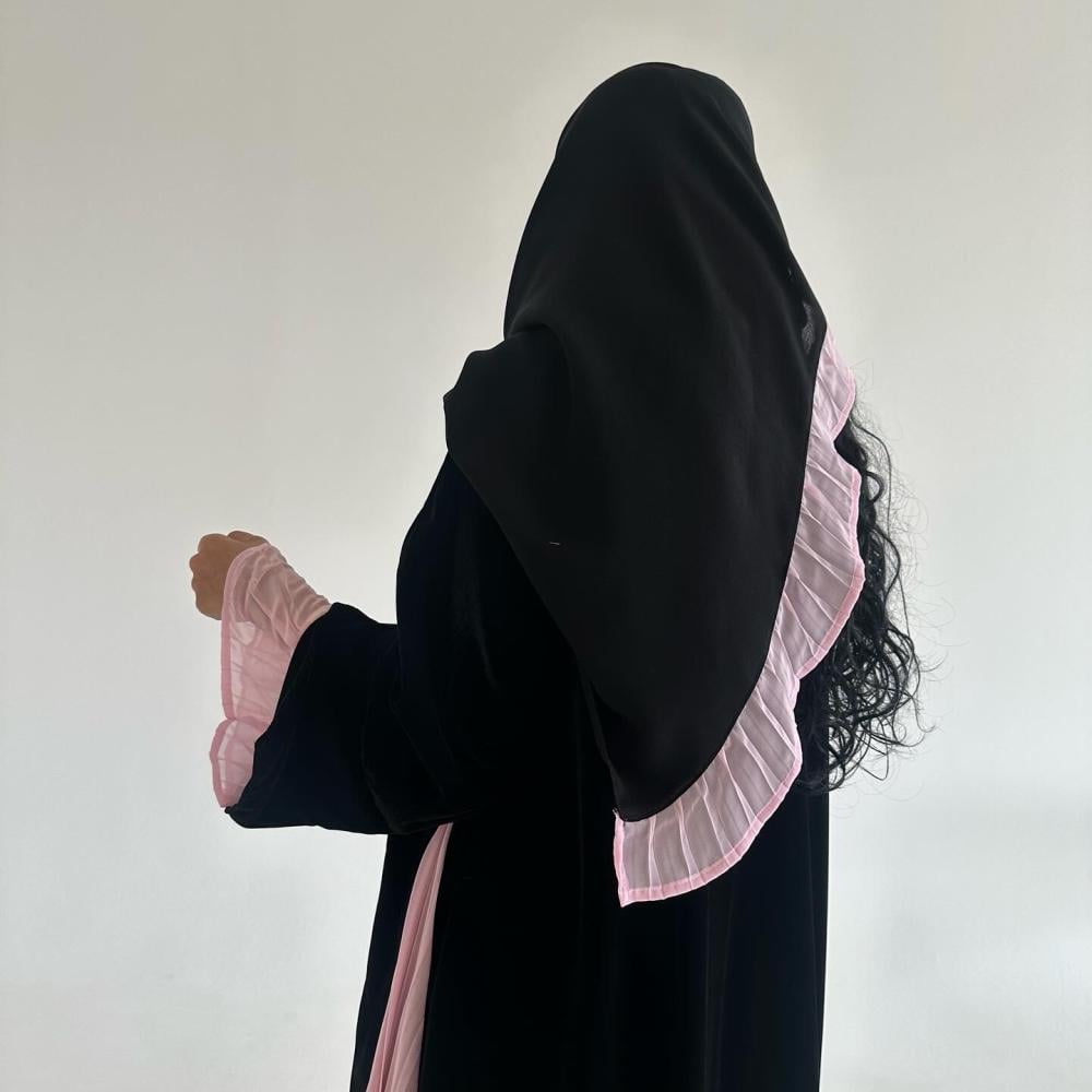 مخمل كوري اسود | كسرات شيفون وردي مكسر بالجوانب | الكم فتحه بـ مكسر شيفون وردي داخل الكم | الطرحه شيفون اسود بطرف مكسر شيفون وردي