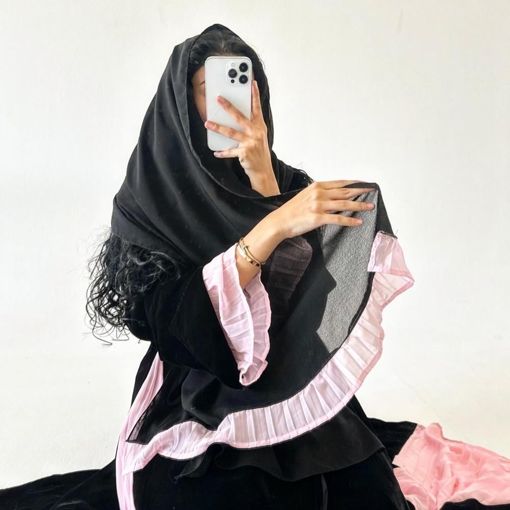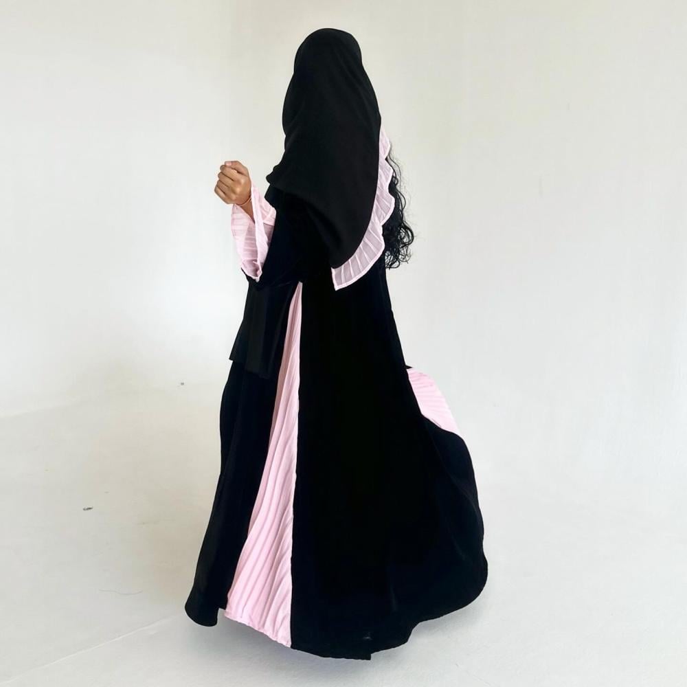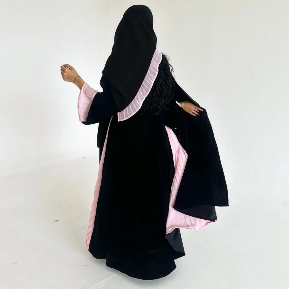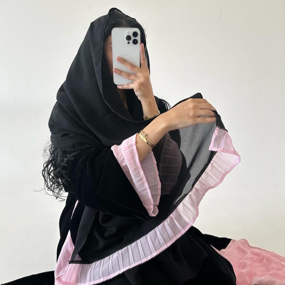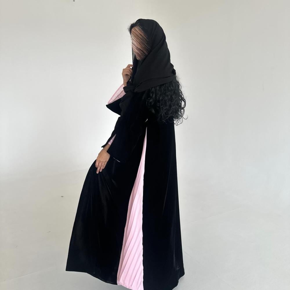 مخمل كوري اسود | كسرات شيفون وردي مكسر بالجوانب | الكم فتحه بـ مكسر شيفون وردي داخل الكم | الطرحه شيفون اسود بطرف مكسر شيفون وردي