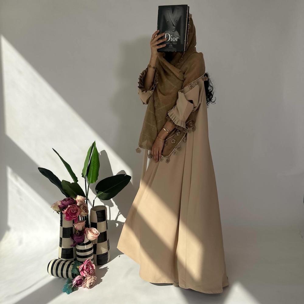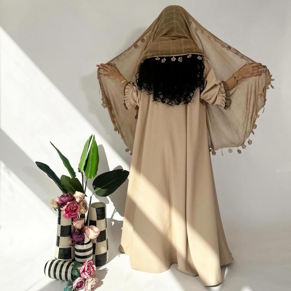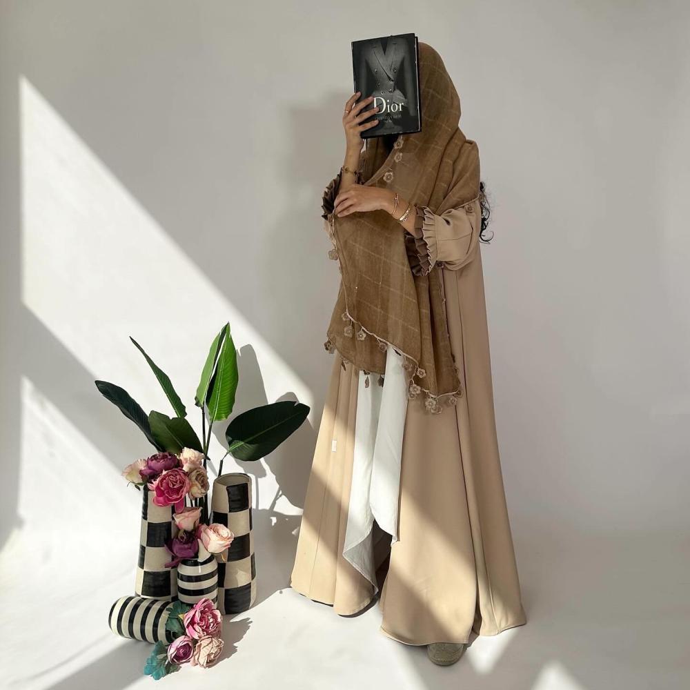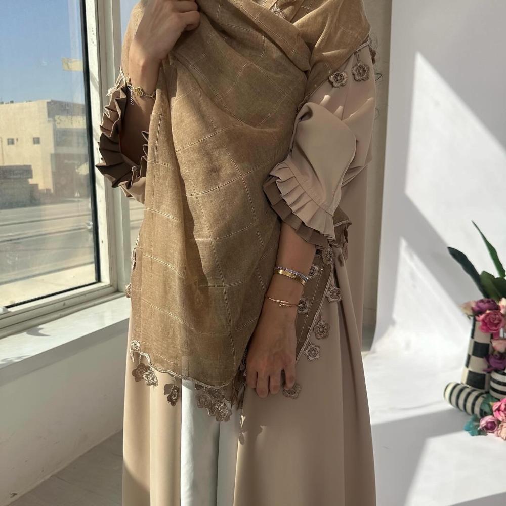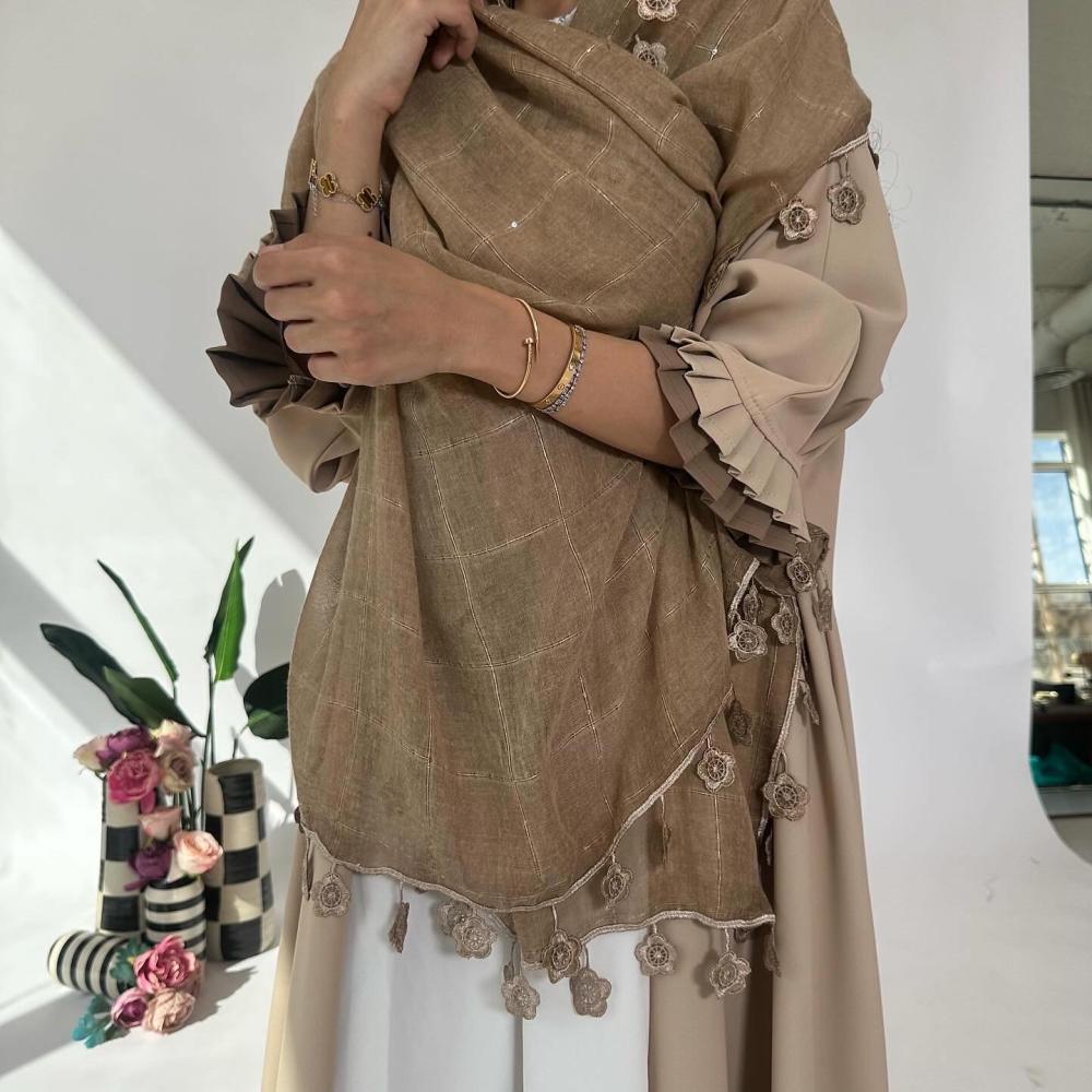 كريب بيج | الكم مكسر طبقتين بيج فاتح وغامق | الطرحه لينن خفيف بورود ولمعه خفيفه