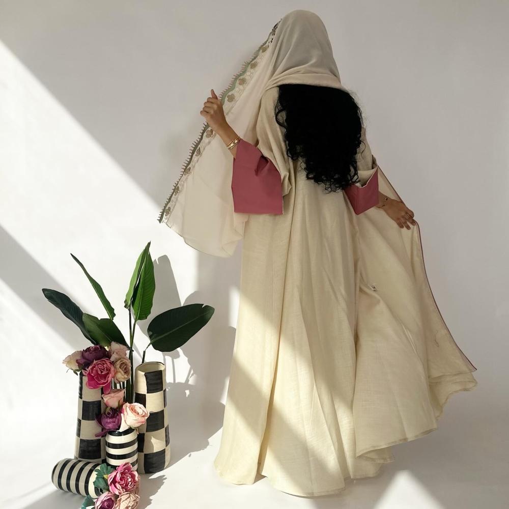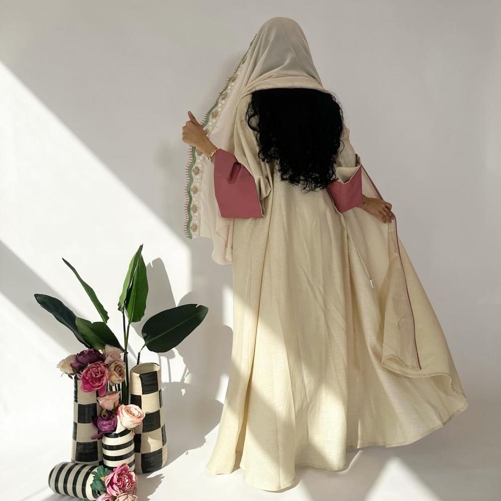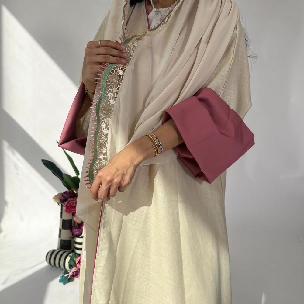 لينن بيج فاتح | الكم سفطه غير مثبته كتان | قيطان | الطرحه شيفون بطرف كلفه مشجره