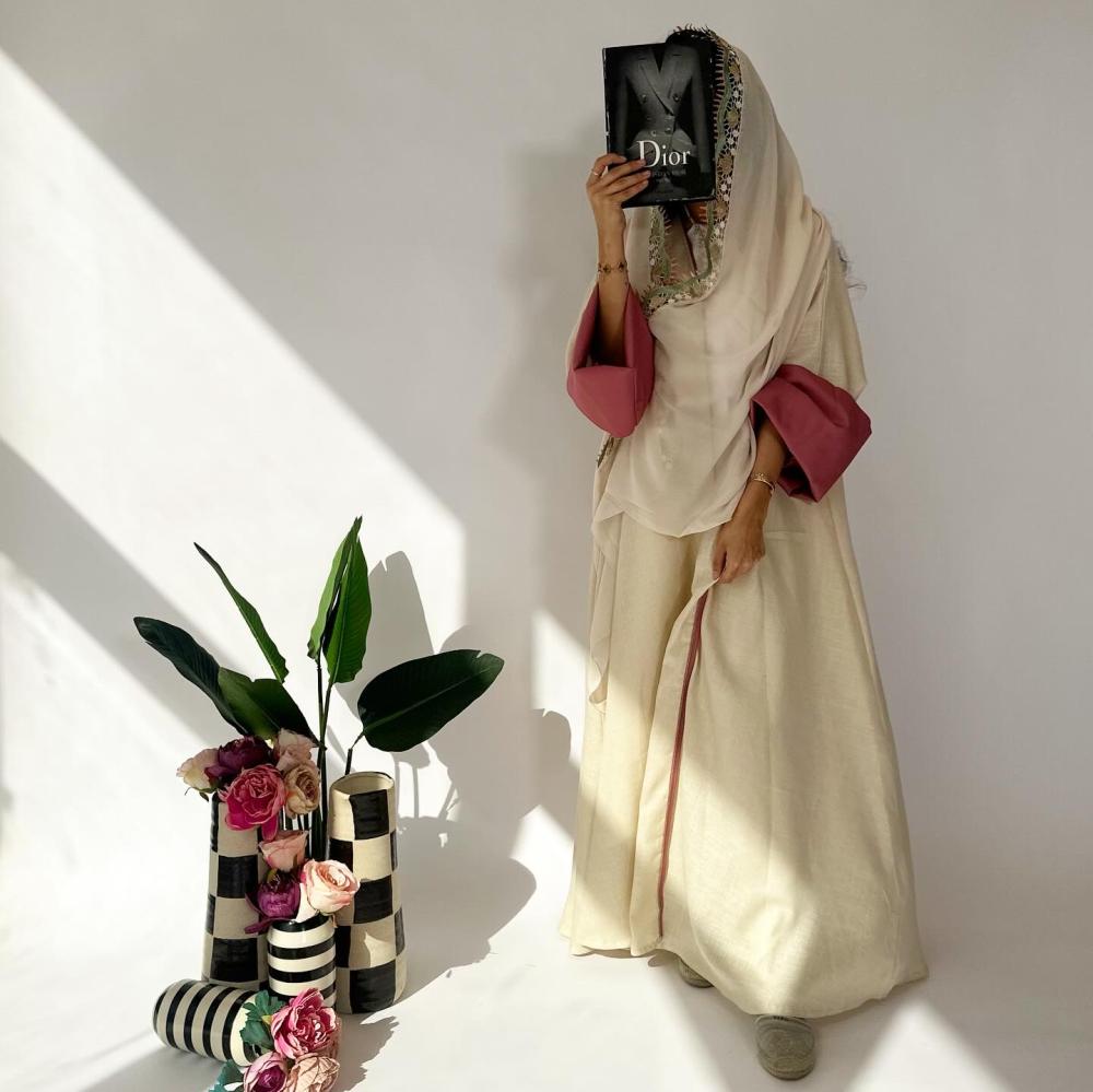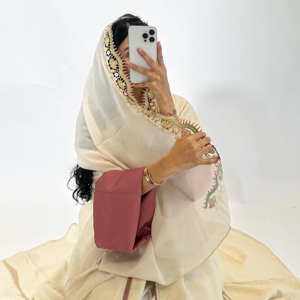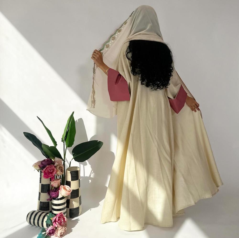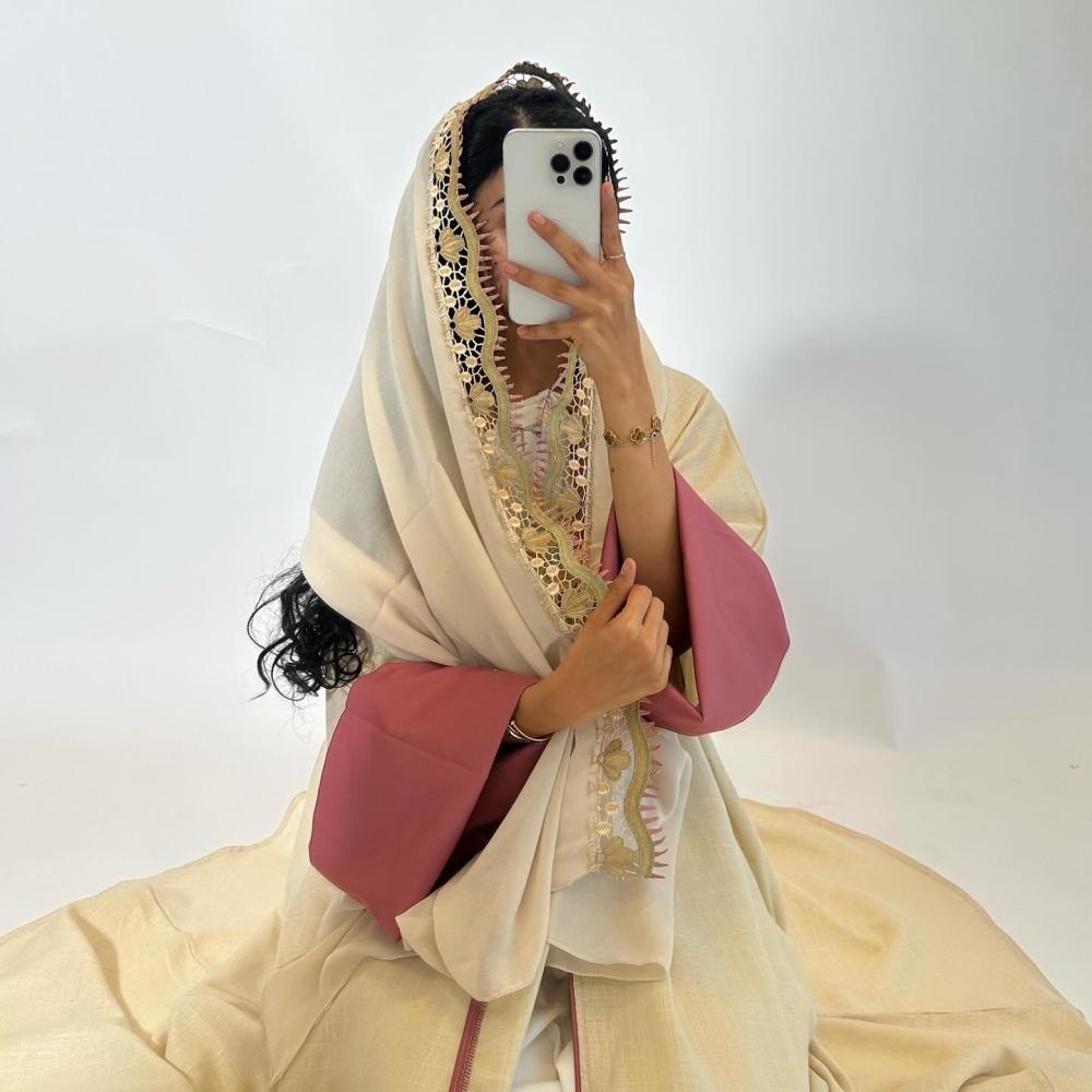 لينن بيج فاتح | الكم سفطه غير مثبته كتان | قيطان | الطرحه شيفون بطرف كلفه مشجره