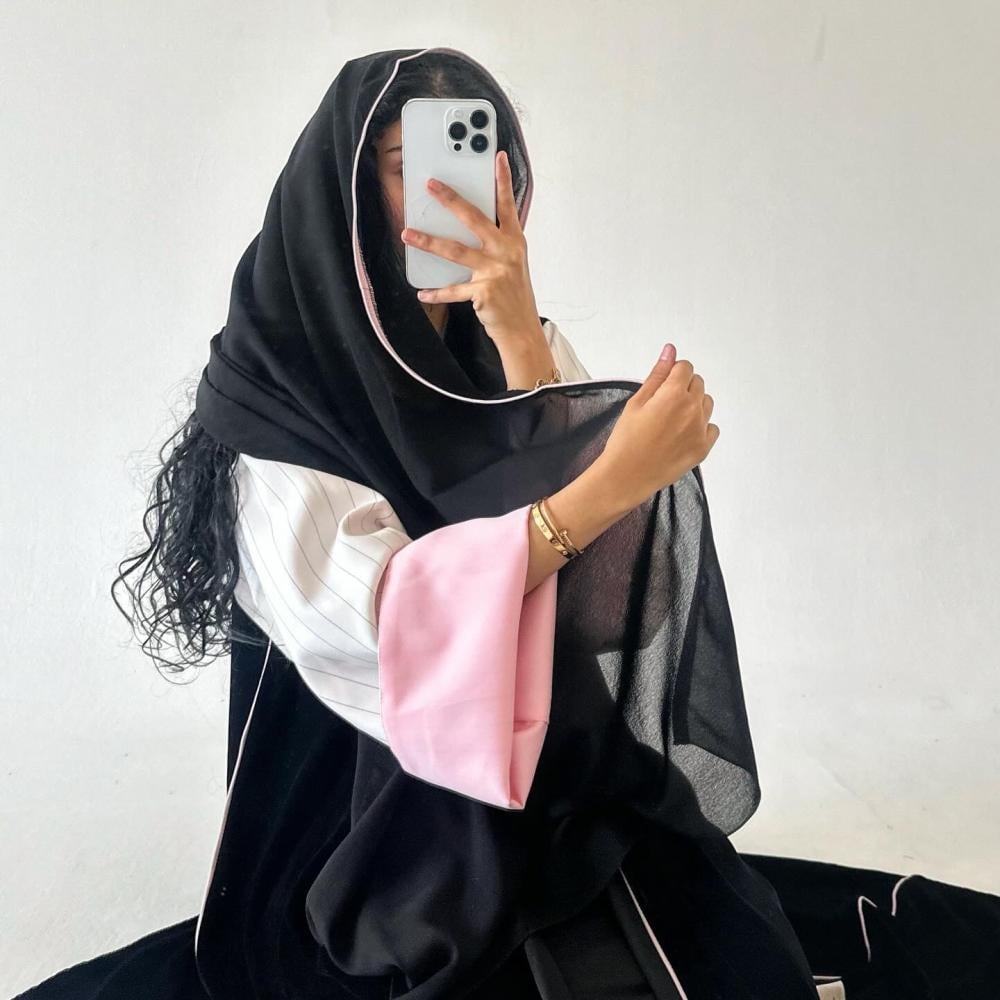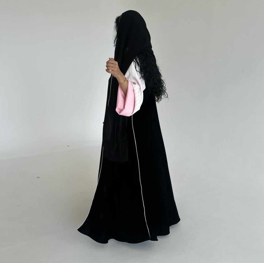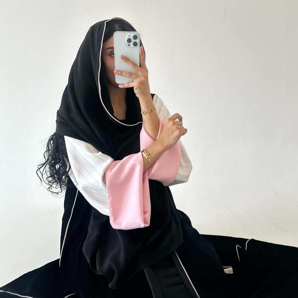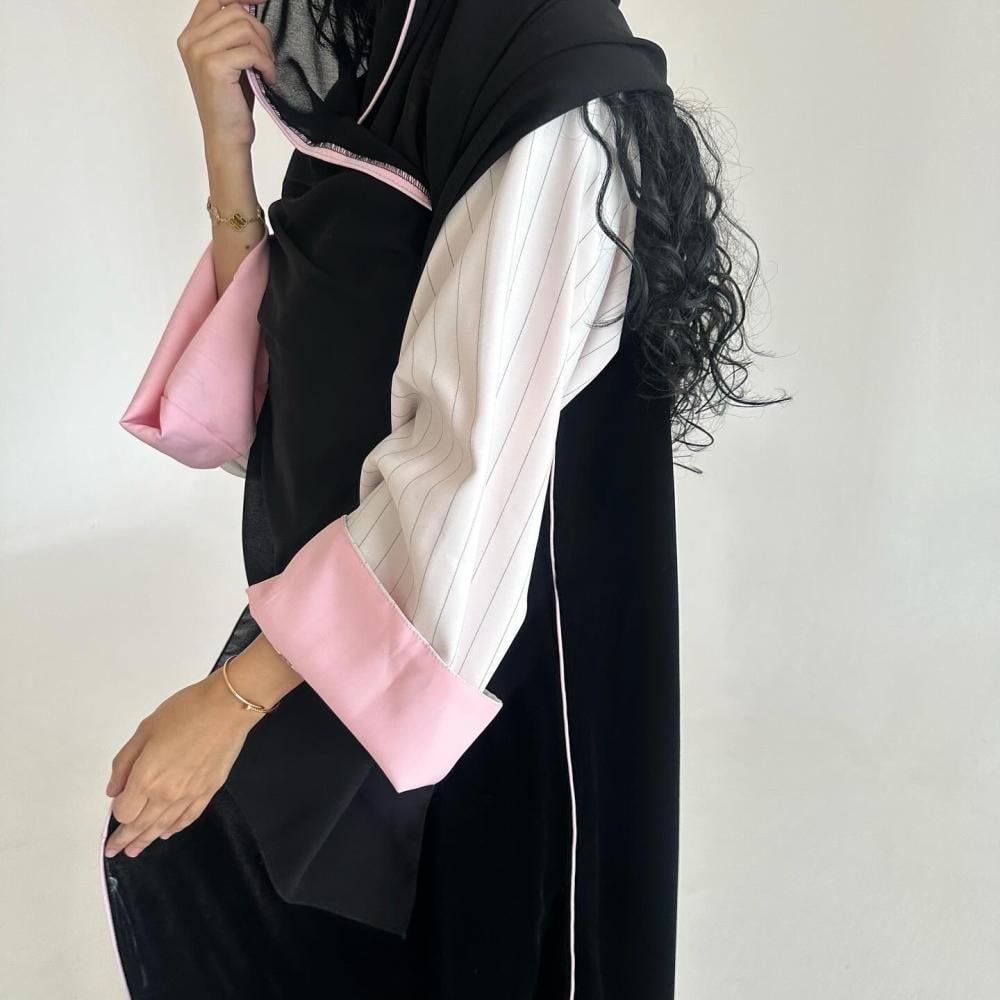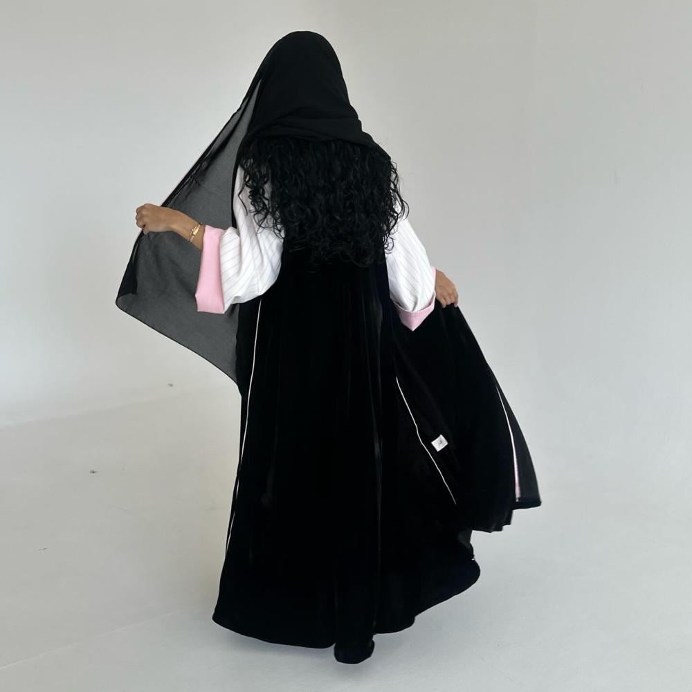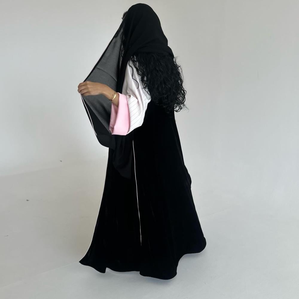 مخمل كوري اسود | الكم كتان مخطط مبطن بكتان وردي | قيطان وردي كامل العبايه | الطرحه شيفون بقيطان وردي