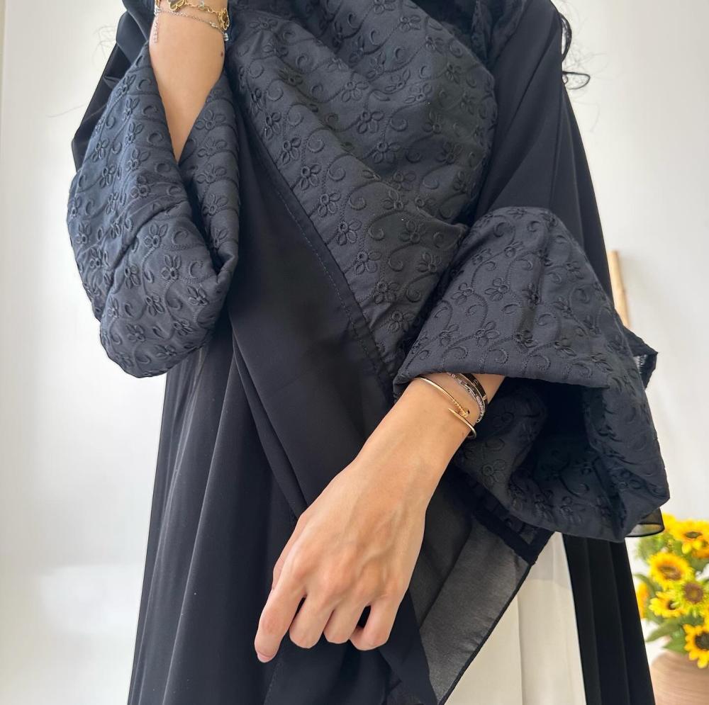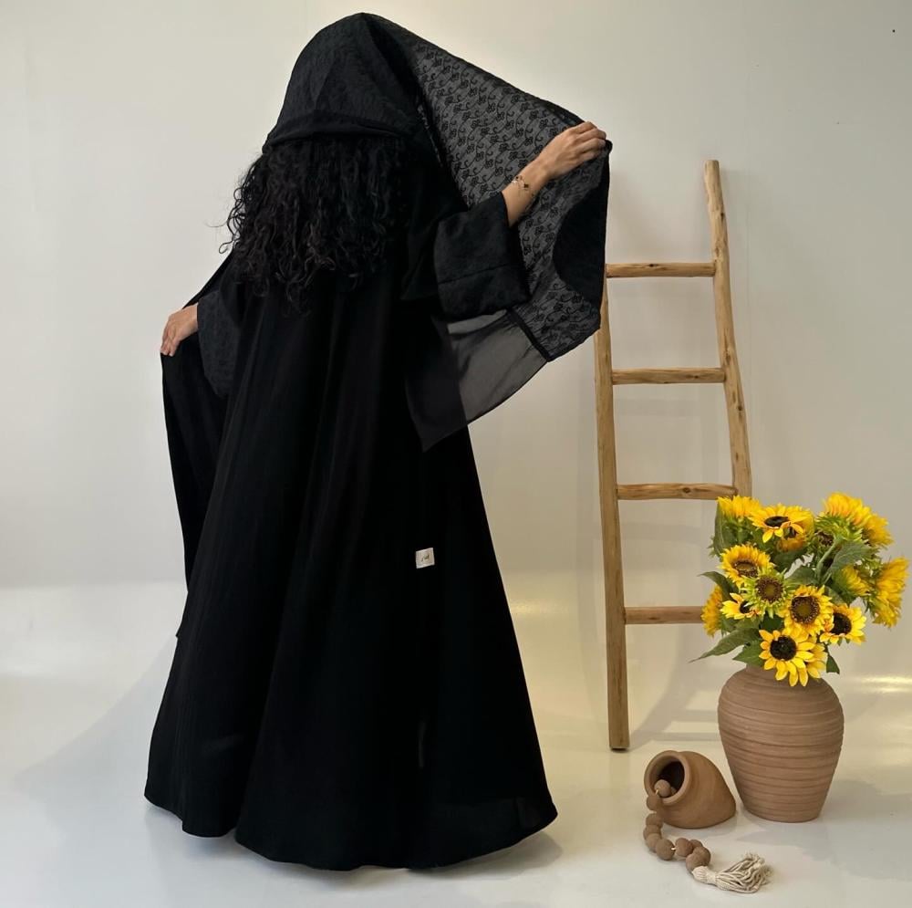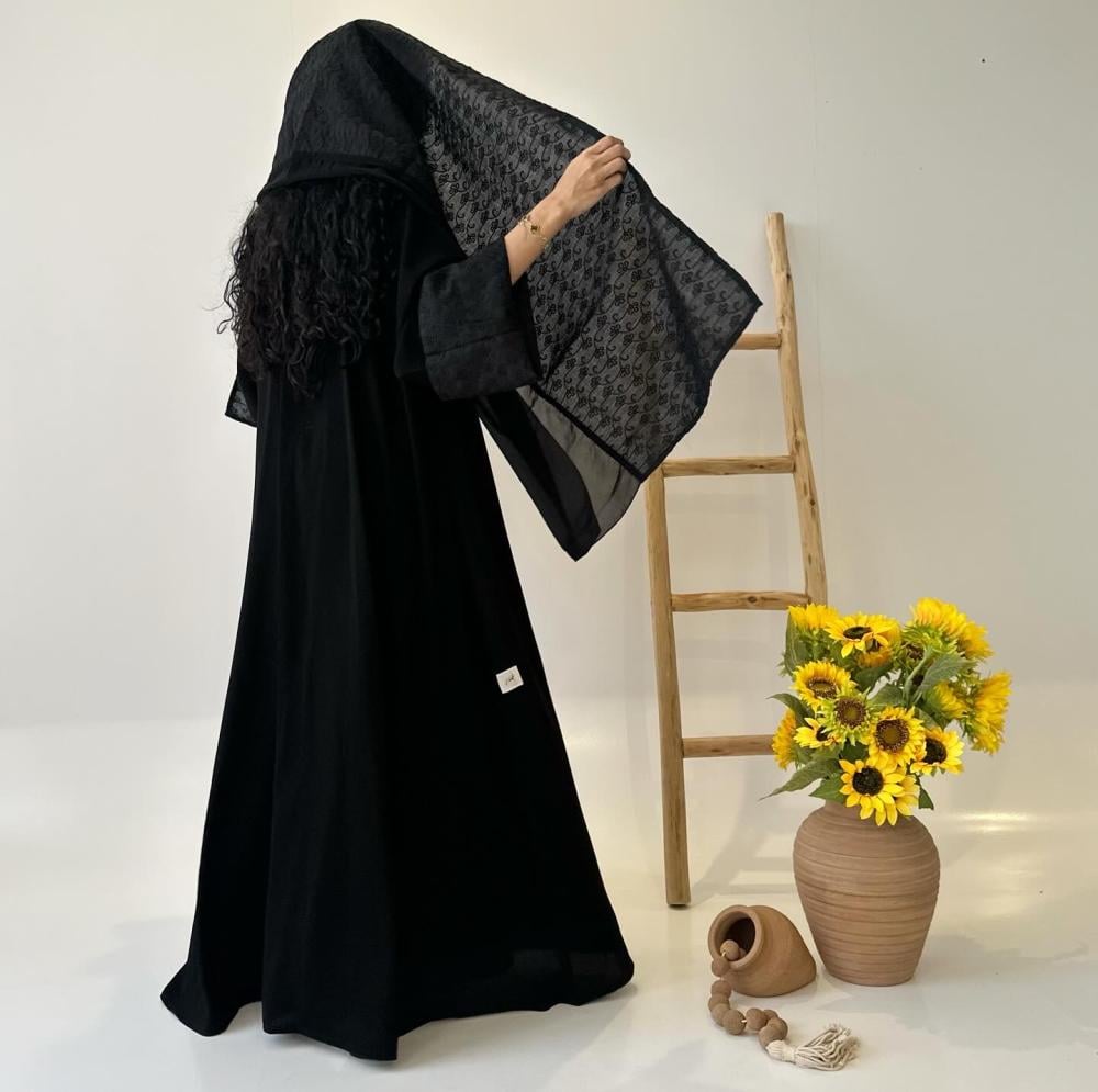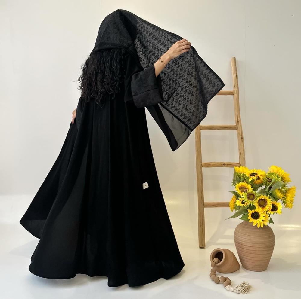 كريب ملكي كوري اسود | الكم سفطه "غير مثبته" بقماش ركاما اسود واقف | الطرحه نص شيفون اسود ونص قماش ركاما اسود واقف