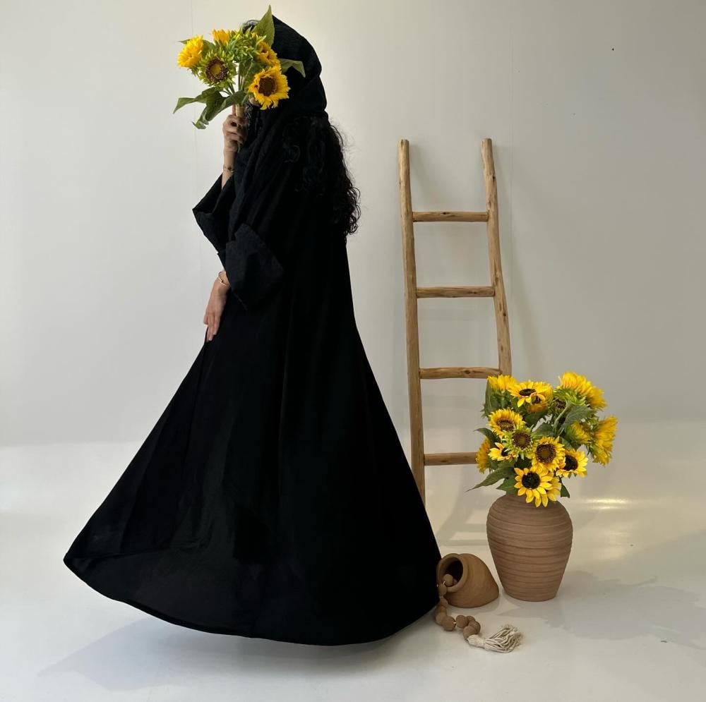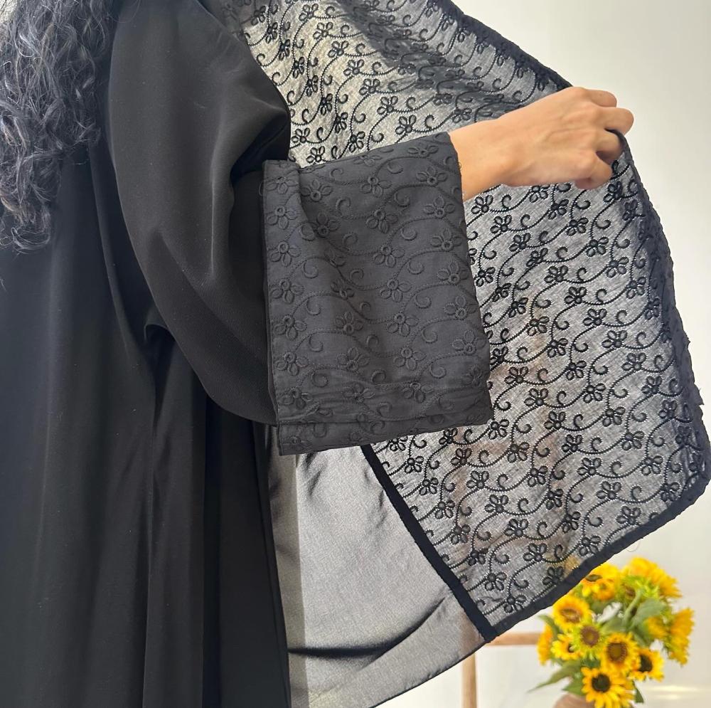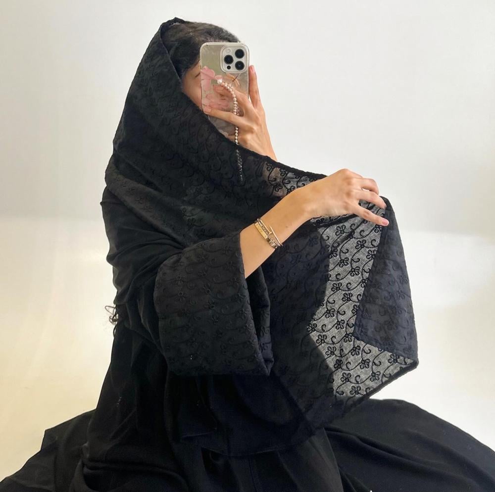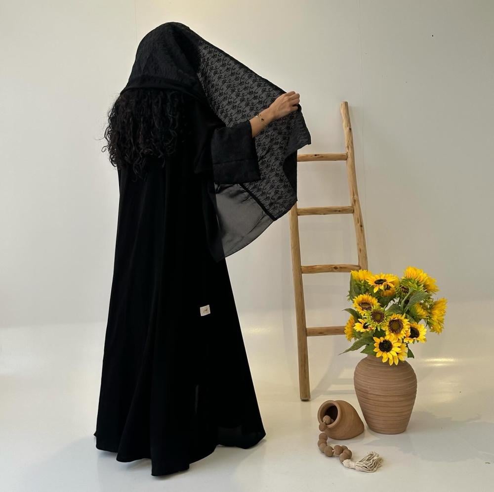 كريب ملكي كوري اسود | الكم سفطه "غير مثبته" بقماش ركاما اسود واقف | الطرحه نص شيفون اسود ونص قماش ركاما اسود واقف
