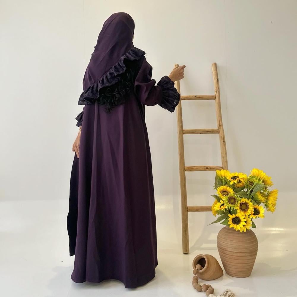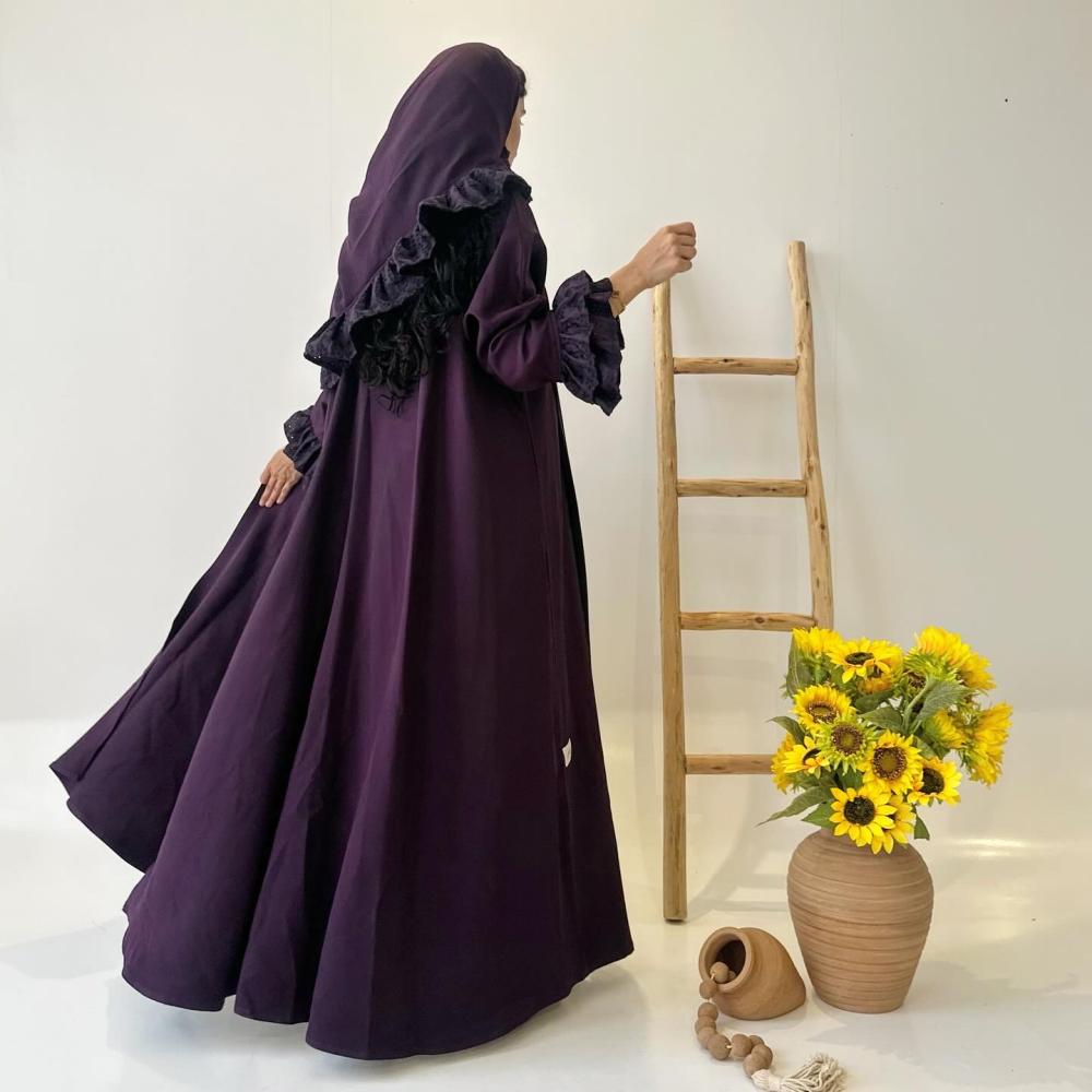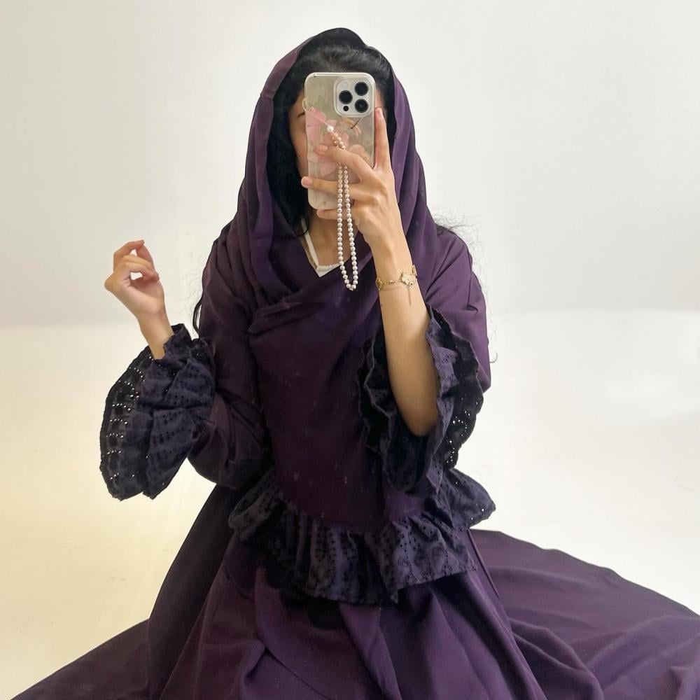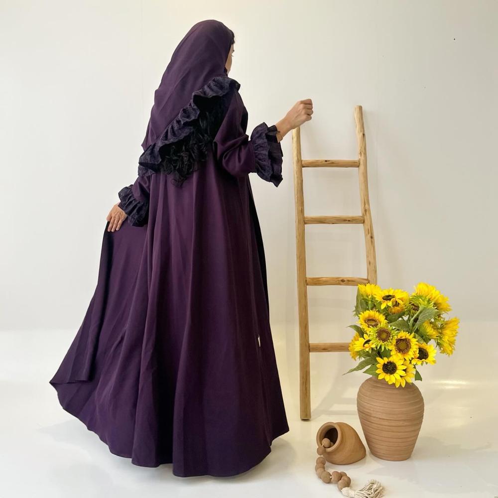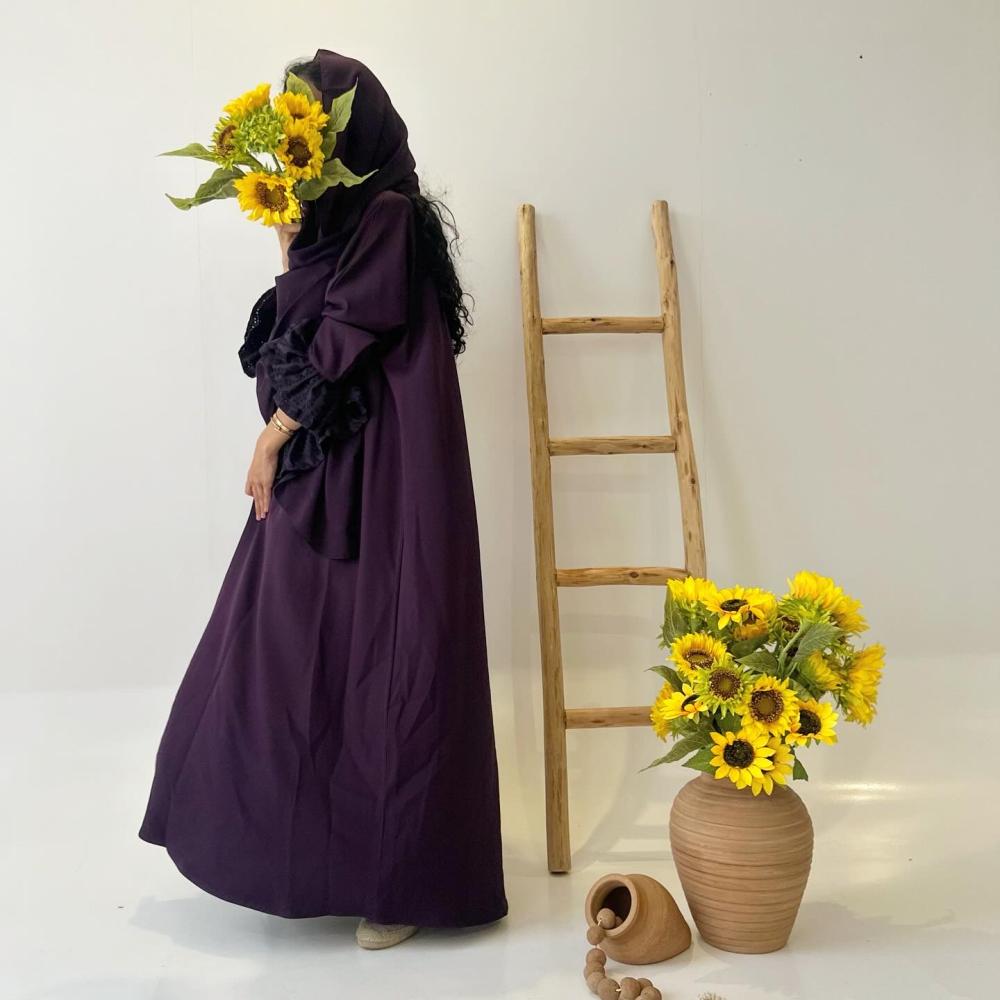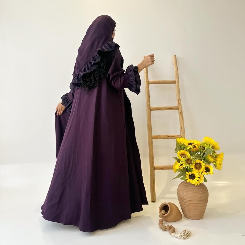 كتان تايواني موف | الكم قماش ركاما طبقتين مكسر | الطرحه شيفون بطرف قماش ركاما مكسر