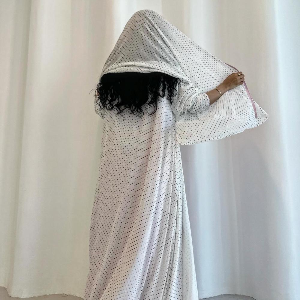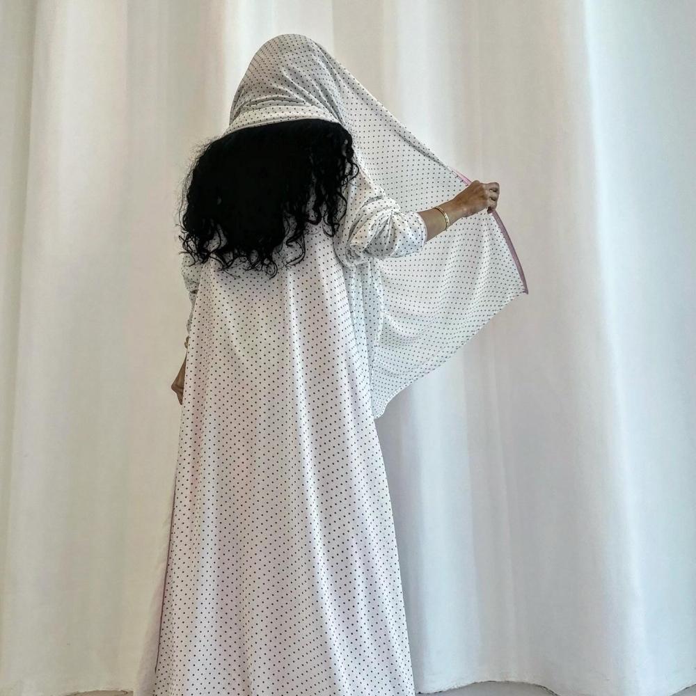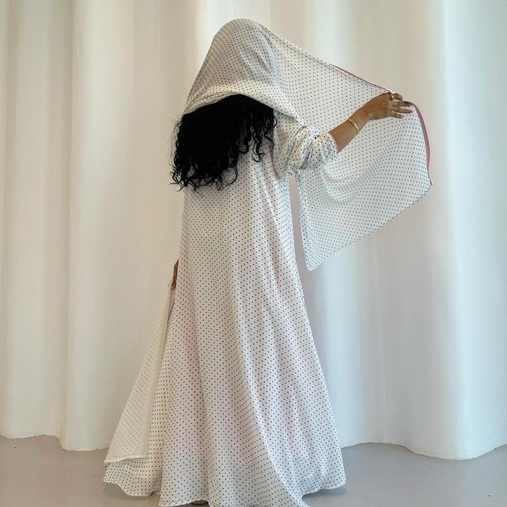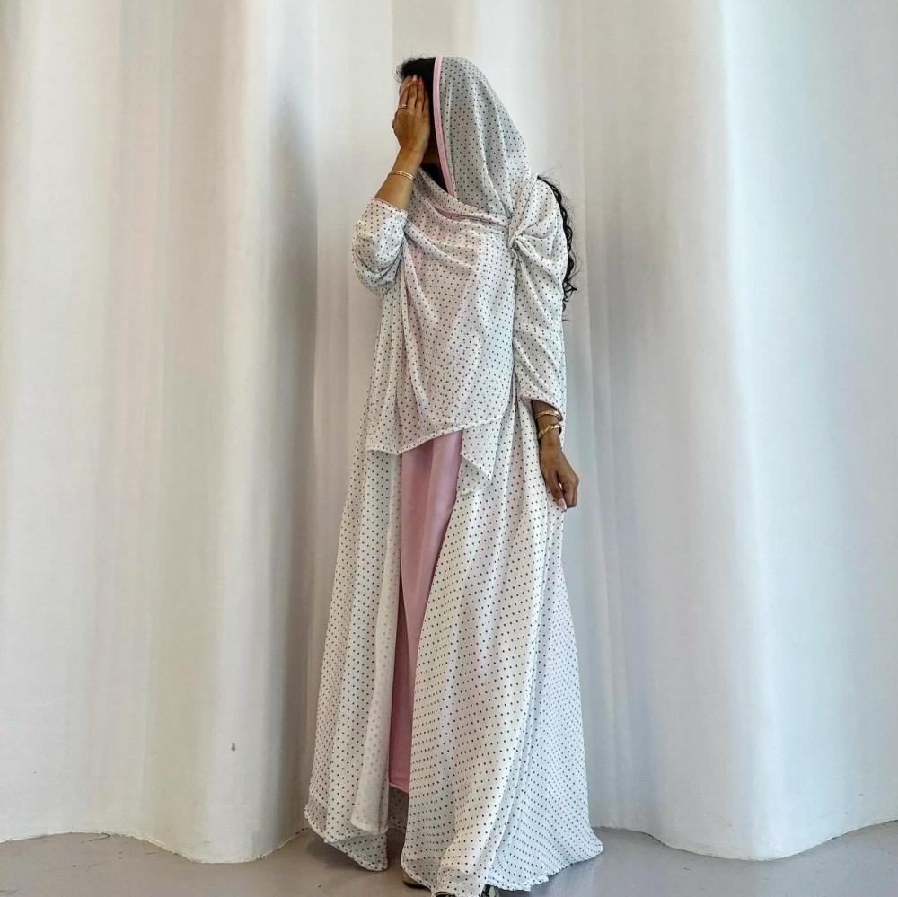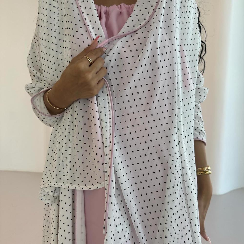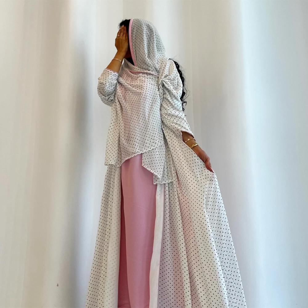 شيفون منقط مبطن بقماش شيفون | قيطان وردي فالاكمام والعبايه | الطرحه شيفون منقط بقيطان وردي