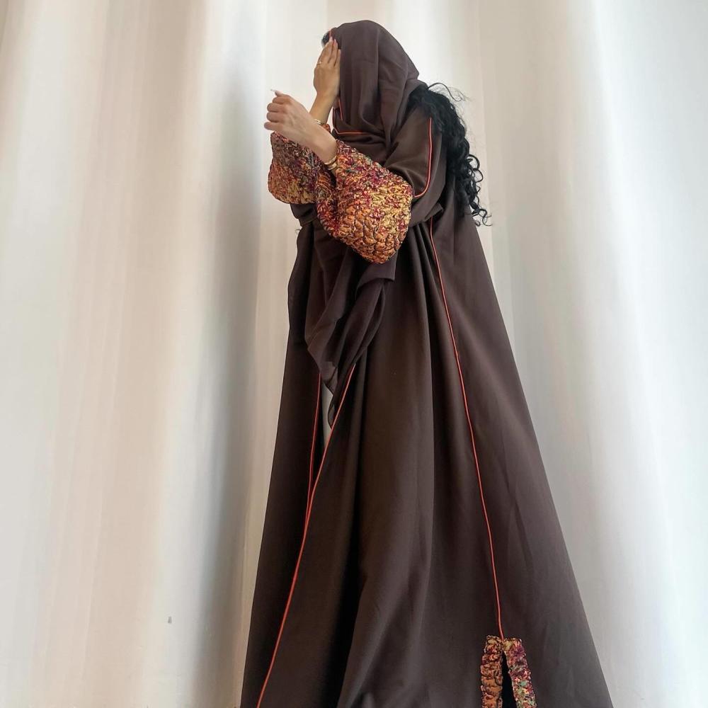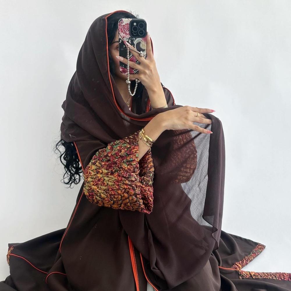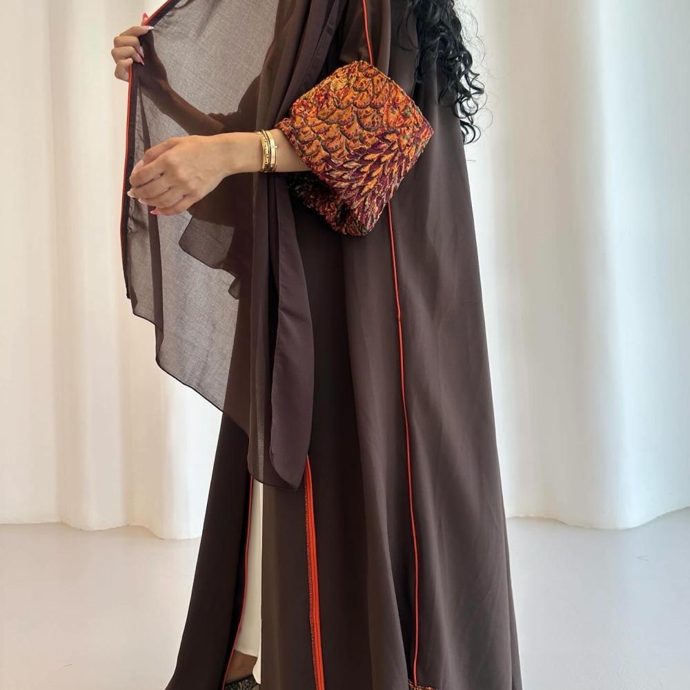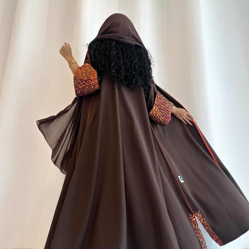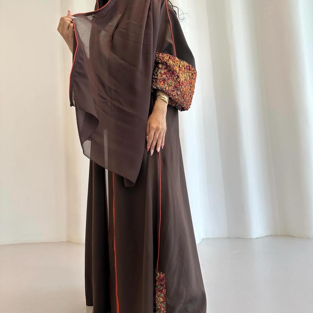 كتان تايواني بني | الكم سفطه تفته جاكار بنقشه مموجه بارزه " سفطه غير مثبته " | قيطان كامل العبايه | كسرات صغير من الجوانب | الطرحه شيفون ساده بقيطان