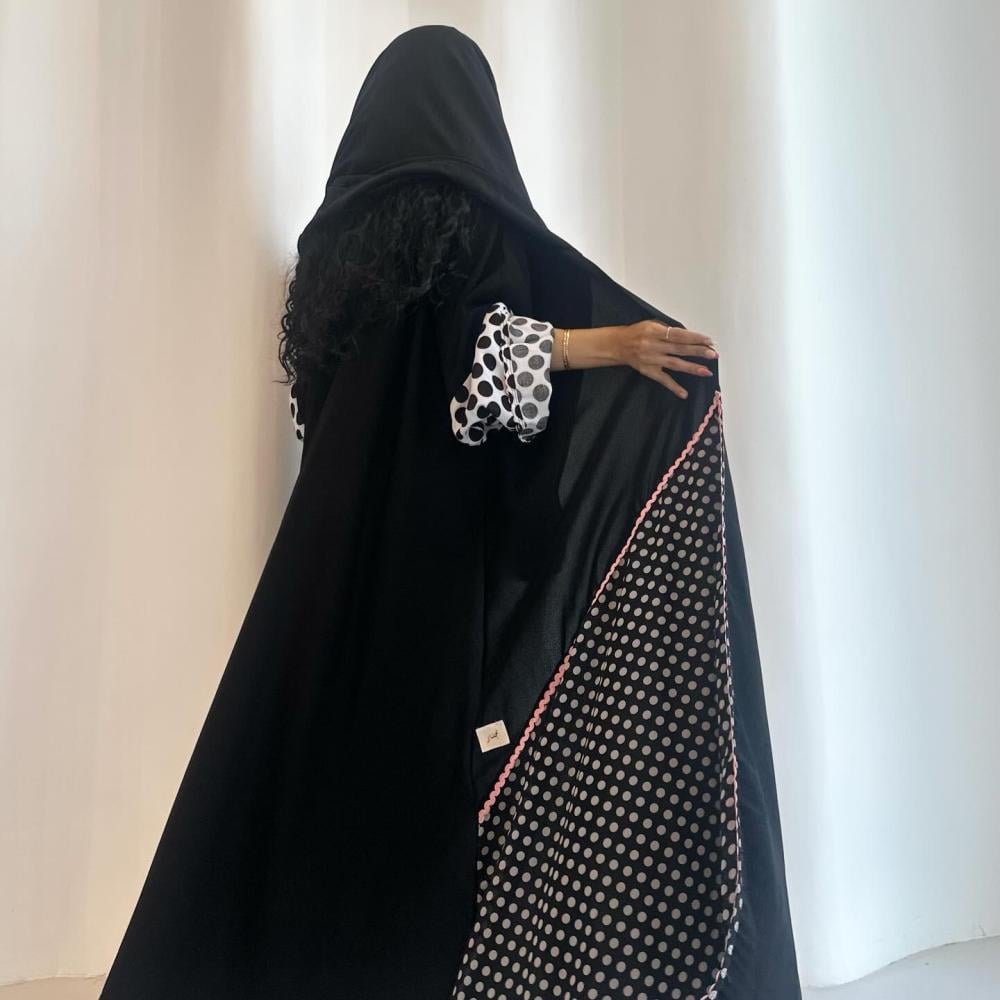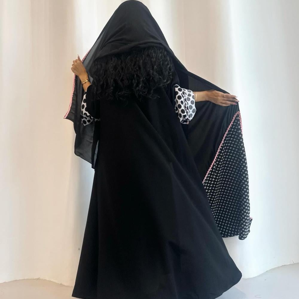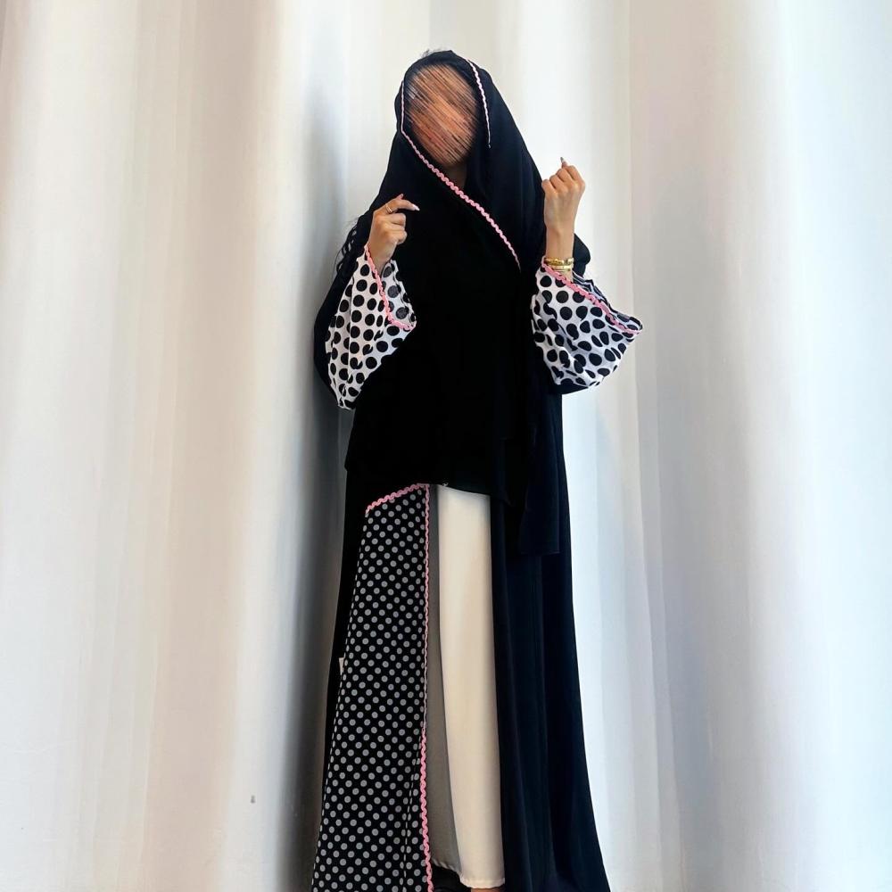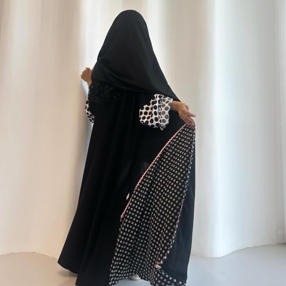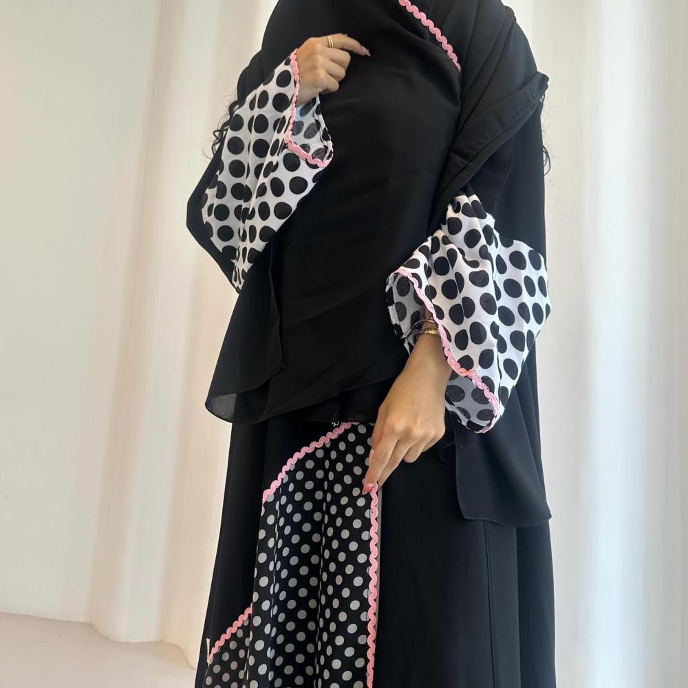 كريب ملكي كوري اسود | قيطان وردي مموج | الكم قطن منقط | القطعه المنقطه بالاسفل قماش شيفون منقط مبطن | الطرحه شيفون بقيطان وردي