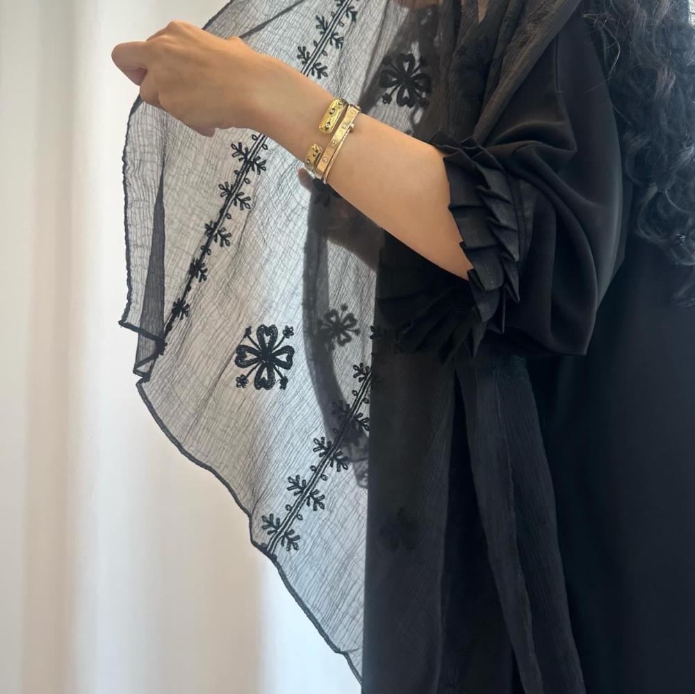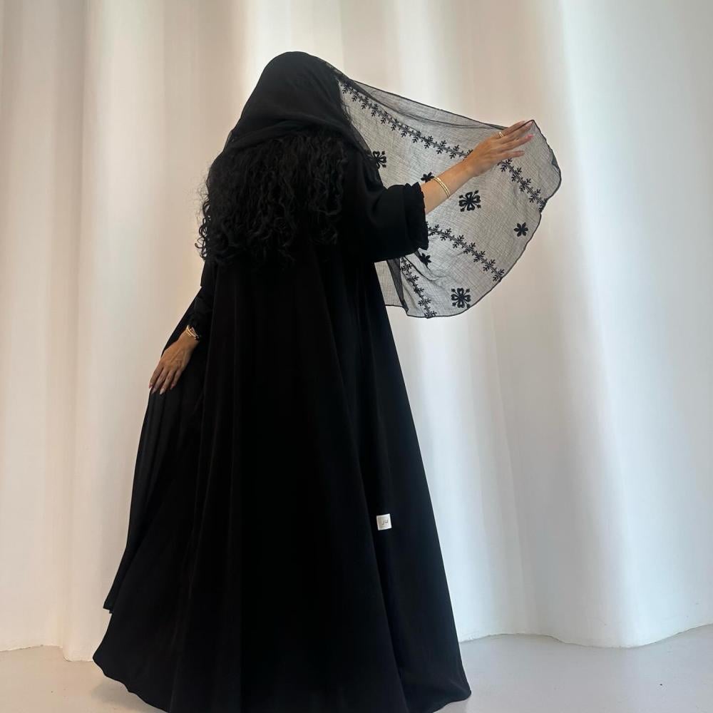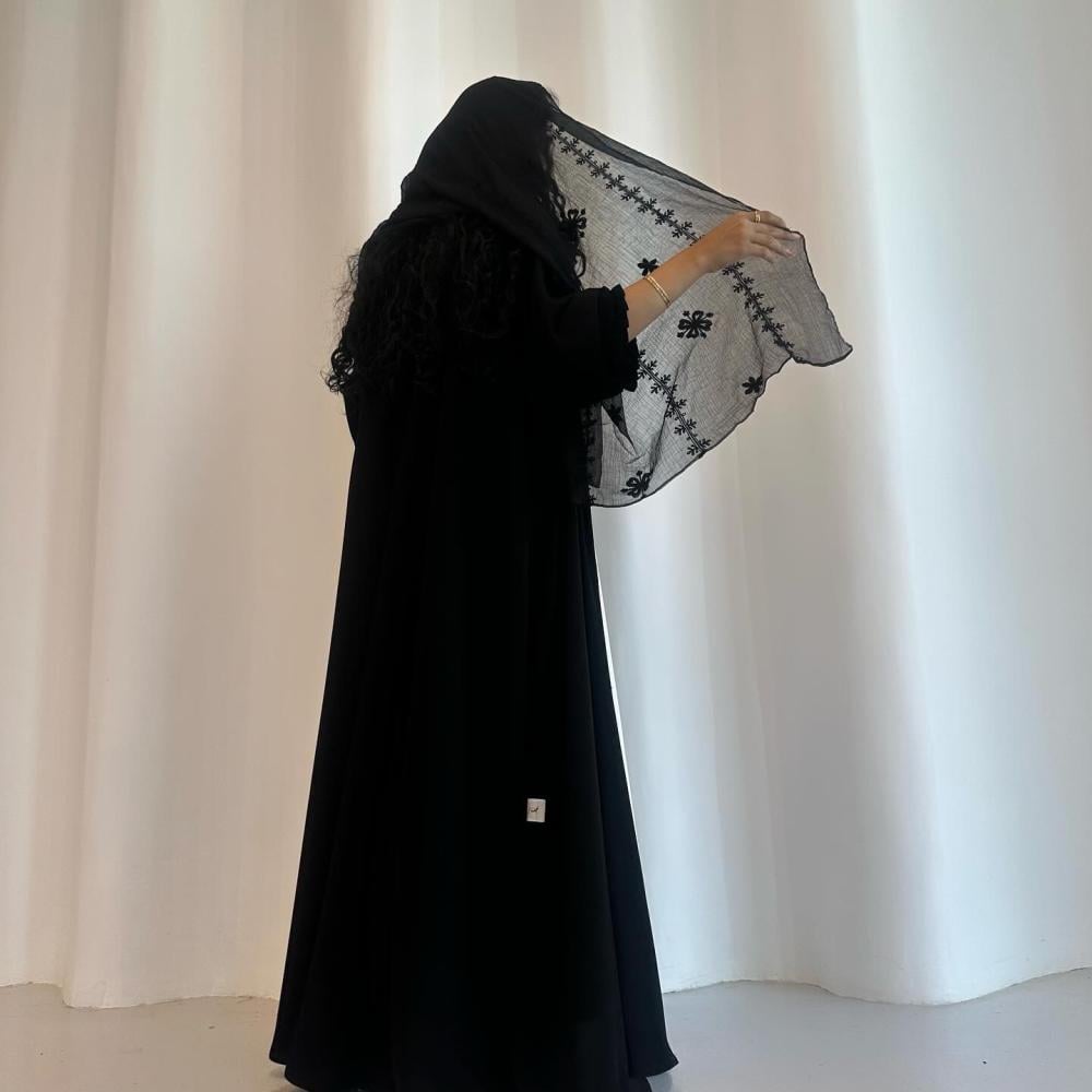 كريب ملكي كوري اسود | الكم كسرات طبقتين | الطرحه شيفون خفيف مشجر