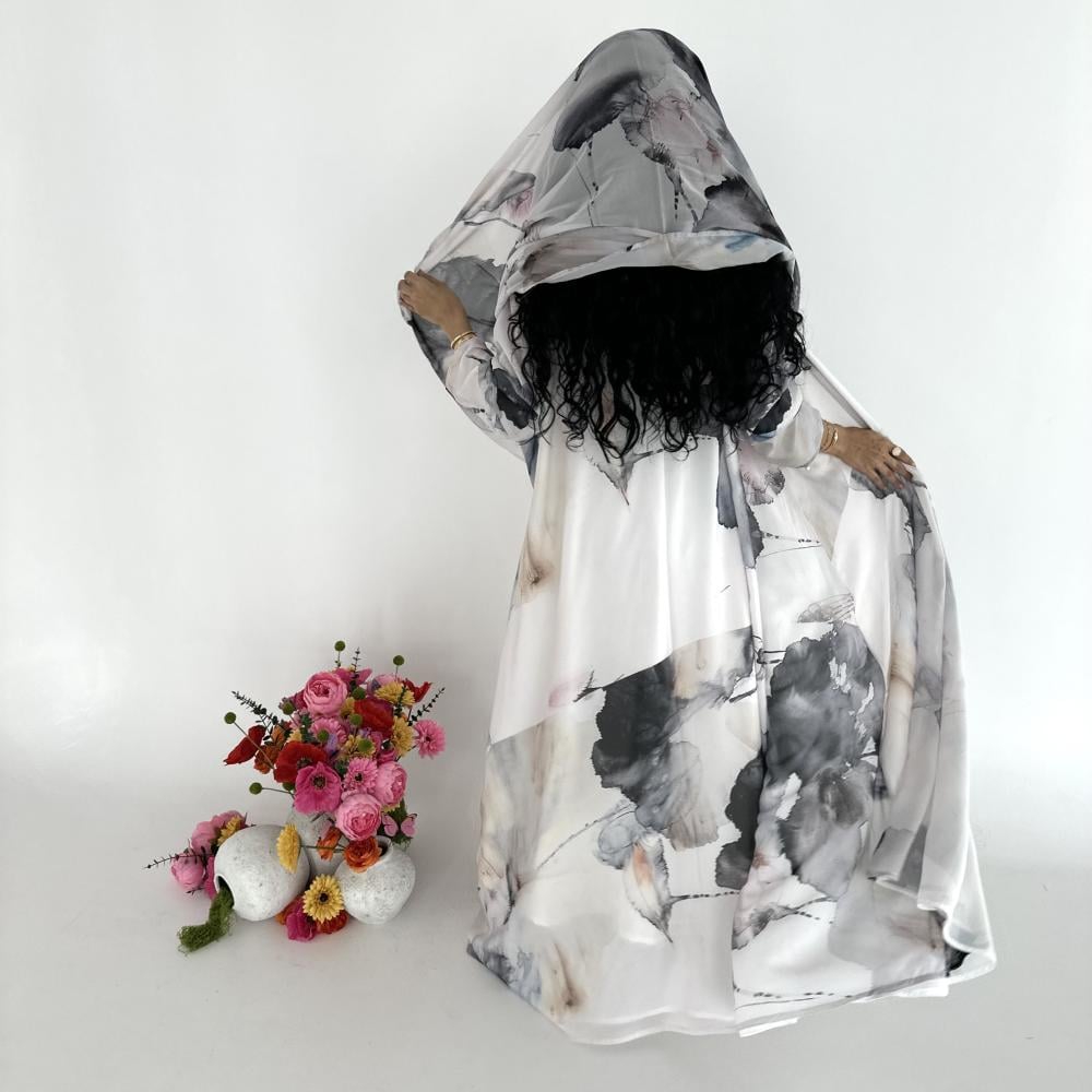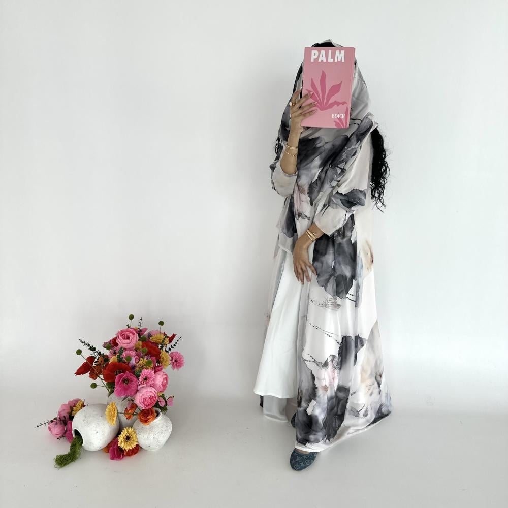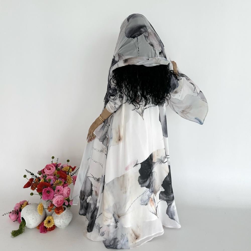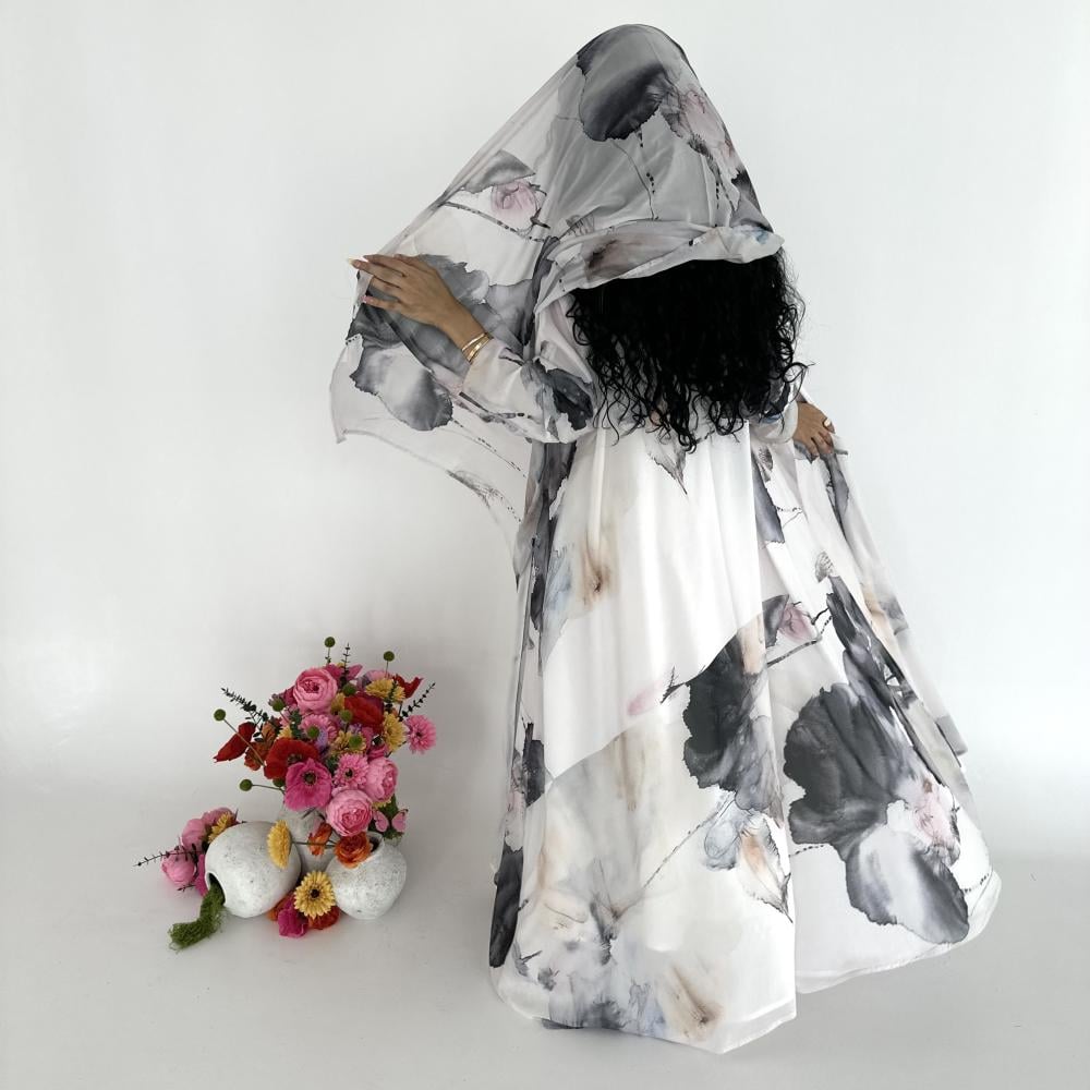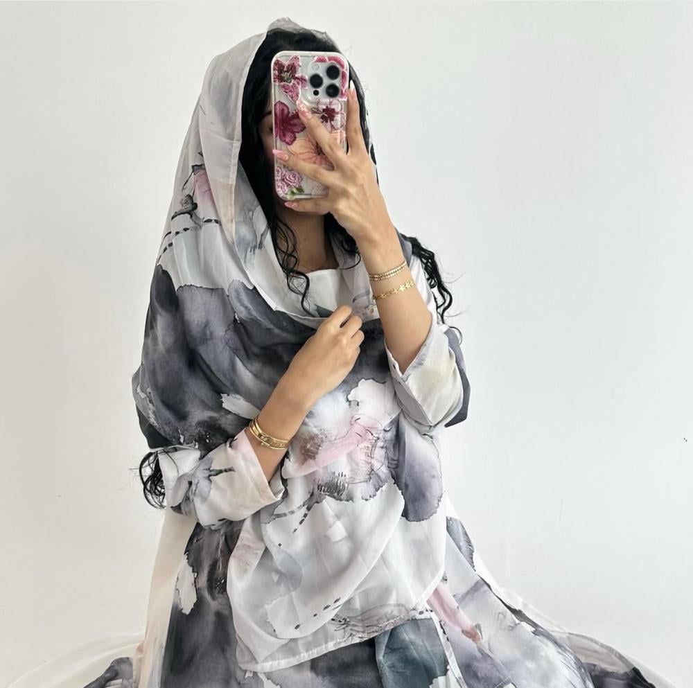 شيفون جورجيت ابيض طباعه | الكم ماسك | مبطن بشيفون جورجيت خفيف ابيض | الطرحه شيفون جورجيت طباعه