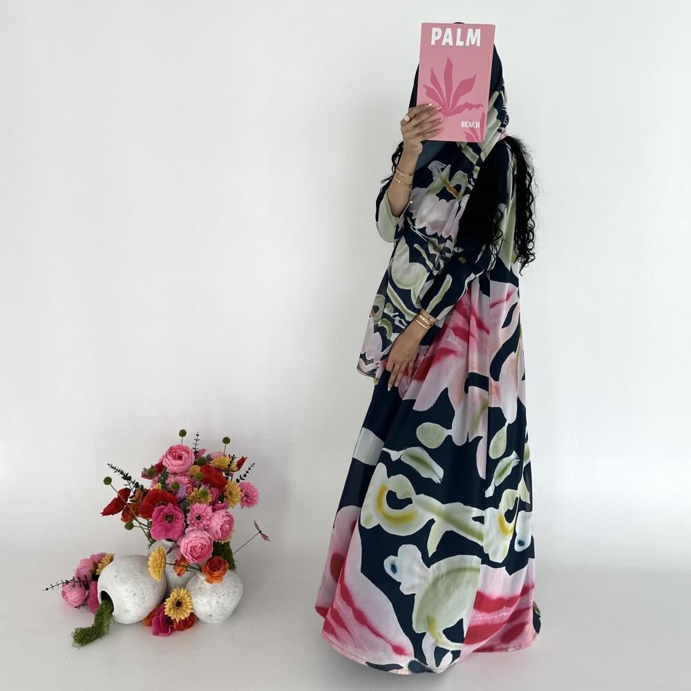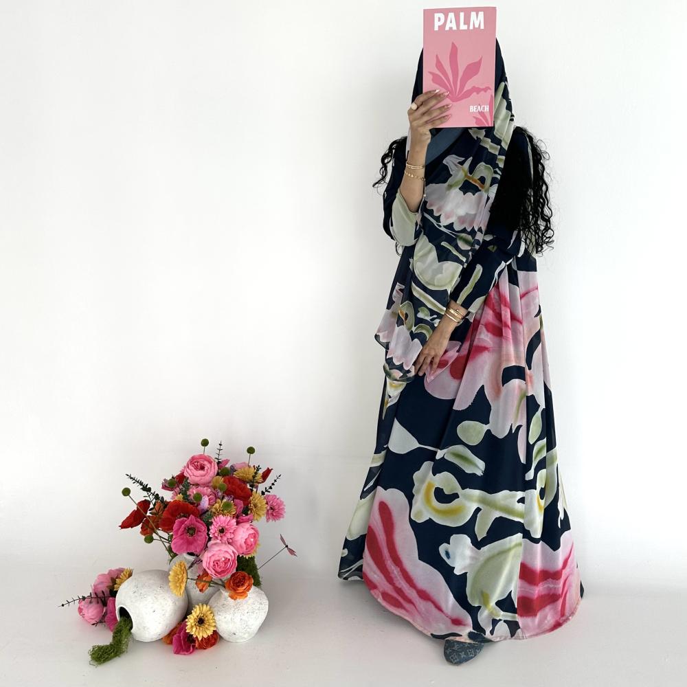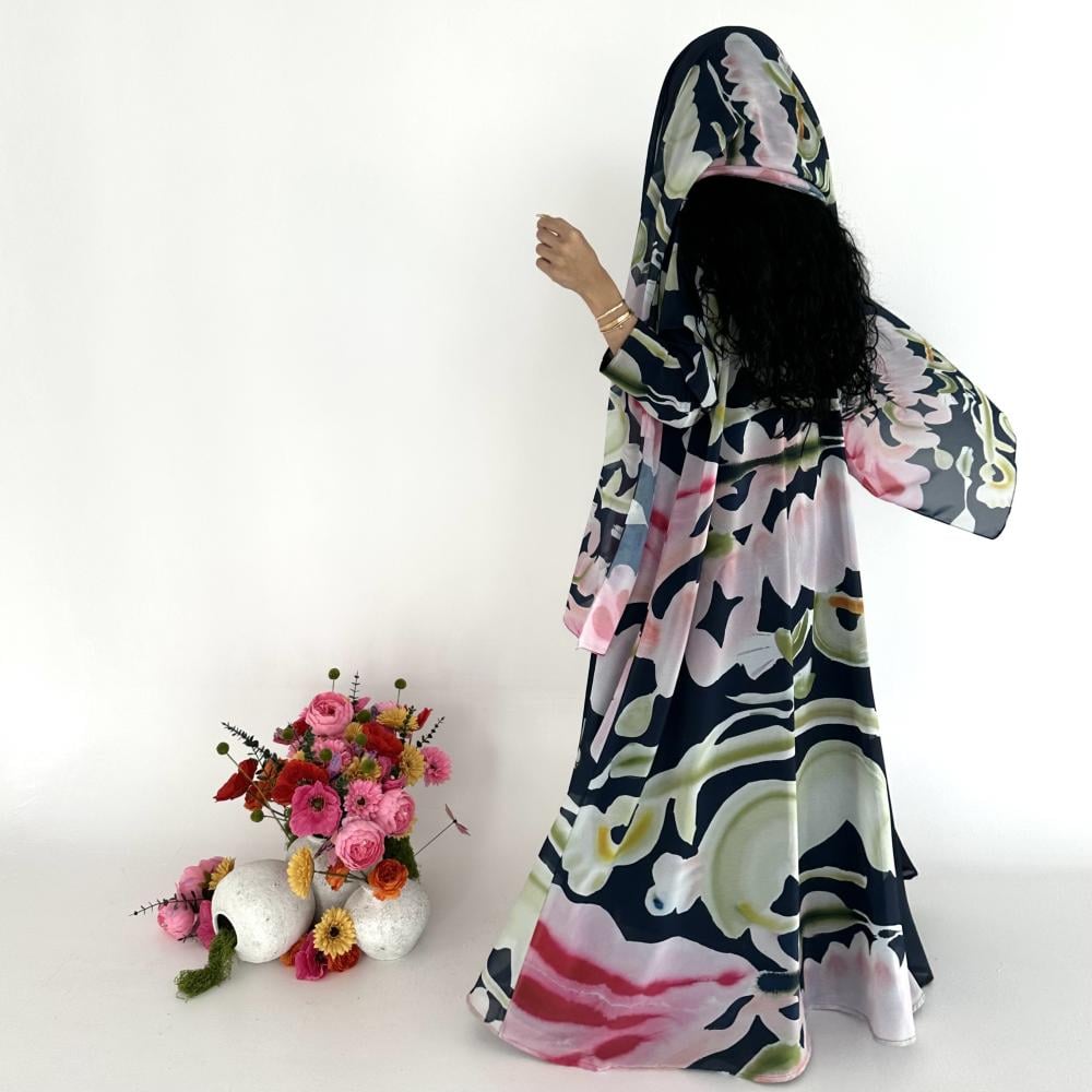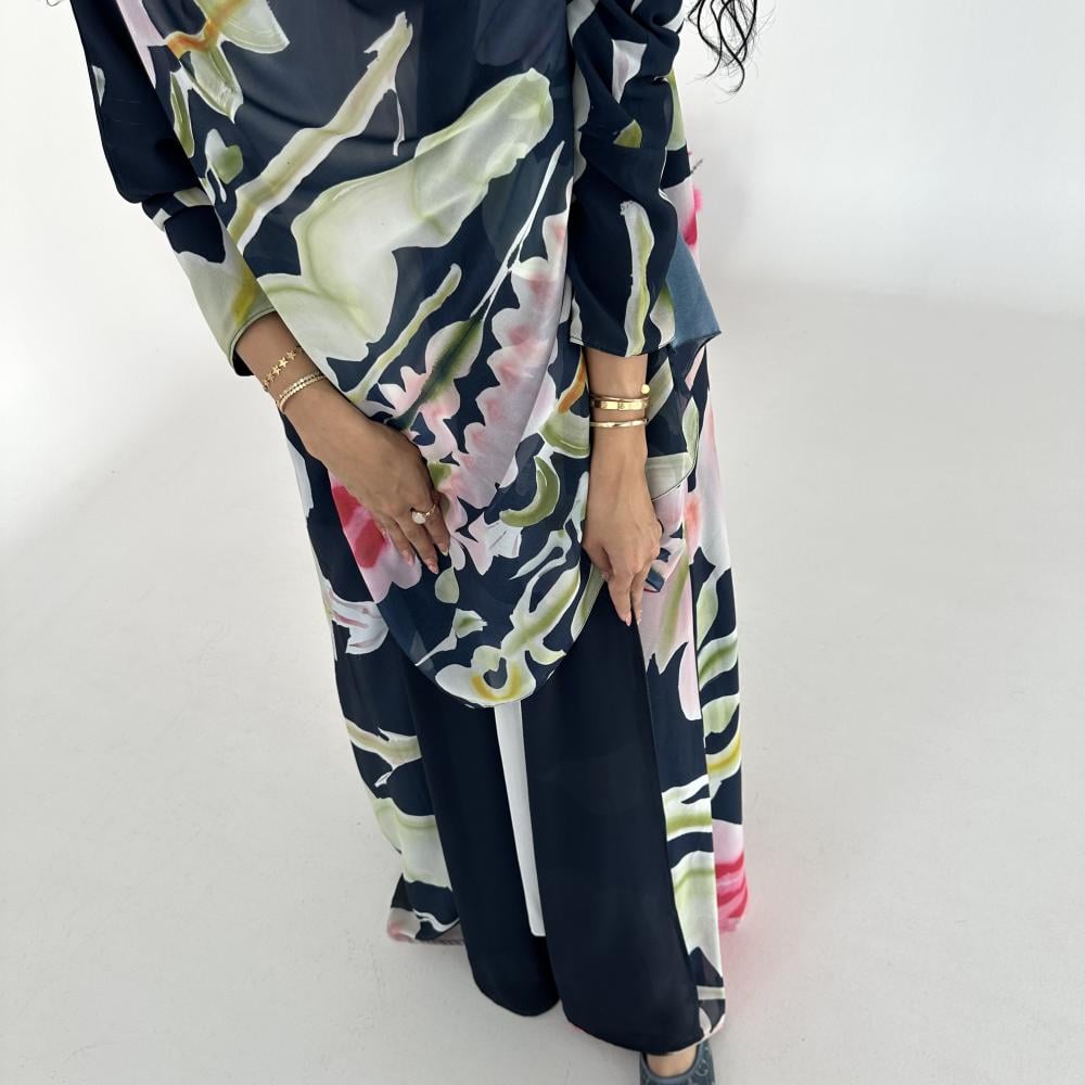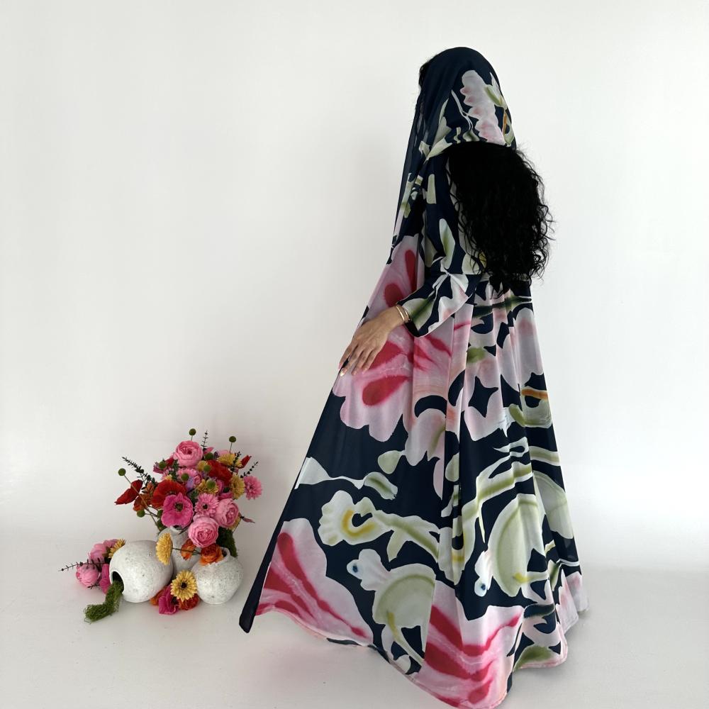 شيفون كحلي جورجيت طباعه | الكم ماسك | مبطنه بقماش شيفون جورجيت كحلي | الطرحه شيفون جورجيت طباعه