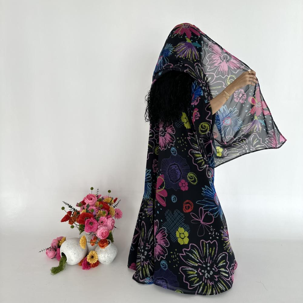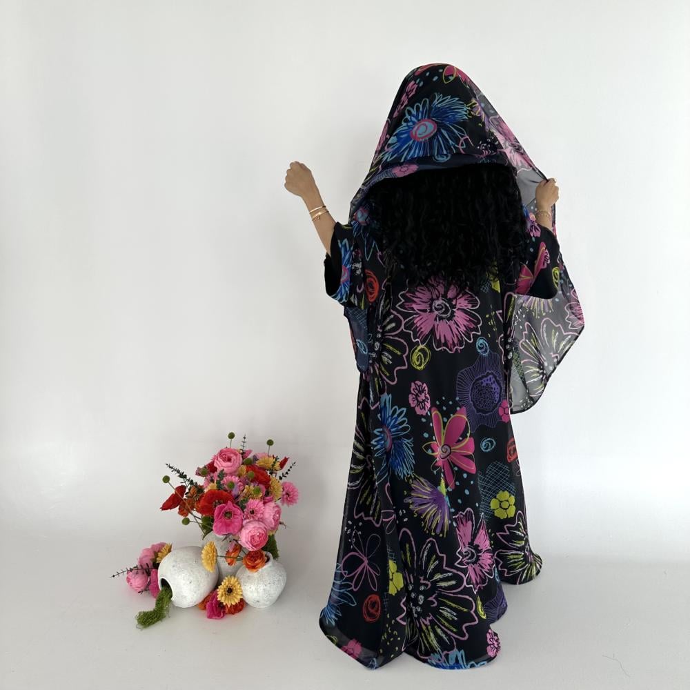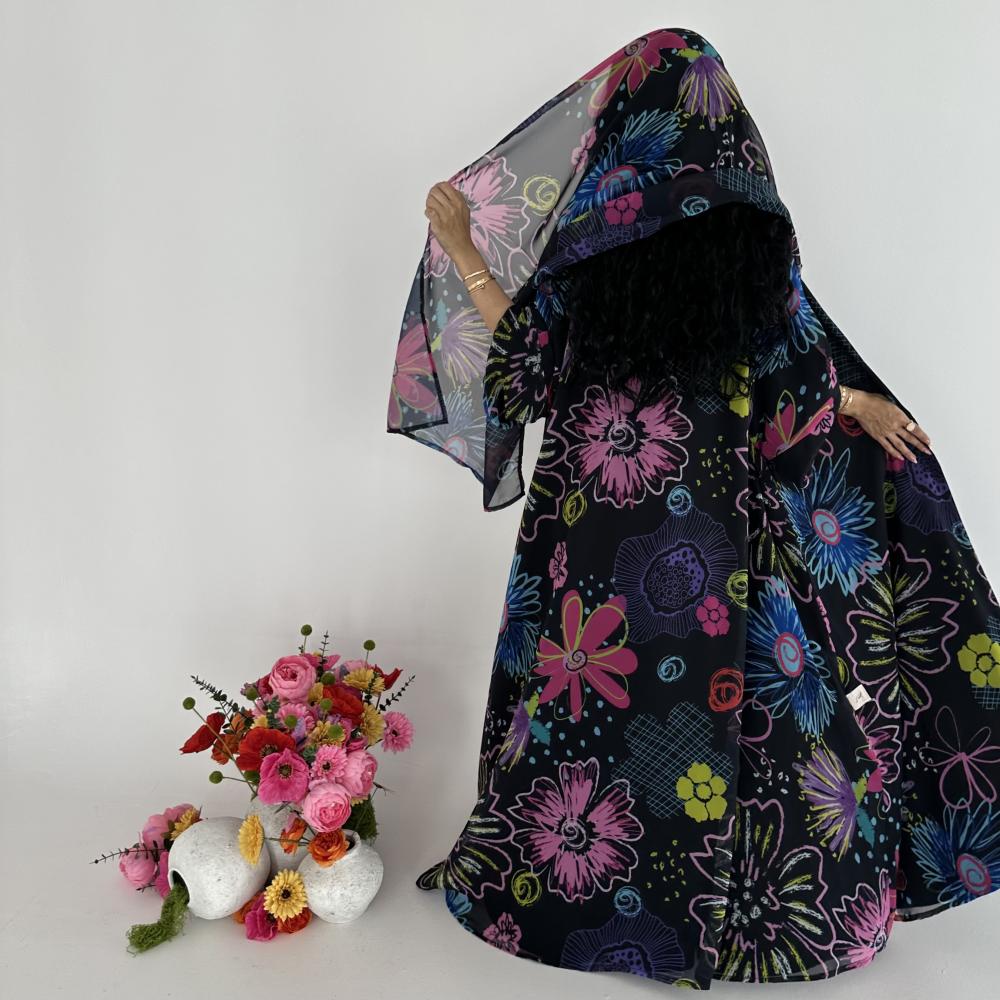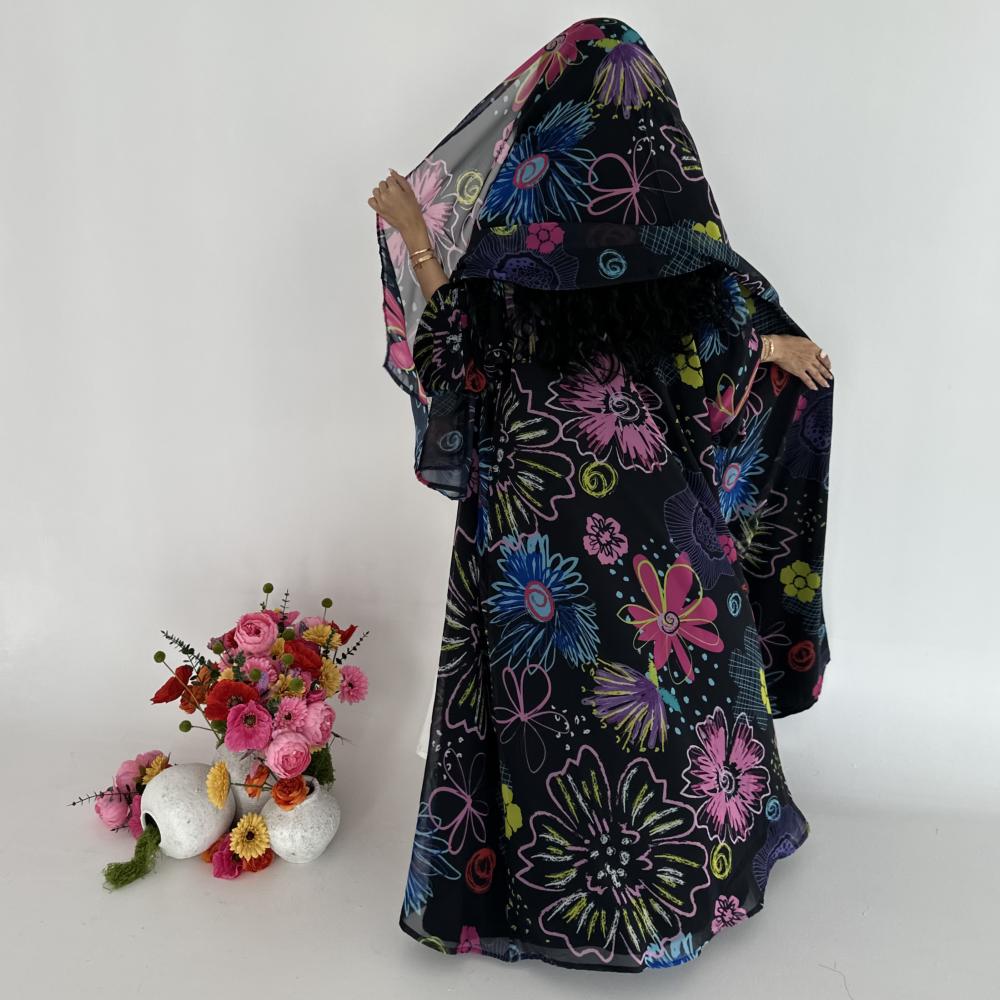 • شيفون اسود طباعه | الكم واسع  | مبطنه بقماش جورجيت اسود خفيف " يوجد بطانه اثقل في حال الرغبه " بلاك بيري ناعم " | الطرحه شيفون جورجيت طباعه
