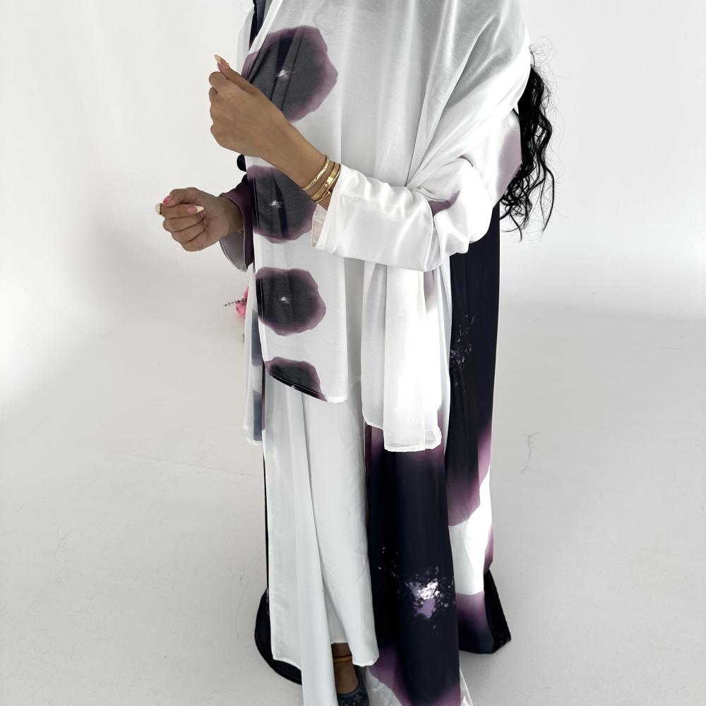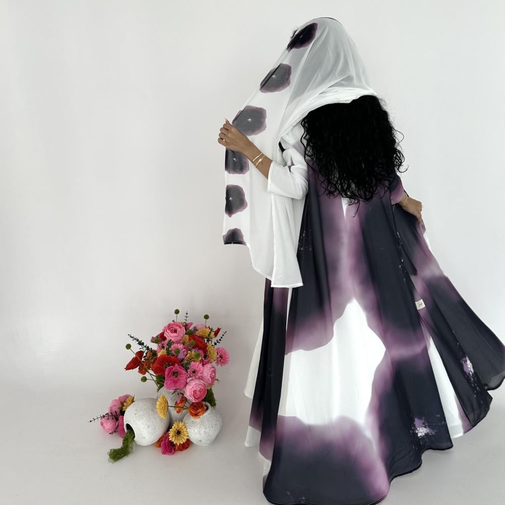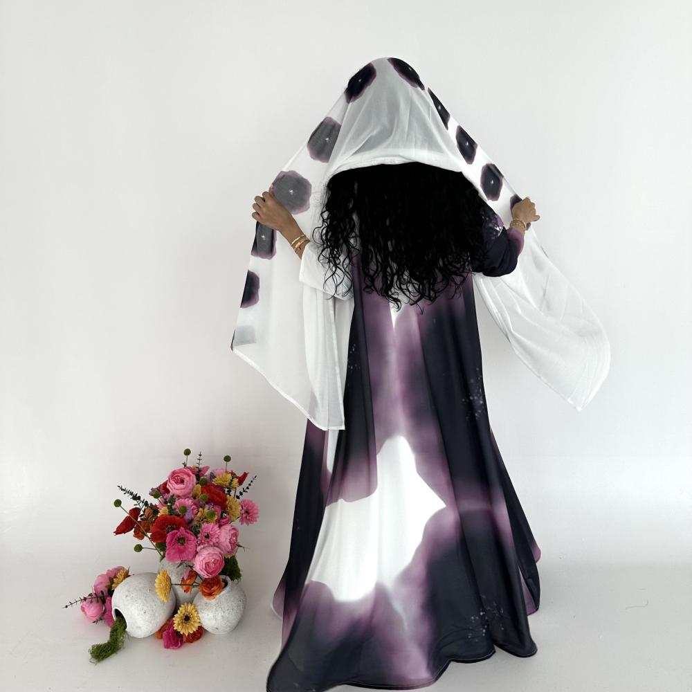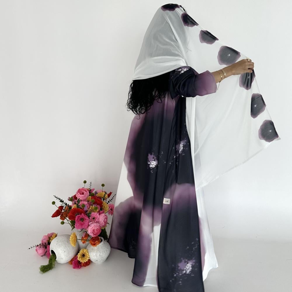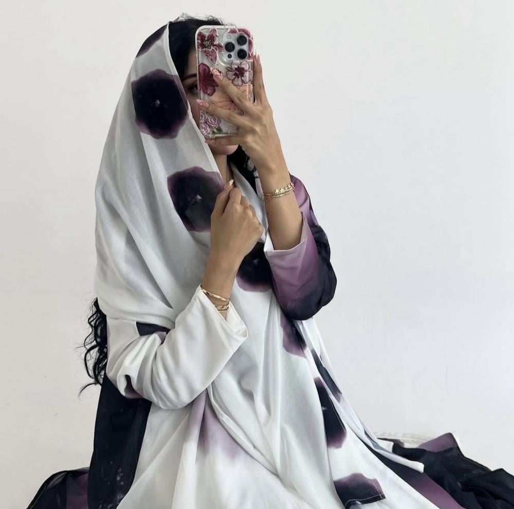 شيفون جورجيت ابيض طباعه | الكم ماسك | مبطنه بشيفون جورجيت ابيض خفيف | الطرحه شيفون جورجيت طباعه