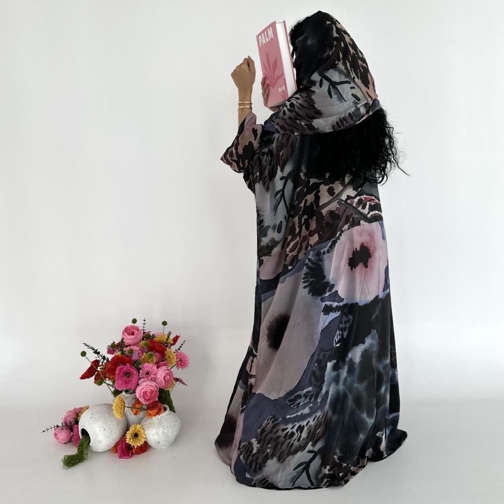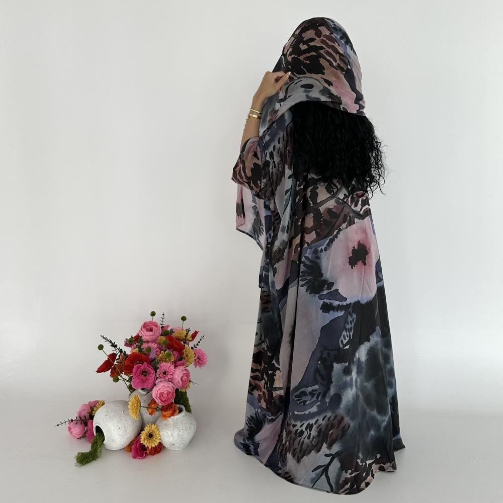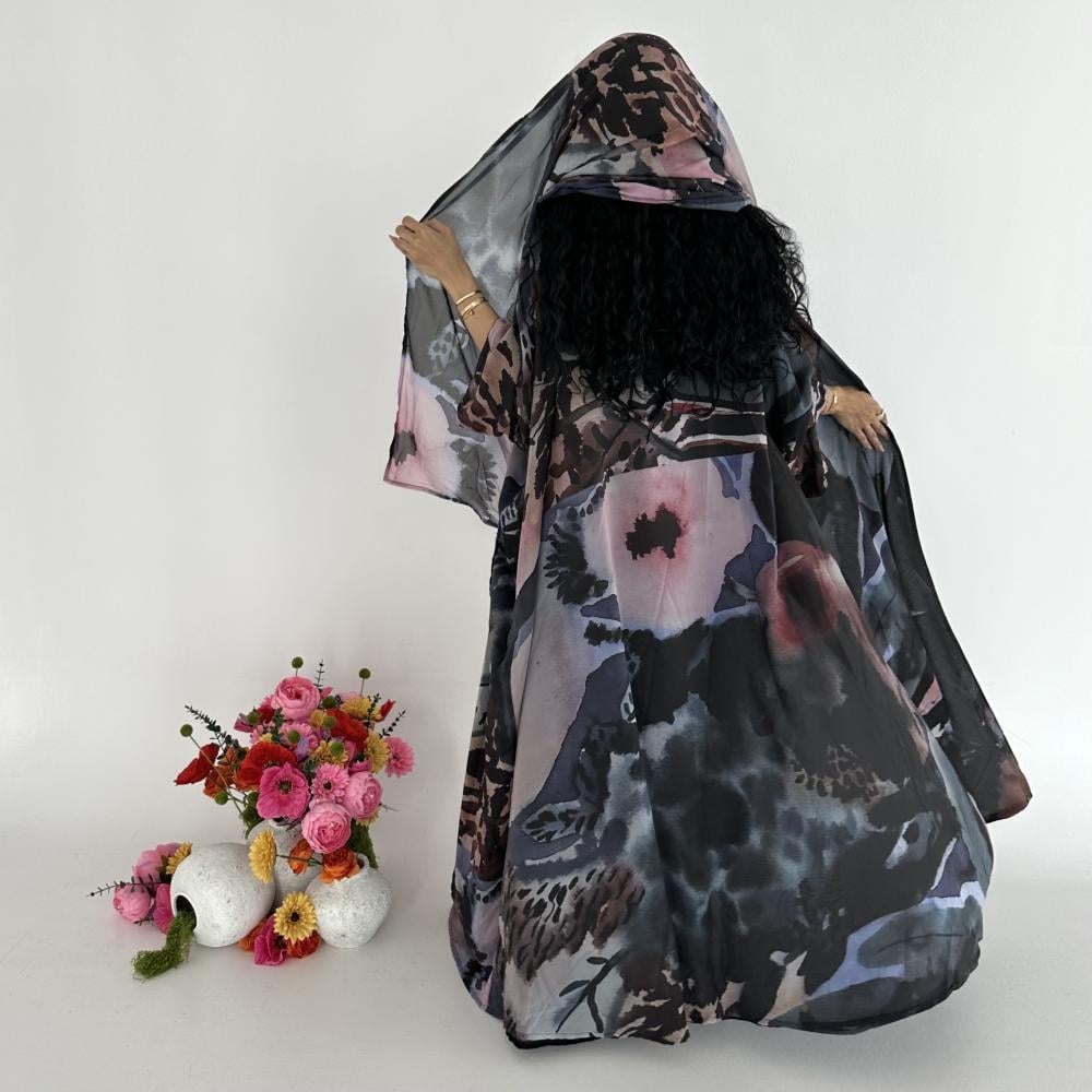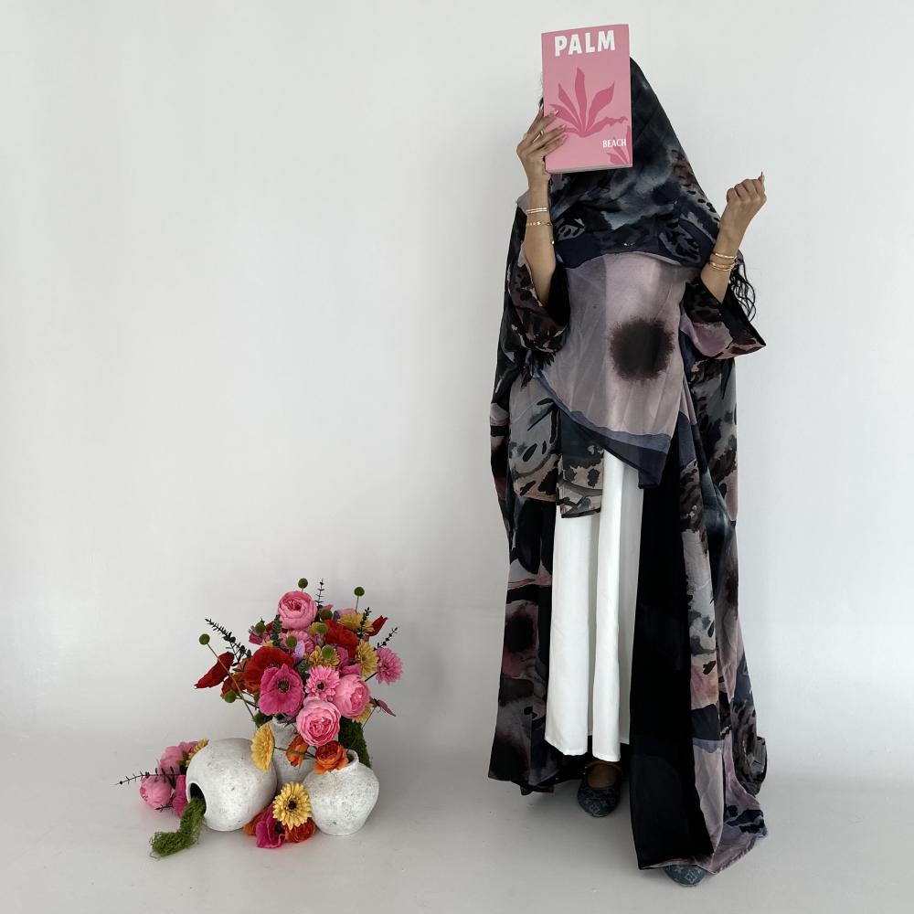 - شيفون اسود جورجيت طباعه | الكم واسع | مبطنه بقماش بلاك بيري اسود ناعم | الطرحه شيفون جورجيت طباعه