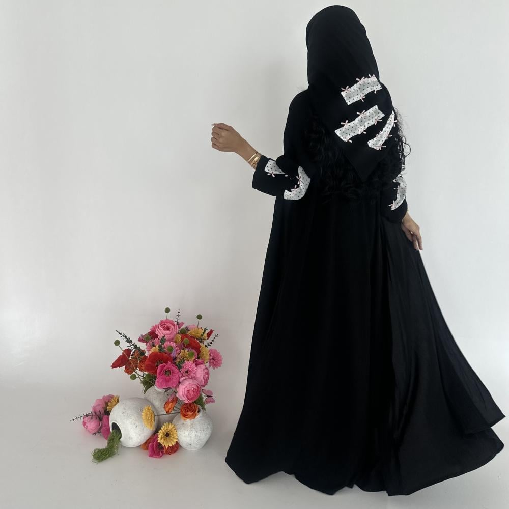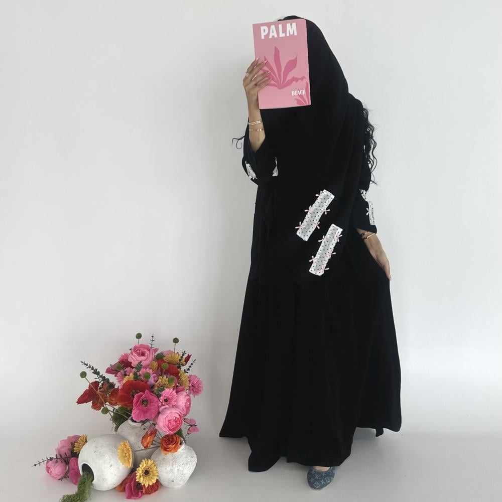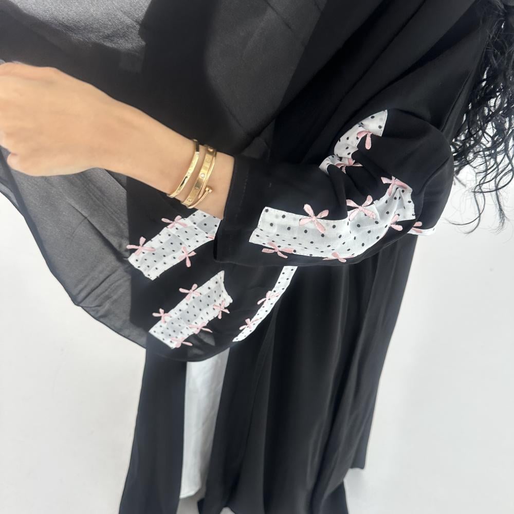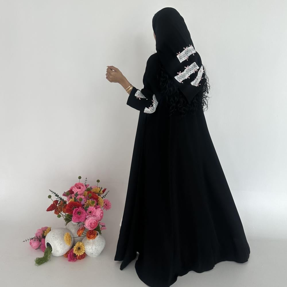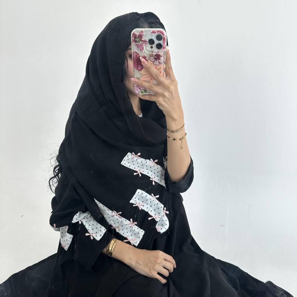 كريب ملكي اسود | الكم شيفون منقط ابيض بتطريز | الطرحه شيفون اسود بتطريز نفس الكم