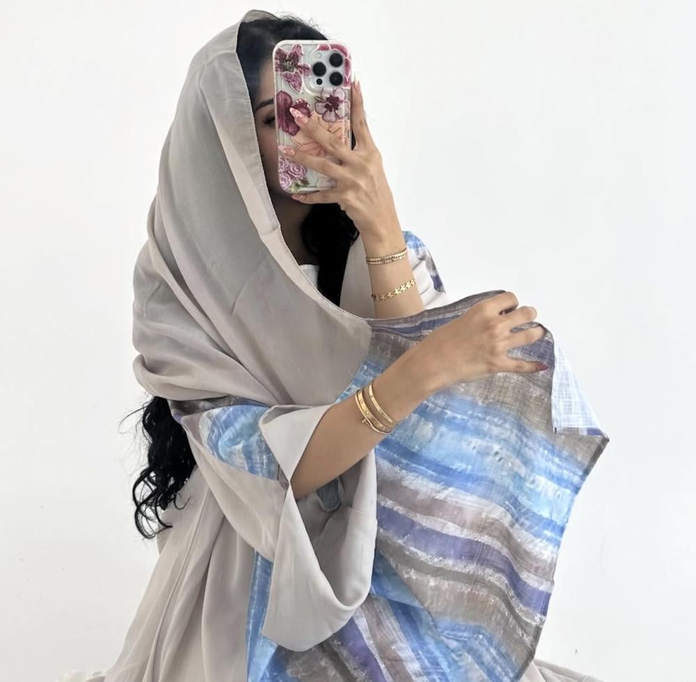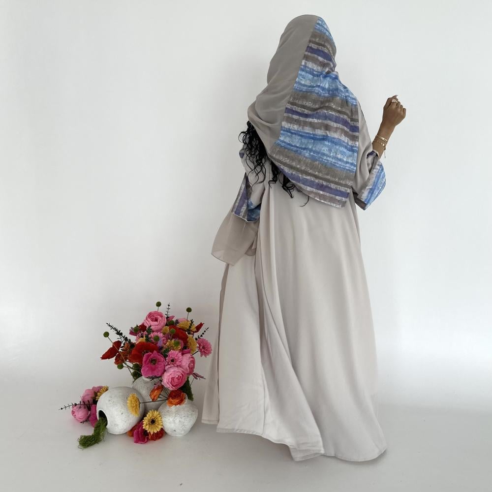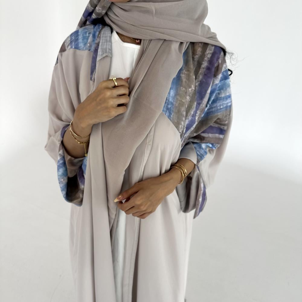 بلاك بيري بيج | الكم سفطه واسعه بفتحه ( الجهتين عكس من الداخل) | قماش لينن مخطط مموج من الامام | الطرحه شيفون بيج بطرف عريض لينن مموج
