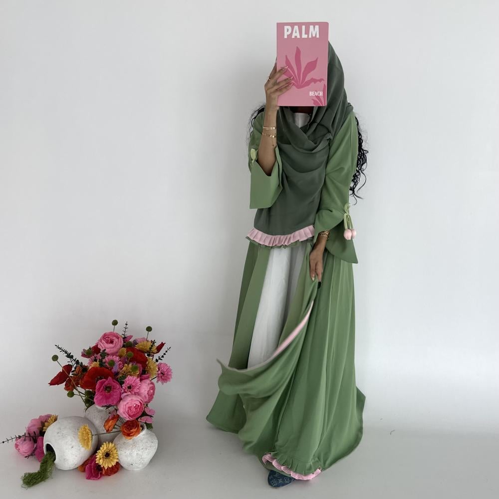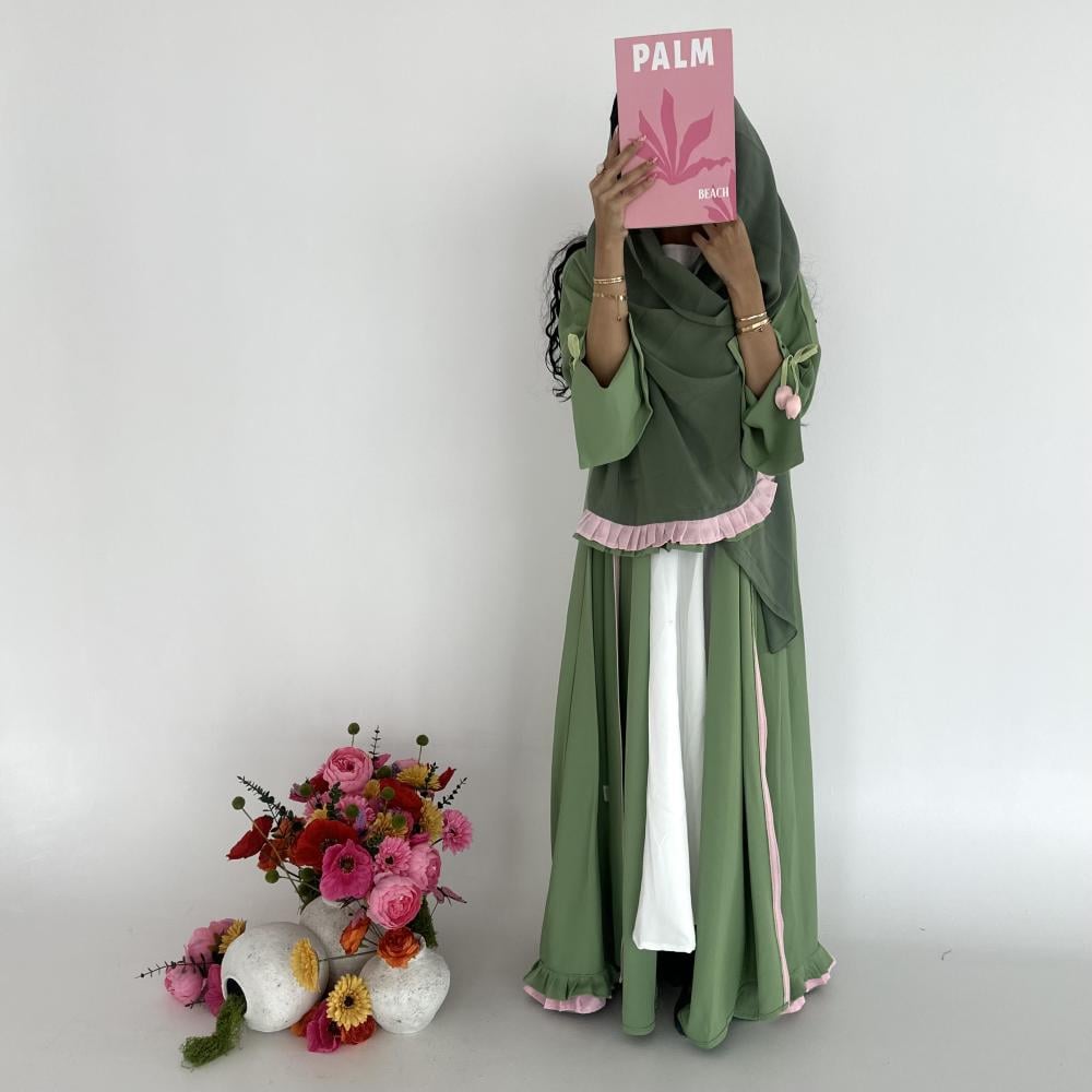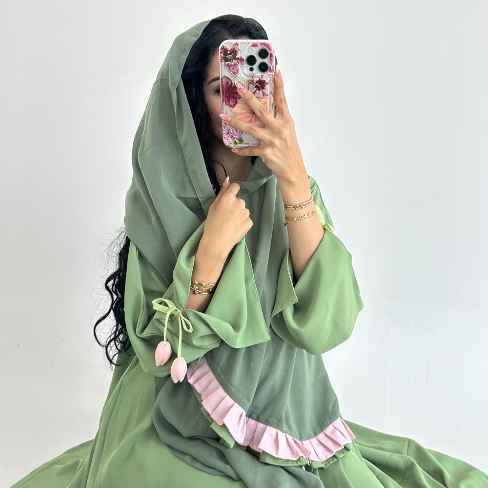 كريب كوري اخضر | الكم فتحه بكلفه مثبته ورد | كسرات من الجوانب ( طبقتين مكسره : وردي واخضر ) | الطرحه شيفون بطرف مكسر طبقتين وردي واخضر