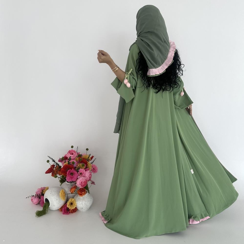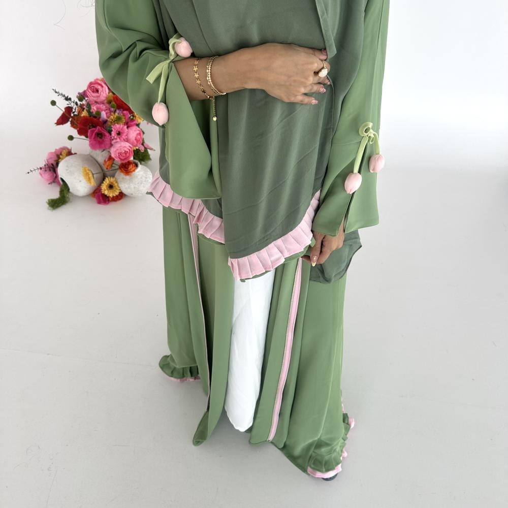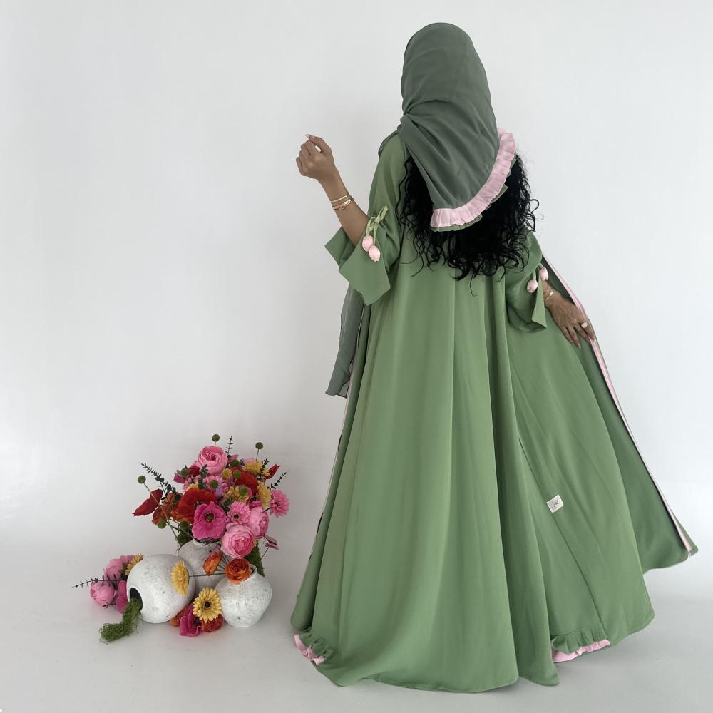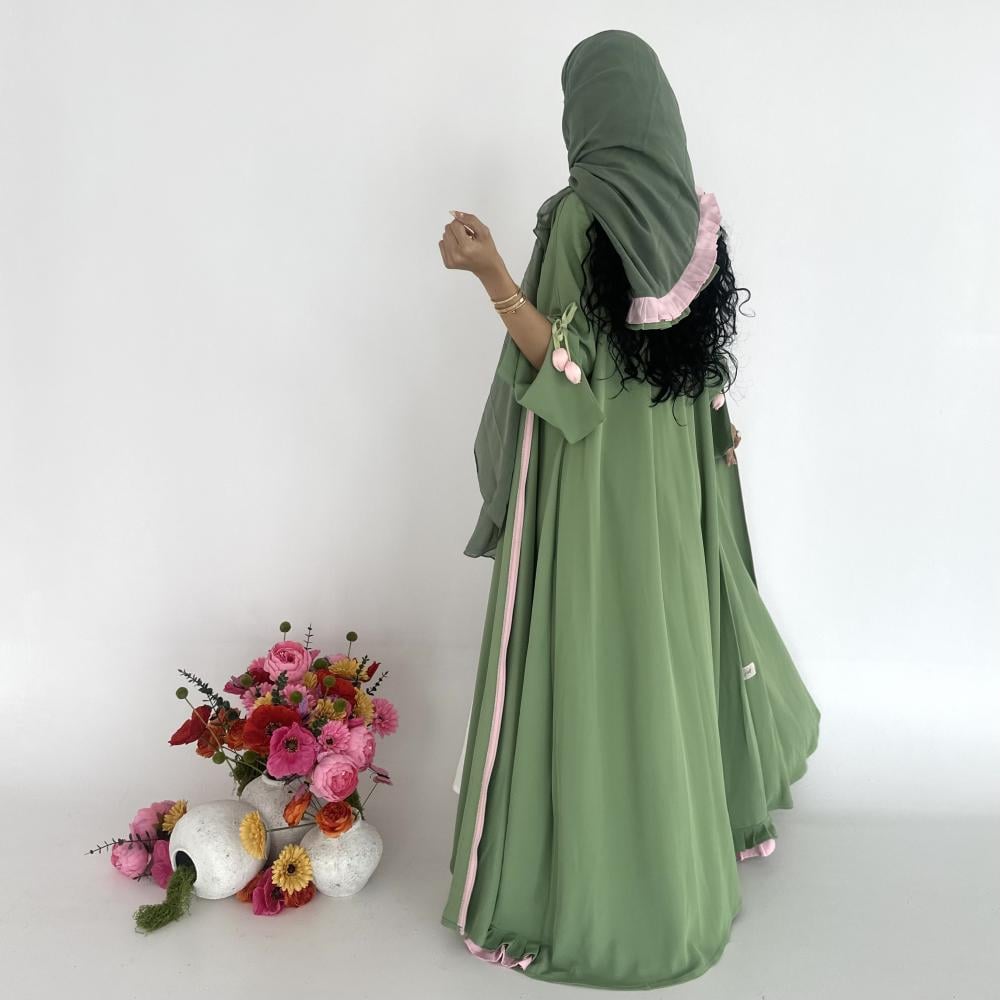 كريب كوري اخضر | الكم فتحه بكلفه مثبته ورد | كسرات من الجوانب ( طبقتين مكسره : وردي واخضر ) | الطرحه شيفون بطرف مكسر طبقتين وردي واخضر