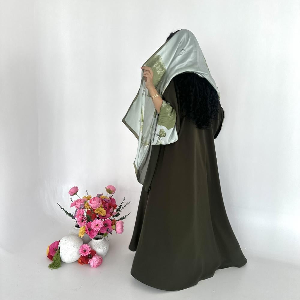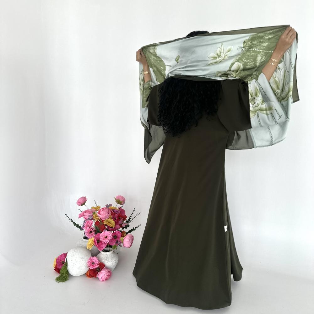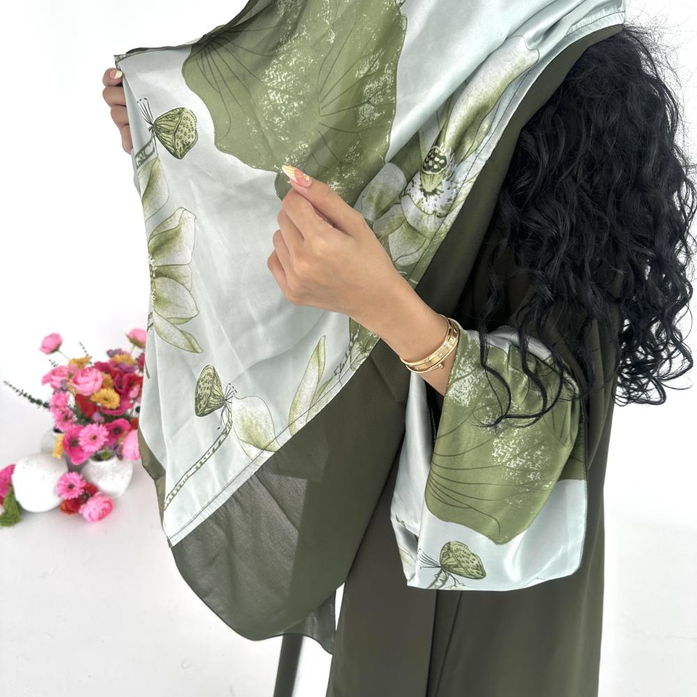 كريب اندويسي زيتي | الكم سفطه حرير مشجر | الطرحه شيفون نص طرحه ساده ونص حرير مشجر