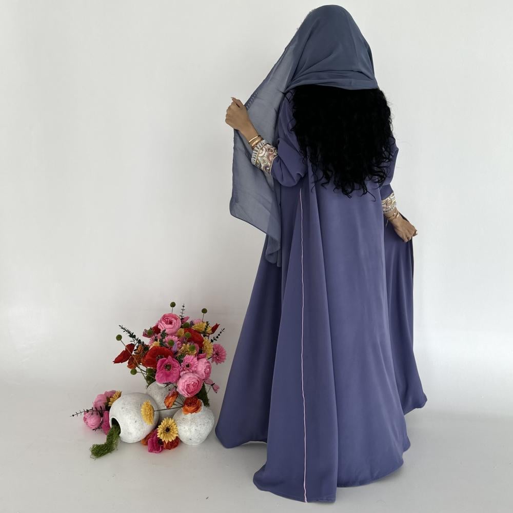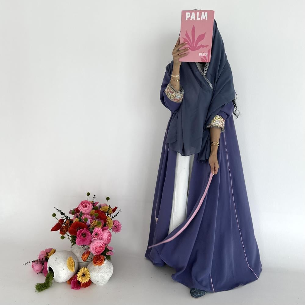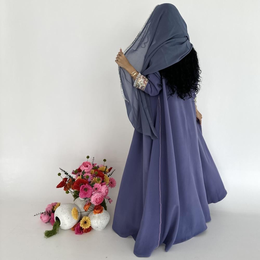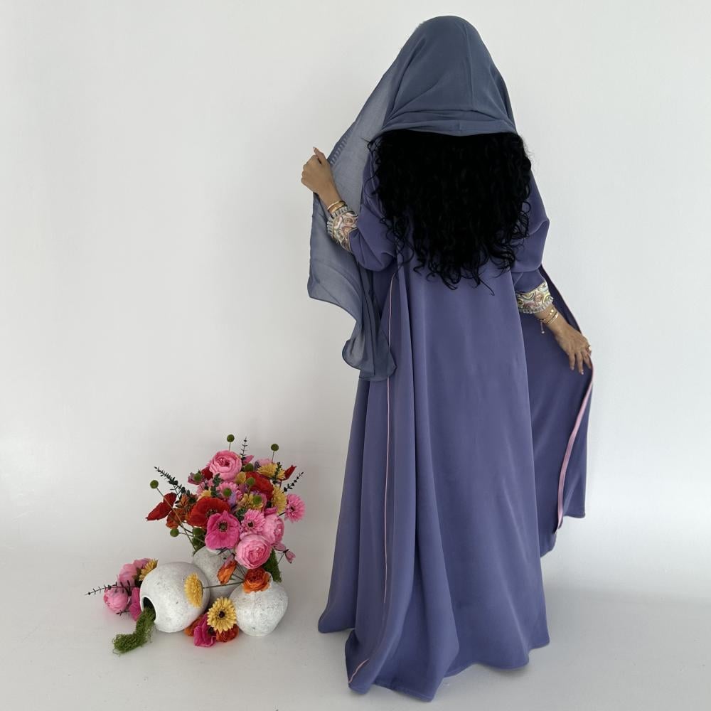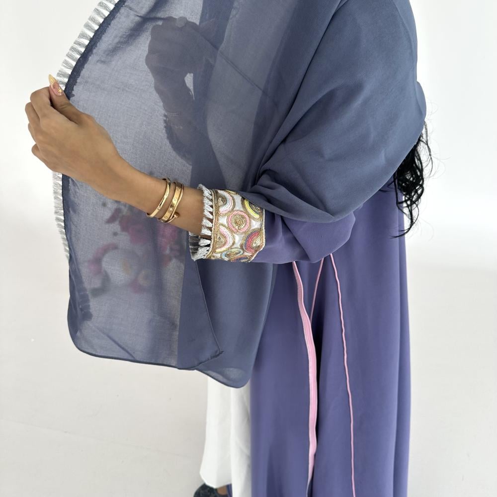 كريب كوري موف فاتح | الكم ماسك كلفه مطرزه بهدب رمادي | قيطان وردي كامل العبايه وكسرات | الطرحه شيفون بطرف هدب رمادي كامل